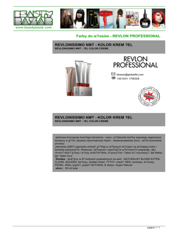 Farby do w?osów - REVLON PROFESSIONAL REVLONISSIMO NMT - KOLOR KREM ?EL REVLONISSIMO NMT - ?EL COLOR CREME [email protected] +39 0331 1706328 REVLONISSIMO NMT - KOLOR KREM ?EL REVLONISSIMO NMT - ?EL COLOR CREME jestnowa koncepcja trwa?ego barwienia : nano- cz?steczek bia?ka sojowego regeneracji keratyny w g??bi, ahydrat nanomolecola Hydro - betainanaskórek ikora ; dzi?ki kontrolera procesu utleniania (DMT) pigmenty wnikaj? g??biej w wi?kszych ilo?ciach na ja?niejszy kolor i bardziej wytrzyma?e. Wreszcie, od?ywcze i nawil?aj?ce w?a?ciwo?ci preparatu, aby chroni? skór? g?owy i w?osy zrobi?mi?kkie, b?yszcz?ce i ?atwo si? rozczesuj?, dla efektu, jak ?aden inny. Shades , dost?pny w 87 kolorach podzielonych na serii : NATURALNY BLOND EXTRA CLEAR, GOLDEN, be?owy, Golden Pearl, TYTO?, mied?, RED, bordowy, br?zowy, PEARL, iRise, popió?, popió? NATURAL & sbquo, Super Natural okno : 50 ml tube pagina 1 / 1 Powered by TCPDF (www.tcpdf.org)
