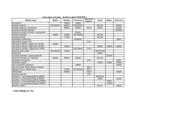 Ceny usług w zł/ godz. (brutto) na dzień 29.09.2016 r. Rodzaj usług bronowanie kombajn zbożowy kombajn zbożowy z sieczkarnią koszenie kukurydzy zielonka koszenie kukurydzy zielonka z transportem kosiarka rotacyjna kultywatorowanie opryskiwacz zawieszany opryskiwacz ciągany 21m orka pług 3 skibowy, ciągnik pow. 60 KM orka pług 4 skibowy, ciągnik pow. 60 KM orka pług 5 obrotowy, ciągnik pow. 60 KM prasa do zbioru słomy podorywka rozrzutnik obornika + cyklop zestaw 8t rozrzutnik obornika x2 + ładowacz rozsiewacz doczepiany rozsiewacz wapna siew siewnikiem zbożowym siew kukurydza, fasola, buraki (z siewem agregat czynny z siewem bezp. talerzowanie wałowanie wał 6m transport z 1 przyczepą(ciągnik do 60KM) transport z 2 przyczepami(ciąg do 60KM) transport z 1 przyczepą(ciągnik pow 60KM) transport z 2 przyczepami(ciąg pow 60KM) ładowacz cyklop * cena usługi za 1 ha Bytów Kartuzy Kościerzyna 250-300zł/h 100zł/h 360zł/h 390zł/h 120zł/h 270-300zł/h 300zł/h 120zł/h 140zł/h 110zł/h Nowy Dwór Gdański * 400 zł 840zł/h 150-180zł/h Tczew Sztum 290 zł/h 310zł/h Wejherowo 280zł/h 310zł/h 550zł/ha 190 zł/h 100 zł/h 50-80zł/h 45zł/h 55 zł 150zł/h 180zł/h 225zł/h 200-220zł/h 100-120zł/ha 170zł/h 300zł/h 390zł/h 180zł/h 240zł/h 270 zł 100-120 zł/h 225zł/h 237zł/h 320zł/h 350 zł/h 40 zł 140zł/h 80zł/h 150zł/h 210zł/h 180zł/h 180-200zł/ha 150 zł 240 zł 130 zł 50 zł 40zł/h 120zł/h 140zł/h 130zł/h 80-90 zł/h 100zł/h 100zł/h 90zł/h 100zł/h 90 zł/h 100zł/h