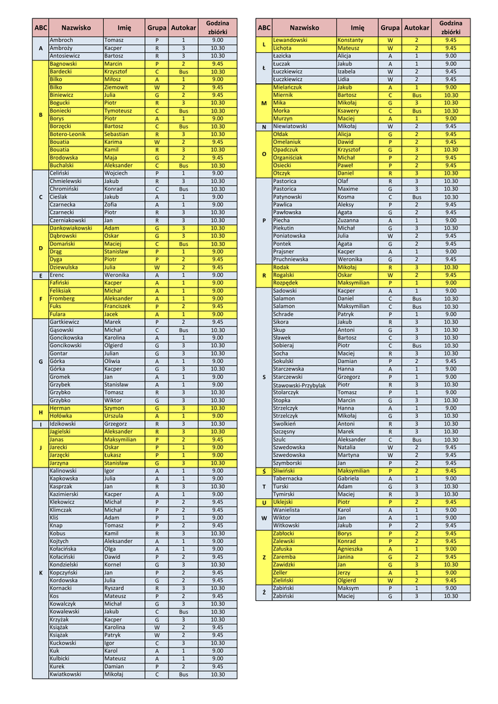 ABC A B C D E F G H I J K Nazwisko Ambroch Ambroży Antosiewicz Bagnowski Bardecki Bilko Bilko Biniewicz Bogucki Boniecki Borys Borzęcki Botero-Leonik Bouatia Bouatia Brodowska Buchalski Celiński Chmielewski Chromiński Cieślak Czarnecka Czarnecki Czerniakowski Dankowiakowski Dąbrowski Domański Drąg Dyga Dziewulska Erenc Fafiński Feliksiak Fromberg Fuks Fulara Gartkiewicz Gąsowski Goncikowska Goncikowski Gontar Górka Górka Gromek Grzybek Grzybko Grzybko Herman Hołówka Idzikowski Jagielski Janas Jarecki Jarzęcki Jarzyna Kalinowski Kapkowska Kasprzak Kazimierski Klekowicz Klimczak Kliś Knap Kobus Kojtych Kołacińska Kołaciński Kondzielski Kopczyński Kordowska Kornacki Kos Kowalczyk Kowalewski Krzyżak Książak Książak Kuckowski Kuk Kulbicki Kurek Kwiatkowski Imię Tomasz Kacper Bartosz Marcin Krzysztof Miłosz Ziemowit Julia Piotr Tymoteusz Piotr Bartosz Sebastian Karima Kamil Maja Aleksander Wojciech Jakub Konrad Jakub Zofia Piotr Jan Adam Oskar Maciej Stanisław Piotr Julia Weronika Kacper Michał Aleksander Franciszek Jacek Marek Michał Karolina Olgierd Julian Oliwia Kacper Jan Stanisław Tomasz Wiktor Szymon Urszula Grzegorz Aleksander Maksymilian Oskar Łukasz Stanisław Igor Julia Jan Kacper Michał Michał Adam Tomasz Kamil Aleksander Olga Dawid Kornel Jan Julia Ryszard Mateusz Michał Jakub Kacper Karolina Patryk Igor Karol Mateusz Damian Mikołaj Grupa Autokar P R R P C A W G R C A C R W R G C P R C A A R R G G C P P W A A A A P A P C A G G A G A A R G G A R R P P P G A A R A P P P P R A A P G P G R P G C G W W C A A P C 1 3 3 2 Bus 1 2 2 3 Bus 1 Bus 3 2 3 2 Bus 1 3 Bus 1 1 3 3 3 3 Bus 1 2 2 1 1 1 1 2 1 2 Bus 1 3 3 1 3 1 1 3 3 3 1 3 3 2 1 1 3 1 1 3 1 2 2 1 2 3 1 1 2 3 2 2 3 2 3 Bus 3 2 2 3 1 1 2 Bus Godzina zbiórki 9.00 10.30 10.30 9.45 10.30 9.00 9.45 9.45 10.30 10.30 9.00 10.30 10.30 9.45 10.30 9.45 10.30 9.00 10.30 10.30 9.00 9.00 10.30 10.30 10.30 10.30 10.30 9.00 9.45 9.45 9.00 9.00 9.00 9.00 9.45 9.00 9.45 10.30 9.00 10.30 10.30 9.00 10.30 9.00 9.00 10.30 10.30 10.30 9.00 10.30 10.30 9.45 9.00 9.00 10.30 9.00 9.00 10.30 9.00 9.45 9.45 9.00 9.45 10.30 9.00 9.00 9.45 10.30 9.45 9.45 10.30 9.45 10.30 10.30 10.30 9.45 9.45 10.30 9.00 9.00 9.45 10.30 ABC Nazwisko Lewandowski Lichota Łazicka Łuczak Ł Łuczkiewicz Łuczkiewicz Mielańczuk Miernik M Mika Morka Murzyn N Niewiatowski Ołdak Omelaniuk Opadczuk O Organiściak Osiecki Otczyk Pastorica Pastorica Patynowski Pawlica Pawłowska P Piecha Piekutin Poniatowska Pontek Prajsner Pruchniewska Rodak R Rogalski Rozpędek Sadowski Salamon Salamon Schrade Sikora Skup Sławek Sobieraj Socha Sokulski Starczewska S Starczewski Stawowski-Przybylak Stolarczyk Stopka Strzelczyk Strzelczyk Swolkień Szczęsny Szulc Szwedowska Szwedowska Szymborski Ś Śliwiński Tabernacka T Turski Tymirski U Uklejski Wanielista W Wiktor Witkowski Zabłocki Zalewski Załuska Z Zaremba Zawidzki Zeller Zieliński Żabiński Ż Żabiński L Imię Konstanty Mateusz Alicja Jakub Izabela Lidia Jakub Bartosz Mikołaj Ksawery Maciej Mikołaj Alicja Dawid Krzysztof Michał Paweł Daniel Olaf Maxime Kosma Aleksy Agata Zuzanna Michał Julia Agata Kacper Weronika Mikołaj Oskar Maksymilian Kacper Daniel Maksymilian Patryk Jakub Antoni Bartosz Piotr Maciej Damian Hanna Grzegorz Piotr Tomasz Marcin Hanna Mikołaj Antoni Marek Aleksander Natalia Martyna Jan Maksymilian Gabriela Adam Maciej Piotr Karol Jan Jakub Borys Konrad Agnieszka Janina Jan Jerzy Olgierd Maksym Maciej Grupa Autokar W W A A W W A C G C A W G P G P P R R G C P G A G W G A G R W P A C C P R G C C R P A P R P G A G R R C W W P P A G R P A A P P P A G G A W P G 2 2 1 1 2 2 1 Bus 3 Bus 1 2 2 2 3 2 2 3 3 3 Bus 2 2 1 3 2 2 1 2 3 2 1 1 Bus Bus 1 3 3 3 Bus 3 2 1 1 3 1 3 1 3 3 3 Bus 2 2 2 2 1 3 3 2 1 1 2 2 2 1 2 3 1 2 1 3 Godzina zbiórki 9.45 9.45 9.00 9.00 9.45 9.45 9.00 10.30 10.30 10.30 9.00 9.45 9.45 9.45 10.30 9.45 9.45 10.30 10.30 10.30 10.30 9.45 9.45 9.00 10.30 9.45 9.45 9.00 9.45 10.30 9.45 9.00 9.00 10.30 10.30 9.00 10.30 10.30 10.30 10.30 10.30 9.45 9.00 9.00 10.30 9.00 10.30 9.00 10.30 10.30 10.30 10.30 9.45 9.45 9.45 9.45 9.00 10.30 10.30 9.45 9.00 9.00 9.45 9.45 9.45 9.00 9.45 10.30 9.00 9.45 9.00 10.30