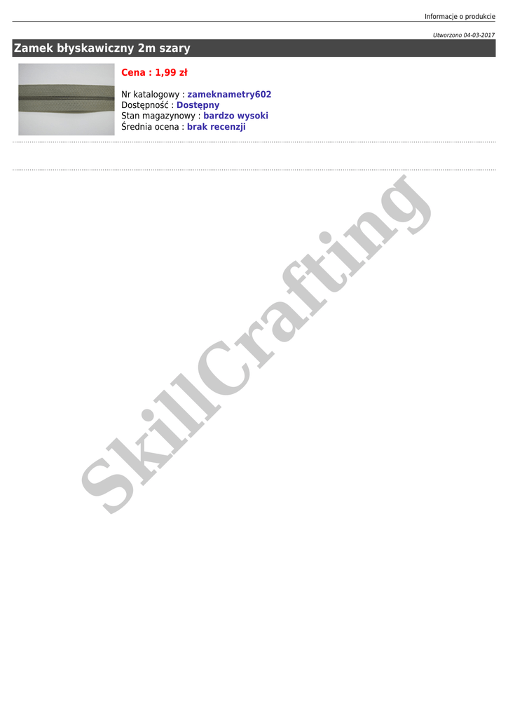 Informacje o produkcie Utworzono 04-03-2017 Zamek błyskawiczny 2m szary Cena : 1,99 zł Sk ill C ra ft in g Nr katalogowy : zameknametry602 Dostępność : Dostępny Stan magazynowy : bardzo wysoki Średnia ocena : brak recenzji