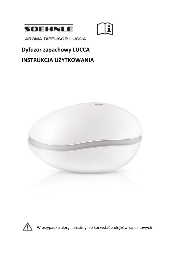 Dyfuzor zapachowy LUCCA INSTRUKCJA UŻYTKOWANIA W przypadku alergii prosimy nie korzystać z olejków zapachowych Zawartość opakowania 1 Dyfuzor zapachowy marki SOEHNLE, 1 zasilacz, 1 instrukcja obsługi Wskazówki właściwego użytkowania Dyfuzor zapachowy marki SOEHNLE jest przeznaczony wyłącznie do odświeżania powietrza w pomieszczeniach. Zalecamy korzystanie wyłącznie z olejków aromatycznych marki SOEHNLE. Prosimy zapoznać się z instrukcją dozowania umieszczoną na opakowaniu. Przed pierwszym użyciem urządzenia prosimy ważnie zapoznać się z niniejszą instrukcją. Urządzenie nie jest przeznaczone do użytku komercyjnego. Ważne • • Do urządzenia należy używać jednie oryginalnego zasilacza. Urządzenie nie może być obsługiwane przez osoby o ograniczonych zdolnościach psychofizycznych ani osoby, którym brak doświadczenia lub wiedzy, chyba że robią to pod nadzorem osoby odpowiedzialnej za ich bezpieczeństwo lub zostały szczegółowo poinstruowane w zakresie obsługi niniejszego urządzenia. Użytkowanie urządzenia przez dzieci dozwolone jest jedynie w przypadku, gdy ukończyły one osiem lat i robią to pod nadzorem osoby odpowiedzialnej za ich bezpieczeństwo lub zostały szczegółowo poinstruowane w zakresie obsługi niniejszego urządzenia. • • Nie należy napełniać urządzenia gorącą wodą (> 40°C). Z urządzenia należy korzystać jedynie w środowisku suchym. Prosimy upewnić się, że urządzenie nie jest zlokalizowane w pobliżu jednostki zasilającej.` • • • • Zasilacz należy podłączyć w taki sposób, aby uniknąć ryzyka przewrócenia się urządzenia i/ lub wylania się płynu. Nie należy zaciskać przewodu zasilającego ani narażać go na uszkodzenie o ostre kanty. Nie należy korzystać z urządzenia w pobliżu źródeł ciepła. W przypadku uszkodzenia zasilacza, wtyczki lub przewodu, nie należy korzystać z urządzenia. A. URUCHOMIENIE URZĄDZENIA Urządzenie należy wypełniać wodą dopiero po odłączeniu przewodu zasilającego ! 1. Usunąć górną część. 2. Napełnić wodą destylowaną do linii max (80 ml). 3. Dodać 1-2 krople olejku zapachowego SOEHNLE. Założyć pokrywę i upewnić się, że jest poprawnie osadzona. 4. Podłączyć zasilacz. 5. Ustawić urządzenie na równej powierzchni. 6. Włączyć urządzenie. Iluminacja Po łączeniu urządzenia kolory podświetlenia będą się zmieniały. Aby zatrzymać wybrany kolor, należy ponownie wcisnąć przycisk włączania. Kolejne wciśnięcie powoduje wyłączenie iluminacji. W celu wyłączenia urządzenia należy raz jeszcze wcisnąć przycisk. B. CZYSZCZENIE Ze względów higienicznych należy urządzenie czyścić przed każdym uzupełnieniem wodą lub przynajmniej co trzeci dzień. Przed rozpoczęciem czyszczenia trzeba odłączyć urządzenie od zasilania. 1. Wylać resztki wody. Nie używać w tym celu otworu wentylacyjnego! 2. Wytrzeć pojemnik na wodę ściereczką lub bawełnianymi wacikami. Nie używać ostrych ani żrących środków czystości. C. SPECYFIKACJA Wymiary: 96x124x168 mm Napięcie: 24V⎓ Moc wyjściowa: 10 W Pojemność zbiornika: 80ml Zasilacz: Model: GQ15-240050-AG Napięcie wejściowe: 100-240V~50/60Hz Max. 0.5A Napięcie wyjściowe: 24V⎓500mA ta=35°C lub Typ: NLB050240W1U3 Napięcie wejściowe: 100-240V~50/60Hz Max. 0.4A Napięcie wyjściowe: 11.5-24V⎓ 10-1200mA D. ROZWIĄZYWANIE PROBLEMÓW OBJAWY PROBLEM ROZWIĄZANIE Urządzenie nie jest Upewnij się, że urządzenie jest prawidłowo podłączone do podłączone do zasilania zasilania Zbyt mało wody w pojemniku Uzupełnij wodę do linii max Zbyt dużo wody w pojemniku Odlej nadmiar wody do poziomu max Górny element jest zapchany Przeczyść ściereczką Brak mgiełki