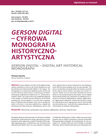digitalizacja w muzeach Muz., 2014(55): 127-131 Rocznik, eISSN 2391-4815 data przyjęcia – 05.2014 data akceptacji – 06.2014 DOI: 10.5604/04641086.1119777 GERSON DIGITAL – CYFROWA MONOGRAFIA HISTORYCZNOARTYSTYCZNA GERSON DIGITAL – DIGITAL ART HISTORICAL MONOGRAPH Tomasz Zaucha Muzeum Narodowe w Krakowie Abstract: Gerson Digital is the first of the digital monog- raphies published on-line by the Dutch Rijksbureau voor Kunsthistorische Dokumentatie (RKD) in The Hague. The monography is a revised and updated version of the now classical work by Horst Gerson, Ausbreitung und Nachwirkung der holländischen Malerei des 17. Jahrhunderts, Haarlem 1942). The scope of the so far published fragment is the chapter on Poland and the influences of the Dutch painting here. Gerson Digital is a very fine and scrupulous piece of editorial and translation work, but its novelty lies rather in the form: it has been published as a digital text interlaced with data (pictures, bibliography, person and artist indexes) that are drawn directly from vast databases which RKD has been building up for the past decades. The text is not therefore enclosed within the borders encircled by the author and his editors, but opens up to other resources. Reader may at some point abandon the text to follow an interesting thread by themselves. Gerson Digital clearly demonstrates the importance of databases for research in art history. Bibliographies, indexes, digital libraries, digital photo collections, and the like should no longer be understood as tools appropriate only for data storage and retrieval but also – and with time maybe primarily – as cornerstones of synthetic interpretation. Keywords: Netherlands, painting (fine arts), database, digitalization, electronic, editorial work. Quod felix, faustum, fortunatumque sit! Od życzeń wszelkiej pomyślności trzeba koniecznie zacząć, gdy pisze się o przedsięwzięciu, które ogłoszono w piątek 13 grudnia 2013 roku. Tego pogodnego dnia, w Rijksbureau voor Kunstistorische Dokumentatie (RKD), które ma swą siedzibę w komplek- www.muzealnictworocznik.com sie Biblioteki Królewskiej w Hadze, odbyła się prezentacja projektu Gerson Digital. Sympozjum otworzył ambasador Rzeczypospolitej w Holandii, dr Jan Borkowski. Po nim wystąpili m.in.: dyrektor RKD, prof. Chris Stolwijk, dr Gerdien Verschoor, dawna attaché kulturalna przy ambasadzie Kró- MUZEALNICTWO 55 127 lestwa Niderlandów w Warszawie, która przedstawiła słuchaczom bardzo przystępne wprowadzenie do historii naszego kraju, czy prof. Jacek Tylicki z Katedry Historii Sztuki i Kultury na Uniwersytecie Mikołaja Kopernika w Toruniu, z niezwykle erudycyjnym i bogatym w wiadomości wykładem. Ten „polski dzień” w RKD nie miał jednak żadnego związku z postacią Wojciecha Gersona, którego nazwisko jest pierwszym skojarzeniem, jakie nasuwa się historykom sztuki w Polsce. Poświęcony był dziełu wybitnego holenderskiego uczonego Horsta Gersona1, który w roku 1942 opublikował monografię pt. Ausbreitung und Nachwirkung der holländischen Malerei des 17. Jahrhunderts. Ta monumentalna praca nie dotyczy naturalnie wyłącznie naszego kraju, lecz zawiera omówienie wpływu, jaki na sztukę krajów całej Europy wywarło malarstwo holenderskie, przeżywające wtedy swój złoty okres. Okazją do zaakcentowania Polski (w tym szczególnie Gdańska), jako miejsca recepcji sztuki Niderlandów i miejsca pracy przybyszów stamtąd, stało się wznowienie książki Gersona. Jej wydawanie – tym razem w nietypowej formie – rozpoczęto właśnie od rozdziału dotyczącego naszego kraju. Nie leży w naszych kompetencjach zdolność do gruntownej oceny merytorycznej nowego wydania pracy Gersona; historycy sztuki specjalizujący się w zagadnieniach malarstwa holenderskiego z pewnością tej pozycji nie przeoczą i taką ocenę przedłożą. Wydało się nam konieczne zwrócenie uwagi na projekt Gerson Digital raczej z powodu drugiego członu jego nazwy, czyli słowa „digital”, jest to bowiem wydanie w postaci cyfrowej. Nie chodzi tu przy tym wyłącznie o to, że forma elektroniczna pozwala na dostęp do tekstu na dowolnym urządzeniu komputerowym i w dowolnym miejscu, o ile tylko dysponujemy łączem internetowym. To oczywiście ważne, bo z racji miejsca i daty wydania monografia Gersona była trudno dostępna, przynajmniej dla polskiego czytelnika2. Nie chodzi także i o to, że zamiast zwykłego przeskanowania oryginału i wywieszenia go w sieci otrzymaliśmy przekład na język angielski. To także jest, owszem, ważne, bo angielski stał się już sporo czasu temu pierwszym językiem historii sztuki, zastępując język niemiecki, a teraz jest także lingua franca wszystkich użytkowników Internetu. Istotne wydaje nam się raczej to, w jaki sposób twórcy Gerson Digital przygotowali cyfrową monografię, z jednej strony opartą na rdzeniu dawnego, klasycznego już tekstu, z drugiej korzystającą z obfitych zasobów sieciowych ujętych w struktury wielu baz danych. Pojawia się więc pytanie, ważne nie tylko dla badaczy dawnego malarstwa holenderskiego, czy to jest może próba stworzenia nowej formy dla monografii historyczno-artystycznych, nieco inna i bardziej zaawansowana niż zastąpienie zadrukowanej kartki papieru jej odpowiednikiem wyświetlonym na ekranie komputera? Monografia Horsta Gersona w swym nowym wcieleniu przekonuje, że tak. Dawny tekst jest bogato ilustrowany zdjęciami czerpanymi z fototeki RKD, opatrzony komentarzami poszerzającymi i uaktualniającymi zagadnienia poruszone przez autora, wreszcie zaopatrzony w przypisy, odpowiednio i jasno rozgraniczające pomiędzy literaturą wzmiankowaną przez Gersona a literaturą dodaną we wznowieniu. Lektura wywodu autora w postaci tekstu bogato okraszonego hiperlinkami wymaga wprawdzie dyscypliny, gdyż czytelnik kuszony jest otwierającymi się na każdym kroku dygresjami, wabią go wyróżnione barwą 128 MUZEALNICTWO 55 nazwiska,