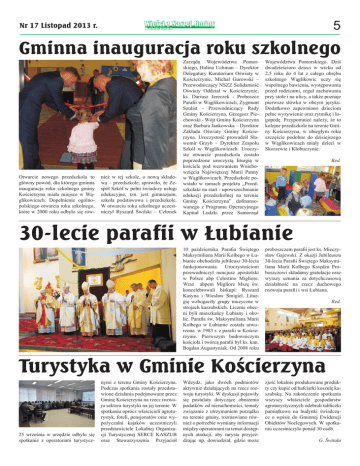Nr 17 Listopad 2013 r. 5 Wiesci z Naszej Gminy Koscierzyna Gminna inauguracja roku szkolnego Otwarcie nowego przedszkola to główny powód, dla którego gminna inauguracja roku szkolnego gminy Kościerzyna miała miejsce w Wąglikowicach. Dopełnienie ogólnopolskiego otwarcia roku szkolnego, które w 2000 roku odbyło się rów- nież w tej szkole, o nową składową – przedszkole, sprawiło, że Zespół Szkół w pełni świadczy usługi edukacyjne, tzn. jest gimnazjum, szkoła podstawowa i przedszkole. W otwarciu roku szkolnego uczestniczył Ryszard Świlski – Członek Zarządu Województwa Pomorskiego, Halina Uchman – Dyrektor Delegatury Kuratorium Oświaty w Kościerzynie, Michał Gurowski – Przewodniczący NSZZ Solidarność Oświaty Oddział w Kościerzynie, ks. Dariusz Jereczek - Proboszcz Parafii w Wąglikowicach, Zygmunt Szulist - Przewodniczący Rady Gminy Kościerzyna, Grzegorz Piechowski - Wójt Gminy Kościerzyna oraz Barbara Jankowska – Dyrektor Zakładu Oświaty Gminy Kościerzyna. Uroczystość prowadził Sławomir Grzyb – Dyrektor Zespołu Szkół w Wąglikowicach. Uroczyste otwarcie przedszkola zostało poprzedzone uroczystą liturgią w kościele pod wezwaniem Wniebowzięcia Najświętszej Marii Panny w Wąglikowicach. Przedszkole powstało w ramach projektu „Przedszkolaki na start - upowszechnianie edukacji przedszkolnej na terenie Gminy Kościerzyna” dofinansowanego z Programu Operacyjnego Kapitał Ludzki przez Samorząd Województwa Pomorskiego. Dziś dwadzieścioro dzieci w wieku od 2,5 roku do 4 lat z całego obrębu szkolnego Wąglikowic uczy się wspólnego bawienia, występowania przed rodzicami, reguł zachowania przy stole i na ulicy, a także poznaje pierwsze słówka w obcym języku. Dodatkowo zapewniono dzieciom pełne wyżywienie oraz rytmikę i logopedę. Przypomnieć należy, że to kolejne przedszkole na terenie Gminy Kościerzyna, w ubiegłym roku szczęście podobne do dzisiejszego w Wąglikowicach miały dzieci w Skorzewie i Kłobuczynie. Red. 30-lecie parafii w Łubianie 10 października Parafia Świętego Maksymiliana Marii Kolbego w Łubianie obchodziła jubileusz 30-lecia funkcjonowania. Uroczystościom przewodniczył nuncjusz apostolski w Polsce abp Celestino Migliore. Wraz abpem Migliore Mszę św. koncelebrowali biskupi: Ryszard Kasyna i Wiesław Śmigiel. Liturgię wzbogaciły grupy muzyczne w strojach kaszubskich. Licznie obecni byli mieszkańcy Łubiany i okolic. Parafia św. Maksymiliana Marii Kolbego w Łubianie została utworzona w 1983 r. z parafii w Kościerzynie. Pierwszym budowniczym kościoła i twórcą parafii był ks. kan. Bogdan Augustyniak. Od 2008 roku proboszczem parafii jest ks. Mieczysław Gajewski. Z okazji Jubileuszu 30-lecia Parafii Świętego Maksymiliana Marii Kolbego Księdzu Proboszczowi składamy gratulacje oraz wyrazy uznania za dotychczasową działalność na rzecz duchowego rozwoju parafii i wsi Łubiana. Red. Turystyka w Gminie Kościerzyna 25 września w urzędzie odbyło się spotkanie z operatorami turystycz- nymi z terenu Gminy Kościerzyna. Podczas spotkania zostały przedstawione działania podejmowane przez Gminę Kościerzyna na rzecz rozwoju sektora turystyki na jej terenie. W spotkaniu oprócz właścicieli agroturystyk, foteli, pensjonatów oraz wypożyczalni kajaków uczestniczyli przedstawiciele Lokalnej Organizacji Turystycznej SERCE KASZUB oraz Stowarzyszenia Przyjaciół Wdzydz, jako dwóch podmiotów aktywnie działających na rzecz rozwoju turystyki. W dyskusji pojawiły się postulaty dotyczące obniżenia podatków od nieruchomości, tematy związanie z utrzymaniem porządku na terenie gminy, rozmawiano również o potrzebie wymiany informacji między operatorami na temat dostępnych atrakcji, aby turysta przyjeżdżając np. dowiedział, gdzie może zjeść lokalnie produkowane produkty czy kupić od hafciarki koszulę kaszubską. Na zakończenie spotkania wszyscy właściciele gospodarstw agroturystycznych odebrali tabliczki pamiątkowe na budynki świadczące o wpisie do Gminnej Ewidencji Obiektów Noclegowych. W spotkaniu uczestniczyło ponad 30 osób. G. Świtała 6 Wiesci z Naszej Gminy Koscierzyna Nr 17 Listopad 2013 r. Ciekawa oferta dla dzieci i młodzieży Ruszyły zajęcia rekreacyjno-kulturalne na terenie Gminy Kościerzyna. Ośrodek Kultury i Edukacji w Nowym Klinczu w swojej ofercie ma następujące zajęcia: nauka gry na gitarze, zajęcia fotograficzne, zajęcia taneczne oraz muzykowanie w Orkiestrze Dętej Gminy Kościerzyna. Natomiast w budynku PKP w Łubianie amatorzy aktywnego wypoczynku wraz z instruktorem spotykają się co tygodniowo na zajęciach Nordic Walking, najmłodsi mogą roz- wijać swoje talenty na zajęciach plastycznych prowadzonych pod okiem instruktora. G. Daszkowski Środki pozyskane ze źródeł zewnętrznych 1. 30 września br. Gmina Kościerzyna złożyła kolejny wniosek o dofinansowanie przebudowy dróg gminnych ze środków Narodowego Programu Przebudowy Dróg Lokalnych Etap II Bezpieczeństwo – Dostępność – Rozwój. Gminny projekt noszący nazwę „Modernizacja dróg gminnych nr 187088G, 187091G i 187092G w Nowym Klinczu” planowany jest do realizacji w 2014 roku. Planowane do przebudowy drogi łączą się ze sobą oraz każda z osobna z drogą wojewódzką nr 221. Całkowita długość modernizowanych dróg to 1544,46 m. Na całej długości przebudowywanych dróg pojawią się oprócz poszerzonej jezdni asfaltowej także chod- niki oraz czytelne oznakowanie. Dodatkowo znaczny fragment dróg uzbrojony zostanie w kanalizację deszczową. Dokumentacja kosztorysowa opiewa na kwotę niecałych 3.000.000 zł, a maksymalne możliwe dofinansowanie z Programu wynosi do 50%. Pierwsze wstępne informacje o wynikach tegorocznego konkursu pojawią się na stronie internetowej Pomorskiego Urzędu Wojewódzkiego do 31 października tego roku. 2. Gmina Kościerzyna przystąpiła do realizacji projektu ”Budowa Centrum Usług Turyst