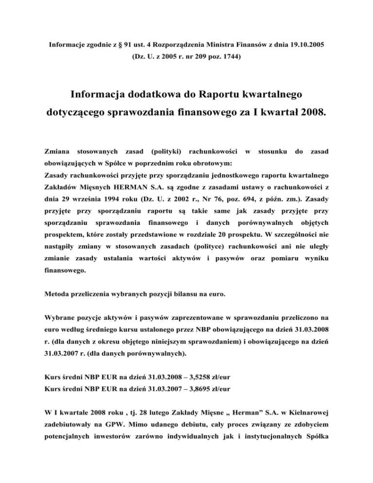 Informacje zgodnie z § 91 ust. 4 Rozporządzenia Ministra Finansów z dnia 19.10.2005 (Dz. U. z 2005 r. nr 209 poz. 1744) Informacja dodatkowa do Raportu kwartalnego dotyczącego sprawozdania finansowego za I kwartał 2008. Zmiana stosowanych zasad (polityki) rachunkowości w stosunku do zasad obowiązujących w Spółce w poprzednim roku obrotowym: Zasady rachunkowości przyjęte przy sporządzaniu jednostkowego raportu kwartalnego Zakładów Mięsnych HERMAN S.A. są zgodne z zasadami ustawy o rachunkowości z dnia 29 września 1994 roku (Dz. U. z 2002 r., Nr 76, poz. 694, z późn. zm.). Zasady przyjęte przy sporządzaniu raportu są takie same jak zasady przyjęte przy sporządzaniu sprawozdania finansowego i danych porównywalnych objętych prospektem, które zostały przedstawione w rozdziale 20 prospektu. W szczególności nie nastąpiły zmiany w stosowanych zasadach (polityce) rachunkowości ani nie uległy zmianie zasady ustalania wartości aktywów i pasywów oraz pomiaru wyniku finansowego. Metoda przeliczenia wybranych pozycji bilansu na euro. Wybrane pozycje aktywów i pasywów zaprezentowane w sprawozdaniu przeliczono na euro według średniego kursu ustalonego przez NBP obowiązującego na dzień 31.03.2008 r. (dla danych z okresu objętego niniejszym sprawozdaniem) i obowiązującego na dzień 31.03.2007 r. (dla danych porównywalnych). Kurs średni NBP EUR na dzień 31.03.2008 – 3,5258 zł/eur Kurs średni NBP EUR na dzień 31.03.2007 – 3,8695 zł/eur W I kwartale 2008 roku , tj. 28 lutego Zakłady Mięsne „ Herman” S.A. w Kielnarowej zadebiutowały na GPW. Mimo udanego debiutu, cały proces związany ze zdobyciem potencjalnych inwestorów zarówno indywidualnych jak i instytucjonalnych Spółka ocenia jako wyjątkowo nieudany, gdyŜ planowana do pozyskania (przed rozpoczęciem publicznej emisji akcji) kwota 20 mln zł, została zweryfikowana w trakcie prowadzonej emisji do 13,5 mln zł, a w rezultacie złej sytuacji na rynkach akcji Spółka pozyskała tylko 1.905.249,60 zł w drodze emisji 1.058.472 szt akcji, które zostały objęte przez 257 nowych akcjonariuszy. Struktura własności akcji w chwili obecnej przedstawia się następująco: Posiadacz akcji seria Rodzaj akcji Liczba Udział w Liczba Udz. W akcji kapitale głosów na ogólnej zakładowym Walnym liczbie Zgromadzeniu głosów na WZ (%) Przedsiębiorstwo A,B,C Imienne Produkcyjno Uprzywilejowane Handlowe J. i imienne zwykłe 13.953.000 92,92 25.645.614 96,01 1.500 0,01 2.757 0,01 1.500 0,01 2757 0,01 1.500 0,01 2757 0,01 13.957.500 92,95 25.653.885 96,04 1.058.472 1.058.472 3,96 Fiejdasz i Wspólnicy Spółka Jawna Janusz Fiejdasz A,B,C Imienne Uprzywilejowane i imienne zwykłe Marian A,B,C Imienne Mirosław Uprzywilejowane i imienne zwykłe Sławomir Ruszel A,B,C Imienne Uprzywilejowane i imienne zwykłe Razem A,B,C Imienne Uprzywilejowane i imienne zwykłe Pozostali akcjonariusze D Zwykłe na okaziciela 7,05 W związku z tym, Ŝe Spółka osiągnęła z emisji zdecydowanie mniej środków niŜ zaplanowała, w Raporcie BieŜącym nr 14 przedstawiła zweryfikowane prognozy finansowo-handlowe na lata 2008-2009 oraz cele na które zostaną przeznaczone środki pozyskane z publicznej emisji akcji. W I kwartale 2008 r. Spółka uzyskała przychody ze sprzedaŜy na poziomie 14.781 tys. zł. przy poniesionych kosztach 15.357 tys.zł i osiągnęła stratę ze sprzedaŜy na poziomie 631 tys.zł., oraz stratę z działalności gospodarczej w kwocie - 576 tys. zł. W okresie sprawozdawczym poniesiono nakłady inwestycyjne w wysokości 133 tys.w tym między innymi zakupiono 2 samochody Skoda Fabia na wartość 81 tys. i nadziewarkę próŜniową Handman w wysokości 48 tys. W okresie sprawozdawczym Spółka dokonała spłaty rat kredytu inwestycyjnego oraz poŜyczek w wysokości 2.112 tys. zł w tym spłaty kredytu inwestycyjnego w wysokości 170 tys. i spłaty zaciągniętej poŜyczki w wysokości 500 tys. zł Pozostałe rozszerzone informacje finansowe zostały zawarte w załączonym kwartalnym sprawozdaniu finansowym sporządzonym zgodnie z przepisami ustawy o rachunkowości. Pierwszy kwartał kaŜdego roku jest dla branŜy mięsnej nie najlepszym okresem, a I kwartał 2008 r. był wyjątkowo trudny: mocna złotówka i duŜa presja na wzrost wynagrodzeń, to główne aspekty trudności. Średnio o 6,9% wzrosły ceny Ŝywności w Polsce, ale przyrost ten jest głównie podyktowany nie cenami samych produktów rolnych ale rosnącymi kosztami pracy, energii, transportu, rosnącym oprocentowaniem kredytów, brakiem uruchomionych programów pomocowych na modernizacje i inwestycje. W I półroczu 2008 r. przewidywany jest dalszy 5% wzrost cen Ŝywności głównie z powodu wspomnianych juŜ wyŜszych kosztów pozasurowcowych. Analitycy szacują, Ŝe popyt na Ŝywność będzie mniejszy niŜ w ubiegłym roku gdyŜ nie będzie juŜ duŜych podwyŜek płac - firmy nie będzie juŜ na nie stać. Spółka posiada stale rozwijającą się sieć sklepów firmowych - w I kwartale 2008 r. Spółka otworzyła dwa kolejne sklepy. Pomimo okresu świątecznego i mimo pozytywnej dynamiki obrotów do analogicznego okresu roku ubiegłego, nie bez znaczenia na rentowność prowadzonej działalności jest polityka duŜych sieci handlowych przyciągających klientów róŜnymi programami lojalnościowymi typu talony umoŜliwiając klientom kompleksowe zakupy. Spółka w m-cu marcu 2008 r. wydzierŜawiła lokal i poniosła nakłady na jego remont i modernizację lokalu przeznaczeniem na hurtownię firmową w Tychach. Zatrudniono personel i kupiono samochody osobowe dla przedstawicieli handlowych. Planowane uruchomienie w m-cu kwietniu. ZM Herman S.A. dokonał zwiększonych zakupów surowca w okresie luty i początek marca poniewaŜ w marcu nastąpił wzrost cen Ŝywca z 3,21 zł/kg do 3,65 zł/kg. Zaznaczył się równieŜ wzrost cen elementów mięsnych np.: szynki b/k o około 4,9%, łopatki b/k o około 4% mięsa wieprzowego dr