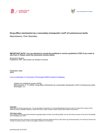 Drug efflux mechanism by a secondary transporter LmrP of Lactococcus lactis Mazurkiewicz, Piotr Stanislaw IMPORTANT NOTE: You are advised to consult the publisher's version (publisher's PDF) if you wish to cite from it. Please check the document version below. Document Version Publisher's PDF, also known as Version of record Publication date: 2004 Link to publication in University of Groningen/UMCG research database Citation for published version (APA): Mazurkiewicz, P. S. (2004). Drug efflux mechanism by a secondary transporter LmrP of Lactococcus lactis Groningen: s.n. Copyright Other than for strictly personal use, it is not permitted to download or to forward/distribute the text or part of it without the consent of the author(s) and/or copyright holder(s), unless the work is under an open content license (like Creative Commons). Take-down policy If you believe that this document breaches copyright please contact us providing details, and we will remove access to the work immediately and investigate your claim. Downloaded from the University of Groningen/UMCG research database (Pure): http://www.rug.nl/research/portal. For technical reasons the number of authors shown on this cover page is limited to 10 maximum. Download date: 04-03-2017 Chapter 7 Podsumowanie Drobnoustroje w środowisku naturalnym poddane są działaniu różnorodnych związków toksycznych, np. alkaloidów pochodzenia roślinnego, soli żółciowych, wielu antybiotyków, jak i toksyn produkowanych przez człowieka np. rozpuszczalników organicznych, różnorodnych barwników czy też syntetycznych leków. Rysunek 1. Mechanizmy oporności na leki. Opis w tekście. Powszechna obecność toksyn zmusiła mikroorganizmy do rozwinięcia mechanizmów zapewniających im oporność na szkodliwe substancje (Rys. 1). Wśród nich można wyróżnić (A) produkcję specjalnych enzymów modyfikujących lub rozkładających substancje toksyczne, (B) modyfikację struktur komórkowych będących celem leku w taki sposób, że lek przestaje z nimi oddziaływać, (C) zmianę struktur otaczających komórkę w celu uniemożliwienia wniknięcia leku, (D) produkcję specjalnych białek transporterowych zlokalizowanych w błonie otaczającej komórkę, które wypompowują toksyczne substancje z komórki. LmrP jest przykładem takiego transportera usuwającego z komórek wiele różnych nieporządanych związków chemicznych. Białko to jest obecne w komórkach bakterii Lactococcus lactis, mikroorganizmu powszechnie używanego w przemyśle mleczarskim m.in. do produkcji serów. LmrP jest zbudowane z 408 aminokwasów, specjalnych związków chemicznych będących podstawowym budulcem wszystkich białek. 103 Chapter 7 Rysunek 2. Schemat ilustruje topologię LmrP w błonie komórkowej. Aminokwasy są oznaczone kodem jednoliterowym. Segmenty transbłonowe są ponumerowane od 1 do 12. Łańcuch aminokwasów jest zlokalizowany w błonie komórkowej – cienkiej strukturze zbudowanej z tłuszczy (lipidów), oddzielającej wnętrze komórki od środowiska. LmrP przecina błonę 12 razy (Rys. 2). 12 regionów białka znajdujących się w obrębie błony określanych jest terminem segmentów transbłonowych, segmenty te są połączone pętlami, wyłaniającymi się z błony w kierunku środowiska zewnętrznego komórki (pętle zewnętrzne) lub wnikające do wnętrza komórki, cytoplazmy (pętle cytoplazmatyczne). LmrP rozpoznaje niezwykle dużą liczbę związków organicznych o różnorodnych strukturach chemicznych. Te rozpoznawane i transportowane przez transporter substancje zwane są substratami. Transport toksyn odbywa się kosztem energii pochodzącej z przemiany materii zachodzącej w komórce. Jednym z rodzajów energii używanych przez komórkę jest tak zwany gradient protonowy, czyli różnica stężeń protonów po obu stronach błony otaczającej komórkę. Protony wypompowywane są na zewnątrz komórki przez specjalne białka (pompy protonowe) kosztem energii zgromadzonej w związkach chemicznych. Z powodu bariery jaką stanowi błona komórkowa, wypompowane protony powracają do komórki bardzo powoli, dzięki temu tworzy się gradient protonowy – wyższe stężenie protonów na zewnątrz niż wewnątrz komórki. Protony mogą wejść do komorki także za pośrednictwem licznych białek obecnych w błonie, jednym z nich jest LmrP. Powracający za pośrednictwem LmrP proton powoduje zmianę struktury tego białka, która umożliwia 104 Podsumowanie równoczesne wypompowanie z komórki toksycznego związku. Ilość protonów wymienianych na cząsteczkę substratu jest stała dla danego transportera. Co więcej, proton może przepłynąć przez LmrP tylko w obecności substratu, dzięki temu energia zgromadzona w postaci gradientu protonowego nie jest zużywana pod nieobecność substratów. Te cechy transportu są określane terminem „sprzężenie”. Rysunek 3. W konformacji „I” miejsce wiązania substratów zwrócone jest w kierunku cytoplazmy. Dwa aminkwasy, uczestniczące w wiązaniu pozytywnie naładowanych protnów (H+) i substratów (S) oznaczone literami „D” i „E” są pozbawione protonów i przez to negatywnie naładowane. W tej konformacji LmrP wiąże substraty, co powoduje zmianę w strukturze LmrP i reorientację miejsca wiązania substratów w taki sposób, że staje się ono eksponowane do środwiska zewnątrzkomórkowego „II”. W tej konformacji aminokwasy „D” i „E” przyłączają protony co powoduje uwolnienie substratu na zewnątrz komórki. LmrP z przyłączonymi protonami powraca do konformacji w której miejsce wiązania substratów jest zwrócone do cytoplazmy „III”, następuje uwolnienie protonów do cytoplazmy i białko jest gotowe do następnego cyklu transportu. Substraty transportowane przez LmrP to związki organiczne o dodatnim ładunku, łatwo rozpuszczalne w lipidach, dlatego też gromodzą się w błonach lipidowych otaczających komórki. Te właściwości substrtów by