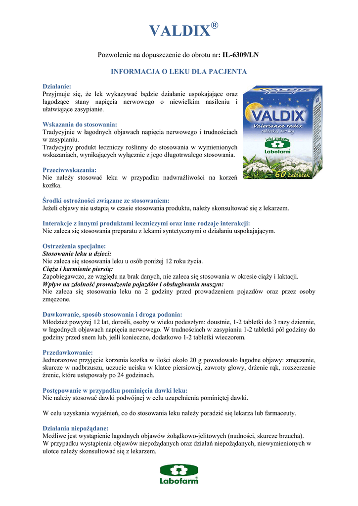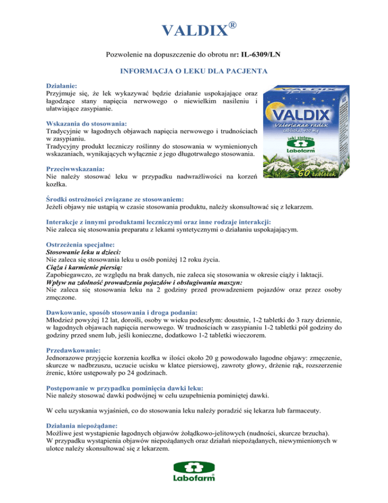 VALDIX® Pozwolenie na dopuszczenie do obrotu nr: IL-6309/LN INFORMACJA O LEKU DLA PACJENTA Działanie: Przyjmuje się, że lek wykazywać będzie działanie uspokajające oraz łagodzące stany napięcia nerwowego o niewielkim nasileniu i ułatwiające zasypianie. Wskazania do stosowania: Tradycyjnie w łagodnych objawach napięcia nerwowego i trudnościach w zasypianiu. Tradycyjny produkt leczniczy roślinny do stosowania w wymienionych wskazaniach, wynikających wyłącznie z jego długotrwałego stosowania. Przeciwwskazania: Nie należy stosować leku w przypadku nadwrażliwości na korzeń kozłka. Środki ostrożności związane ze stosowaniem: Jeżeli objawy nie ustąpią w czasie stosowania produktu, należy skonsultować się z lekarzem. Interakcje z innymi produktami leczniczymi oraz inne rodzaje interakcji: Nie zaleca się stosowania preparatu z lekami syntetycznymi o działaniu uspokajającym. Ostrzeżenia specjalne: Stosowanie leku u dzieci: Nie zaleca się stosowania leku u osób poniżej 12 roku życia. Ciąża i karmienie piersią: Zapobiegawczo, ze względu na brak danych, nie zaleca się stosowania w okresie ciąży i laktacji. Wpływ na zdolność prowadzenia pojazdów i obsługiwania maszyn: Nie zaleca się stosowania leku na 2 godziny przed prowadzeniem pojazdów oraz przez osoby zmęczone. Dawkowanie, sposób stosowania i droga podania: Młodzież powyżej 12 lat, dorośli, osoby w wieku podeszłym: doustnie, 1-2 tabletki do 3 razy dziennie, w łagodnych objawach napięcia nerwowego. W trudnościach w zasypianiu 1-2 tabletki pół godziny do godziny przed snem lub, jeśli konieczne, dodatkowo 1-2 tabletki wieczorem. Przedawkowanie: Jednorazowe przyjęcie korzenia kozłka w ilości około 20 g powodowało łagodne objawy: zmęczenie, skurcze w nadbrzuszu, uczucie ucisku w klatce piersiowej, zawroty głowy, drżenie rąk, rozszerzenie źrenic, które ustępowały po 24 godzinach. Postępowanie w przypadku pominięcia dawki leku: Nie należy stosować dawki podwójnej w celu uzupełnienia pominiętej dawki. W celu uzyskania wyjaśnień, co do stosowania leku należy poradzić się lekarza lub farmaceuty. Działania niepożądane: Możliwe jest wystąpienie łagodnych objawów żołądkowo-jelitowych (nudności, skurcze brzucha). W przypadku wystąpienia objawów niepożądanych oraz działań niepożądanych, niewymienionych w ulotce należy skonsultować się z lekarzem. VALDIX® Przechowywanie leku: Przechowywać w zamkniętym opakowaniu, w temperaturze nie wyższej niż 25°C, w miejscu niedostępnym i niewidocznym dla dzieci. Nie należy stosować leku po upływie terminu ważności. Skład leku: korzeń kozłka (Valerianae radix) - 400 mg Jedna tabletka zawiera nie mniej niż 0,32 mg kwasów walerenowych. Podmiot odpowiedzialny: Laboratorium Farmaceutyczne Labofarm Sp. z o.o. Sp. k. ul. Lubichowska 176 b 83-200 Starogard Gd. tel. 58 561 20 08 fax 58 561 20 16 e-mail: [email protected] Data zatwierdzenia tekstu ulotki: 31.05.2011