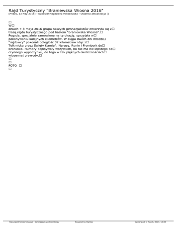 Rajd Turystyczny "Braniewska Wiosna 2016" (Friday, 13 May 2016) - Nadesłał Magdalena Hołubowska - Ostatnia aktualizacja () W dniach 7-8 maja 2016 grupa naszych gimnazjalistów zmierzyła się z trasą rajdu turystycznego pod hasłem "Braniewska Wiosna". Pogoda, specjalnie zamówiona na tę okazję, sprzyjała w pokonywaniu kolejnych kilometrów. W ciągu dwóch dni młodzi "rajdowcy" pokonali odległość 32 kilometrów idąc z Tolkmicka przez Święty Kamień, Narusę, Ronin i Frombork do Braniewa. Humory dopisywały wszystkim, bo nie ma nic lepszego od czynnego wypoczynku, do tego w tak pięknych okolicznościach wiosennej przyrody. FOTO http://gimfrombork.boo.pl - Gimnazjum we Fromborku Powered by Mambo Generated: 4 March, 2017, 12:23