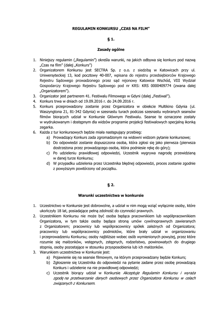 REGULAMIN KONKURSU „CZAS NA FILM” § 1. Zasady ogólne 1. Niniejszy regulamin („Regulamin”) określa warunki, na jakich odbywa się konkurs pod nazwą „Czas na film” (dalej „Konkurs”) 2. Organizatorem Konkursu jest SECTRA Sp. z o.o. z siedzibą w Katowicach przy ul. Uniwersyteckiej 13, kod pocztowy 40-007, wpisana do rejestru przedsiębiorców Krajowego Rejestru Sądowego prowadzonego przez sąd rejonowy Katowice Wschód, VIII Wydział Gospodarczy Krajowego Rejestru Sądowego pod nr KRS: KRS 0000409774 (zwana dalej „Organizatorem”). 3. Organizator jest partnerem 41. Festiwalu Filmowego w Gdyni (dalej „Festiwal”). 4. Konkurs trwa w dniach od 19.09.2016 r. do 24.09.2016 r. 5. Konkurs przeprowadzony zostanie przez Organizatora w obiekcie Multikino Gdynia (ul. Waszyngtona 21, 81-342 Gdynia) w szesnastu turach podczas szesnastu wybranych seansów filmów biorących udział w Konkursie Głównym Festiwalu. Seanse te oznaczone zostały w wydrukowanym i dostępnym dla widzów programie projekcji festiwalowych specjalną ikonką zegarka. 6. Każda z tur konkursowych będzie miała następujący przebieg: a) Prowadzący Konkurs zada zgromadzonym na widowni widzom pytanie konkursowe; b) Do odpowiedzi zostanie dopuszczona osoba, która zgłosi się jako pierwsza (pierwsza dostrzeżona przez prowadzącego osoba, która podniesie rękę do góry); c) Po udzieleniu prawidłowej odpowiedzi, Uczestnik wygrywa nagrodę przewidzianą w danej turze Konkursu; d) W przypadku udzielenia przez Uczestnika błędnej odpowiedzi, proces zostanie zgodnie z powyższym powtórzony od początku. § 2. Warunki uczestnictwa w konkursie 1. Uczestnictwo w Konkursie jest dobrowolne, a udział w nim mogą wziąć wyłącznie osoby, które ukończyły 18 lat, posiadające pełną zdolność do czynności prawnych. 2. Uczestnikiem Konkursu nie może być osoba będąca pracownikiem lub współpracownikiem Organizatora, w tym także osoby będące stroną umów cywilnoprawnych zawieranych z Organizatorem; pracownicy lub współpracownicy spółek zależnych od Organizatora; pracownicy lub współpracownicy podmiotów, które brały udział w organizowaniu i przeprowadzeniu Konkursu; osoby najbliższe wobec osób wymienionych powyżej, przez które rozumie się małżonków, wstępnych, zstępnych, rodzeństwo, powinowatych do drugiego stopnia, osoby pozostające w stosunku przysposobienia lub ich małżonków. 3. Warunkiem uczestnictwa w Konkursie jest: a) Pojawienie się na seansie filmowym, na którym przeprowadzany będzie Konkurs; b) Zgłoszenie się Uczestnika do odpowiedzi na pytanie zadane przez osobę prowadzącą Konkurs i udzielenie na nie prawidłowej odpowiedzi; c) Uczestnik biorący udział w Konkursie Akceptuje Regulamin Konkursu i wyraża zgodę na przetwarzanie danych osobowych przez Organizatora Konkursu w celach związanych z Konkursem. § 3. Nagrody i sposób ich przyznania 1. Zwycięzca Konkursu zostanie wyłoniony przez Organizatora wyłącznie spośród osób, które zgłoszą się do udzielenia odpowiedzi. 2. Zwycięzca to osoba, która jako pierwsza udzieli prawidłowej odpowiedzi na zadane pytanie konkursowe. 3. Nagrodami w Konkursie są zegarki marki Atlantic (model 62341.41.61 oraz model 29034.44.21). 4. Zwycięzca nie może przenieść praw do odebrania przyznanej nagrody na osoby trzecie. Nagrody nie podlegają wymianie na gotówkę lub innego rodzaju świadczenia. § 4. Reklamacje 1. Wszelkie reklamacje Uczestników dotyczące Konkursu, Uczestnik może zgłosić drogą e-mailową na adres [email protected] lub złożyć na piśmie na adres: SECTRA Sp. z o.o. ul. Uniwersytecka 13, 40-007 Katowice, z dopiskiem "Czas na film", w terminie do 14 (czternastu) dni od dnia zakończenia Konkursu. 2. O zachowaniu terminu do wniesienia reklamacji decyduje data maila lub stempla pocztowego. 3. Reklamacja powinna zawierać dane uczestnika: imię, nazwisko, adres korespondencyjny, adres e-mail oraz przyczynę reklamacji wraz z jej uzasadnieniem. 4. Organizator dołoży najwyższych starań, aby reklamacje były rozpatrzone w terminie 14 (czternastu) dni od dnia ich otrzymania. Uczestnik zostanie powiadomiony o rozpatrzeniu reklamacji niezwłocznie za pośrednictwem poczty elektronicznej, na adres e-mail podany w zgłoszeniu reklamacyjnym lub pocztą. § 5. Ochrona danych osobowych 1. Zwycięzca zobowiązuje się do podania swojego imienia, nazwiska oraz adresu e-mail w celach związanych z Konkursem. 2. Dane osobowe Uczestników Konkursu będą przetwarzane zgodnie z przepisami ustawy z dnia 29 sierpnia 1997r. o ochronie danych osobowych (tekst jednolity: Dz. U. z 2002r. Nr 101, poz. 926 z późn. zm.) na potrzeby przeprowadzenia Konkursu, wyłonienia zwycięzców, wydania nagród. 3. Administratorem danych osobowych jest Organizator. Dane mogą być powierzone do przetwarzania podmiotom działającym na zlecenie Organizatora, w związku z Konkursem. 4. Udostępnienie danych osobowych przez Uczestników jest dobrowolne, jednakże jest niezbędne w celu wzięcia udziału w Konkursie, w tym do otrzymania nagrody. Uczestnik ma prawo dostępu do treści swoich danych oraz do ich poprawiania na warunkach określonych w ustawie o ochronie danych osobowych. § 6. Postanowienia końcowe 1. Uczestnik biorąc udział w Konkursie potwierdza, że jest świadomy, iż o wygranej nagrodzie nie decyduje przypadek lecz działanie Uczestnika. 2. Przystąpienie do Konkursu jest równoznaczne z akceptacją przez Uczestnika warunków Konkursu określonych w Regulaminie. Uczestnik zobowiązuje się do przestrzegania określonych w nim zasad, jak również potwierdza, iż spełnia wszystkie warunki, które uprawniają go do udziału w Konkursie. 3. Nagrody w Konkursie zostaną wydane zgodnie z przepisami ustawy z dnia 26 lipca 1991 roku o podatku dochodowym od osób fizycznych (tj. Dz. U. z 2012r., poz. 361) tj. z uwzględnieniem wpłacenia przez Organizatora kwoty podatku w wysokości 10% wartości całej nagr