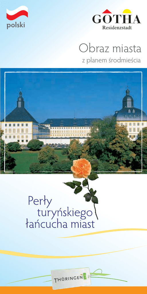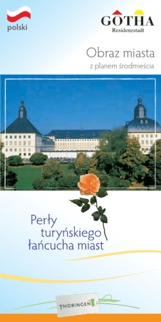 polski Obraz miasta z planem środmieścia Historia miasta strona 4 Historia szlachty w Gocie strona 6 Zamek Friedenstein strona 8 Zabytki i plan miasta strona 10 wycieczki z przewodnikiem strona 16 Imprezy kulturalne strona 20 Wycieczki rowerowe po okolicy strona 21 Cele wycieczek i mapa okolicy strona 22 Tourist-Information Gotha / Gothaer Land, Hauptmarkt 33, 99867 Gotha, Tel. +49 (0)3621 5078570, Fax: / 507857-20, E-mail: [email protected] Impressum: Adres wydawniczy: wibego-service-gmbh / Tourist-Information, Opracowanie: K&K Werbung GmbH, Druk: Colordruckzwickau, Mapy: Müller & Richert GbR, Zdjęcia: Tourist-Information Gotha, Thüringer Tourismus GmbH, K&K Werbung GmbH, Stiftung Schloss Friedenstein, Stadtverwaltung, Olaf Ittershagen, Lutz Ebhardt, Barbara Neumann Styczeń 2008, nakład 1.000 Stück 2 Serdecznie witamy i zapraszamy do odkrywania pięknych zabytków atrakcyjnego miasta Gota (Gotha). róza "Gotha" Gota znajduje się w zielonym sercu Niemiec, w Turyngii i jest miastem mającym wyjątkową atmosferę łączącą historię i przyszłość. Nie na darmo była miastem – rezydencją i stolicą księstwa Sachsen-Coburg i Gotha. Miasto naznaczone wyjątkową przeszłością ma niepowtarzalną atmosferę. Historyczne centrum i zamek Friedenstein, największy wczesnobarokowy kompleks zamkowy w Niemczech wraz z parkiem, stały się symbolami miasta i równocześnie miejscami pełnymi uroku. Gości zachwyca rozległy park w angielskim stylu, Oranżeria, zamek Friedenstein, muzeum książęce - dzisiejsze Muzeum Natury i wreszcie imponujące domy mieszczańskie. Niezależnie od tego, czy odkrywa się miasto samemu czy z przewodnikiem, jego bogata przeszłość jest do dziś doskonale widoczna. 3 Historia i wybitne osobisto „Villa Gotaha“ Villa Gotaha wpisała się na karty historii w r. 775 aktem darowizny Karola Wielkiego, króla Franków jako jedno z najstarszych osiedli Turyngii. Właśnie przez Villa Gotaha – „osiedle przy dobrej wodzie” – wiodła „Hohe Strasse”, jedna z najważniejszych dróg handlowych, łącząca wschód z zachodem. Gota posiada prawa miejskie od XII wieku. Miasto wraz z zamkiem obronnym zapewniło sobie ważną pozycję jako rezydencja Landgrafów Turyńskich. Średniowiecze Dzięki swemu korzystnemu położeniu średniowieczna Gota przeobraziła się w jeden z najbardziej znaczących ośrodków handlowych Turyngii. Korzystny oblęzenie zamku Grimmenstein 1567 zarobek zapewnił mieszczaństwu handel urzetem barwierskim, rośliną z której uzyskuje się niebieski barwnik. Wspaniałe domy mieszczańskie znajdujące się na głównym Rynku dają do dziś świadectwo dobrobytu tamtej epoki. W historię miasta wpisały się też znaczące osobistości. Oprócz reformatorów Kościoła Martina Lutra i Fryderyka Myconiusa w Gocie działał również pedagog Andeas Reyher, którego „Gothaer Schulmetodus” stał się jednym z pierwszych regulaminów szkolnych w Niemczech. Gota ok. 1738, autorstwa Matthaeusa Seuttera 4 ści miasta -rezydencji XVIII i XIX wiek „Miasto nauk przyrodniczych i sztuki” – taki przydomek otrzymała Gota z powodu zasług w tych właśnie dziedzinach kultury. Oprócz geologa i podróżnika- odkrywcy Karla Ernsta Adolfa von Hoffa (1771-1837) działali w Gocie astronomowie Baron Franz Xaver von Zach (1754-1832), Johann Franz Encke (1791-1865) i Peter Andreas Hansen (1795-1874). domy mieszczańskie na Pogórzu Zamkowym (Schlossberg) Aż do roku 1943 w wydawnictwie geograficznym założonym w 1785 przez Justusa Perthesa ukazywał się Gocki kalendarz szlachecki, znany na całym świecie jako “Gotha”. Dzięki mapom i atlasom drukowanym również w tym wydawnictwie obraz naszej planety nabrał nowych barw. Kupiec Ernst Wilhelm Arnoldi (1778 – 1841) założył w Gocie pierwsze w Niemczech firmy ubezpieczeniowe, od 1820 r. oferowano w nich polisę od ognia, a od 1827 r. także polisę na życie. W 1826 roku Joseph Meyer założył istniejący do dziś Instytut Bibliograficzny, jedno z największych niemieckich wydawnictw encyklopedycznych, publikujące m.in. znany Leksykon Uniwersalny Meyera. Do wzrostu międzynarodowego znaczenia miasta przyczyniły się wybitne osobistości takie jak: kompozytorzy Gottfried Heinrich Stötzel (1690 - 1749) i Louis Spohr (1784 – 1859), filolog Friedrich Jakobs (1764 - 1847), rzeźbiarz Friedrich Wilhelm Doell (1750 - 1816), poeta i pisarz Friedrich Wilhelm Gotter (1746 - 1817), geolog Ernst Friedrich von Schlotheim (1764 - 1832), twórca nowoczesnej paleontologii Johann Gottfried Geissler (1726 - 1800), wreszcie historyk i ojciec kalamburów profesorskich Johann Georg August Galletti (1750 - 1828). Autorstwa tego ostatniego jest np. zdanie: „Suwarow miał zwyczaj najpierw pobić wroga a dopiero potem rozpoznać jego pozycję”. 5 Historia miasta W Gocie odbywały się także ważne kongresy. W hali miejskiej założono w 1861 roku „Niemiecki Związek Strzelecki”, a w r.1875 Partie Pracy Ferdinanda Lassalle’a i Augusta Bebela połączyły się w „Niemiecką Socjalistyczną Partię Pracy”. Gotha stała się również ważnym ośrodkiem przemysłu spożywczego oraz produkcji maszyn, pojazdów i wagonów. Mieściła się tu nawet fabryka samolotów. Z tego czasu pochodzą też ciekawe rozwiązania architekoniczne na granicy Starego Miasta, w dzielnicach powstałych w okresie zwanym „Gründerzeit”. [okres rozkwitu gospodarczego w latach 1871 – 1914 w Niemczech, przyp.tłum.] Po ciężkich doświadczeniach i zniszczeniach podczas drugiej wojny światowej nastał dla Goty czas odbudowy. W latach 1950 - 1990 miasto zmieniło znacznie swoje oblicze, a na jego obrzeżach powstały nowe dzielnice mieszkaniowe. Historia szlachty w Gocie Dynastia Sachsen-Coburg i Gotha o wiele trwalej, niż wszystkie wojny „podbiła” europejskie trony. Z tego rodu w męskiej linii pochodzą bezpośrednio królowie Belgii, Portugalii, Bułgarii i Wielkiej Brytanii. Potomkowie księżnic