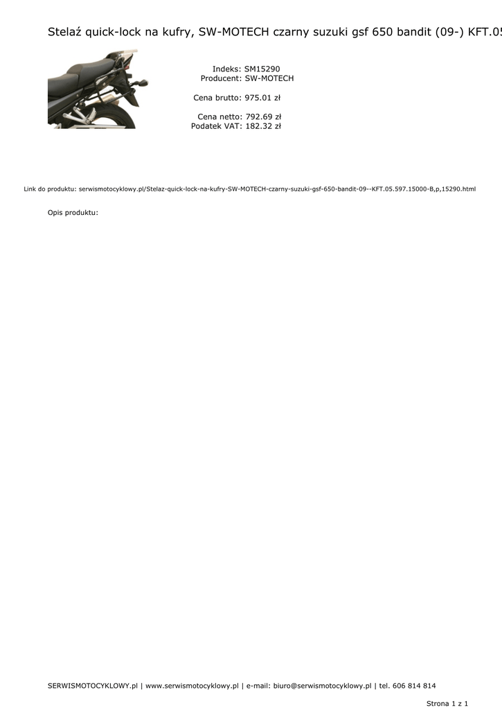 Stelaź quick-lock na kufry, SW-MOTECH czarny suzuki gsf 650 bandit (09-) KFT.05 Indeks: SM15290 Producent: SW-MOTECH Cena brutto: 975.01 zł Cena netto: 792.69 zł Podatek VAT: 182.32 zł Link do produktu: serwismotocyklowy.pl/Stelaz-quick-lock-na-kufry-SW-MOTECH-czarny-suzuki-gsf-650-bandit-09--KFT.05.597.15000-B,p,15290.html Opis produktu: SERWISMOTOCYKLOWY.pl | www.serwismotocyklowy.pl | e-mail: [email protected] | tel. 606 814 814 Strona 1 z 1