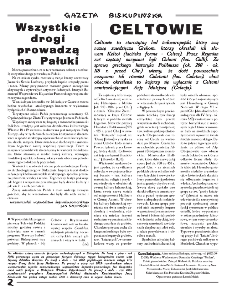 Wszystkie drogi prowadzą na Pałuki Można powiedzieć, że w tą wrześniową sobotę i niedzie− lę wszystkie drogi prowadzą na Pałuki. Na żnińskim rynku rozstawią swoje kramy uczestnicy Jarmarku Sztuki Ludowej, przybędą kapele i zespoły pieśni i tańca. Mamy przyjemność również gościć szczególnie aktywnych i wytrwałych artystów ludowych, których Sa− morząd Województwa Kujawsko−Pomorskiego wspiera do− rocznymi nagrodami. W unikalnym kościółku św. Mikołaja w Gąsawie można będzie wysłuchać atrakcyjnego koncertu w wykonaniu bydgoskich filharmoników. Turystyczne szlaki Pałuk przemierzają uczestnicy 42. Ogólnopolskiego Zlotu Turystycznego Jesień na Pałukach. Wspólnym motywem tej bogatej i różnorodnej mozaiki folkloru i tradycji jest ochrona dziedzictwa kulturowego. Właśnie 18 i 19 września realizowana jest inicjatywa Rady Europy, aby w tych dniach na całym kontynencie akcento− wać i w sposób atrakcyjny upowszechniać wszelkie wydarze− nia, dzieła, miejsca, które świadczą o duchowym i materia− lnym bogactwie naszej wspólnej cywilizacji. Także w naszym województwie akcentujemy te wartości i te dokona− nia, które stanowią o randze naszej kultury, wymagają troskliwej opieki, ochrony, ukazywania obecnym pokole− niom tego co dokonały poprzednie. Wartości te są również obecne podczas kolejnego Festy− nu Archeologicznego w Biskupinie. Impreza ta jest dosko− nałym przykładem niezwykle atrakcyjnego sposobu prezen− tacji historii, wiedzy i sztuki. Tegoroczny festyn pokazuje jak bogate i wzajemnie przenikające były dawne kultury i jak wiele z nich pozostało. Życzę mieszkańcom Pałuk i mam nadzieję licznym gościom, aby te wrześniowe dni były dla nich ważne i ciekawe. wicemarszałek województwa kujawsko−pomorskiego JAN SZOPIŃSKI J W poniedziałek program pierwszy Telewizji Polskiej między godziną szóstą a dziewiątą rano w ramach programu "Kawa czy herbata" poświęci Biskupinowi trzy godziny. W planach − bój Celtów z Rzymianami, kosztowanie soli na kraalu, występ zespołu Comhlan, wybijanie pieniędzy, tocze− nie celtyckich naczyń gli− nianych i wizyta w balii. (dk) CELTOWIE Celtowie to starożytny lud indoeuropejski, który swą nazwę zawdzięcza Grekom, którzy określali ich sło− wem Keltoi (łacińska forma − Celtae). Przez Rzymian zaś częściej nazywani byli Galami (łac. Galli). Za sprawą greckiego historyka Polibiusza (ok. 200 − ok. 118 r. przed Chr.) wiemy, że dość powszechnie nazywano ich również Galatami (łac. Galatae), choć obecnie określenie to kojarzy się wyłącznie z Celtami zamieszkującymi Azję Mniejszą (Galacja). Za najstarszą informację o Celtach uważa się wzmia− nkę Hekatajosa z Miletu (ok. 540 − 480 r. przed Chr.) z dzieła "Obejście Ziemi” mówiącą o kraju Celtów lężącym w pobliżu siedzib Ligurów. Niewiele później Herodot z Halikarnasu (485 − 425 r. przed Chr.) w swo− ich "Dziejach” napisał, że: "Dunaj (Istros) wytryska na ziemi Celtów koło miasta Pyrene i płynie przez Euro− pę, którą dzieli. Celtowie zaś żyją za słupami Herakle− sa...” (Herodot II,33). Większość naukowców jest zgodna, że cywilizacja celtycka w swojej specyficz− nej formie − tzn. kultura materialna, religia i język − rozwinęły się w obrębie tak zwanej kultury halsztackiej, która swoją nazwę wzięła od miejscowości Hallstatt w Górnej Austrii. W obrę− bie kultury halsztackiej wy− różnia się dwie strefy: za− chodnią i wschodnią, róż− niące się między innymi rodzajem wyposażenia skła− danego zmarłym do grobów. Charakterystyczną cechą dla kręgu zachodniego było wy− posażanie bogatych grobów, tzw. "książęcych”, w cztero− kołowe wozy, co prawdo− Na okładce: cztery otwarcia festynów archeologicznych w Biskupinie. Po lewej u góry − rok 1995: pierwszego cięcia na pierwszym festynie dokonuje tępym biskupińskim nożem wójt Gąsawy Zdzisław Kuczma. Po lewej u dołu − rok 2002: popielowym mieczem wstęgę kroi reżyser Starej Baśni Jerzy Hoffmann. Po prawej u góry: rok 2003: tomahawkiem uderza wicemarszałek sejmiku samorządowego województwa kujawsko−pomorskiego Jan Szopiński; obok wódz festynu w Biskupinie Wiesław Zajączkowski. Po prawej u dołu − rok 2001: przedstawiciel prezydenta Rzeczpospolitej Polskiej Aleksandra Kwaśniewskiego Jerzy Skokowski tnie piękną wstęgę szablą. Dziś o dziesiątej rano w użyciu będzie miecz. podobnie stanowiło odzwie− rciedlenie pewnych różnic w wierzeniach i praktykach religijnych. W powszechnym przeko− naniu kolebką cywilizacji celtyckiej była przede wszystkim strefa zachodnia, gdzie wcześniej rozwijała się tzw. kultura pól popielnico− wych. Obejmowała ona te− reny od Czech na wscho− dzie po Masyw Centralny na zachodzie, pomiędzy Al− pami i Śródgórzem niemie− ckim. Miasteczko Hall− statt, które dało nazwę całej epoce (od ok. 700 do 450 r. przed Chr. − na ziemiach polskich okres schyłku kul− tury łużyckiej i rozwoju ku− ltury pomorskiej) położone jest na granicy obydwu stref. Swoją sławę zyskało ono dzięki odkryciu cmentarzy− ska z ponad tysiącem gro− bów ciałopalnych i szkiele− towych. Liczną grupę poś− ród nich stanowiły bogato wyposażone (ornamentowa− na broń i biżuteria) pochó− wki ludności celtyckiej, któ− ra swoją zamożność zawdzię− czała eksploatacji złóż soli, a także pozyskiwaniu i ob− róbce metali. Symbolem celtyckiej kul− tury zachodniohalsztackiej były osiedla obronne, spo− śród których najważniejszym jest Heuneburg w Górnej Nadrenii. W ciągu VI w. przed Chr. (data dendrochro− nologiczna dla IV fazy − ok. roku 520) wzniesiono tu po− tężne fortyfikacje z suszo− nych cegieł, które wzorowa− ne były na modelach zapo− życzonych wprost ze świata śródziemnomorskiego. By− ło to jedyne teg