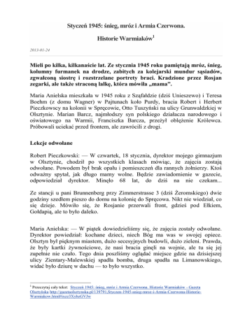 Styczeń 1945: śnieg, mróz i Armia Czerwona. Historie Warmiaków1 2013-01-24 Mieli po kilka, kilkanaście lat. Ze stycznia 1945 roku pamiętają mróz, śnieg, kolumny furmanek na drodze, zabitych za kolejarski mundur sąsiadów, zgwałconą siostrę i rozstrzelane portrety braci. Kradzione przez Rosjan zegarki, ale także straconą lalkę, która mówiła „mama”. Maria Anielska mieszkała w 1945 roku z Sząfałdzie (dziś Unieszewo) i Teresa Boehm (z domu Wagner) w Pajtunach koło Purdy, bracia Robert i Herbert Pieczkowscy na kolonii w Spręcowie, Otto Tuszyński na ulicy Grunwaldzkiej w Olsztynie. Marian Barcz, najmłodszy syn polskiego działacza narodowego i oświatowego na Warmii, Franciszka Barcza, przeżył oblężenie Królewca. Próbowali uciekać przed frontem, ale zawrócili z drogi. Lekcje odwołane Robert Pieczkowski: — W czwartek, 18 stycznia, dyrektor mojego gimnazjum w Olsztynie, chodził po wszystkich klasach mówiąc, że zajęcia zostają odwołane. Powodem był brak opału i pomieszczeń dla rannych żołnierzy. Ktoś odważny spytał, jak długo mamy wolne. Będzie zawiadomienie w gazecie, odpowiedział dyrektor. Minęło 68 lat, do dziś na nie czekam... Ze stancji u pani Brunnenberg przy Zimmerstrasse 3 (dziś Żeromskiego) dwie godziny szedłem pieszo do domu na kolonię do Spręcowa. Nikt nie wiedział, co się dzieje. Mówiło się, że Rosjanie przerwali front, gdzieś pod Ełkiem, Gołdapią, ale to było daleko. Maria Anielska: — W piątek dowiedzieliśmy się, że zajęcia zostały odwołane. Dyrektor powiedział: kochane dzieci, niech Bóg ma was w swojej opiece. Olsztyn był pięknym miastem, dużo secesyjnych budowli, dużo zieleni. Prawda, że były kartki żywnościowe, że nasi bracia ginęli na wojnie, ale tu się jej zupełnie nie czuło. Tego dnia poszliśmy oglądać miejsce gdzie na dzisiejszej ulicy Zientary-Malewskiej spadła bomba, druga spadła na Limanowskiego, widać było dziurę w dachu — to było wszystko. 1 Przeczytaj cały tekst: Styczeń 1945: śnieg, mróz i Armia Czerwona. Historie Warmiaków - Gazeta Olsztyńska http://gazetaolsztynska.pl/139791,Styczen-1945-snieg-mroz-i-Armia-Czerwona-HistorieWarmiakow.html#ixzz3XybzGVJw Kuda na Berlin? Otto Tuszyński: — Miałem 12 lat, była piękna zima, bardziej myślałem o sankach i łyżwach niż wojnie. Już dziesięć dni przed 22 stycznia Grunwaldzką szły w kierunku Morąga transporty niemieckiego wojska. Matka myślała — dziś nie mogę się nadziwić, jak ona to sobie wyobrażała — żeby pojechać do ojca, który pracował w fabryce amunicji pod Królewcem. W sobotę ze starszą siostrą zapakowały rzeczy na sanki i z Grunwaldzkiej poszły na dworzec, ale pociągów już nie było. W nocy siedzieliśmy w piwnicy w schronie, miałem maskę gazową. Spałem już, kiedy koło północy ktoś powiedział, że Rosjanie są na Moście Jana i trzeba uciekać. Matka była w ciąży, najmłodsza siostra miała 3 lata. Na przejeździe w Likusach jakiś żołnierz zabrał nas na furmankę. Spytał mnie, czy potrafię powozić. Dał mi lejce, a sam szedł obok. Co rusz musieliśmy się zatrzymywać i zjeżdżać do rowu, lewa strona miała być wolna dla wojska. Około południa byliśmy w Łukcie. Tutaj, stop! Obejrzałem się. Droga płonęła. Widocznie wojsko miało rozkaz, żeby podpalić porzucone pojazdy. Maria Anielska: — Z piątku na sobotę ojciec miał nocną zmianę na poczcie w Olsztynie. Nie było go, gdy z matką uciekaliśmy z Sząfałdu. Dotarliśmy tylko do Giedajt. Mróz do minus 28 stopni, śnieg sięgał dzieciom powyżej brzucha. Pamiętam niemieckich żołnierzy z lazaretu, szli w pokrwawionych bandażach, o kulach, z rękami na temblaku. Starsi zadecydowali, że wracamy. Pierwsi Rosjanie, których spotkaliśmy w lesie, pytali tylko: „Kuda na Berlin?”. W domu radość, przede wszystkim dlatego, że zastaliśmy ojca, nie wiedział, co z nami, nie zostawiliśmy mu nawet kartki. Piekło zaczęło się następnego dnia. Rosjanie, którzy przyszli do naszego domu, z karabinów maszynowych strzelali do portretów moich braci, którzy zginęli na froncie wschodnim. Oczywiście dlatego, że na zdjęciach byli w niemieckich mundurach. Znaleźli w szafie pocztowy mundur ojca i pytali, gdzie jest „giermański sołdat”. Wojskowy wydał się im też bardzo podobny, granatowy, kolejarski mundur naszego sąsiada. Zastrzelili go z całą rodziną, 10-11 osób. Ryk niedojonych krów Teresa Boehm: — Mieszkaliśmy przy drodze. Rosjanie szli, tak jak płynie woda w rzece, cały czas, na piechotę, furmankami. Jeden czołg wjechał na nasze podwórko. Z daleka widzieliśmy bombardowanie Olsztyna, jakby zapalone choinki leciały z nieba. Siedzieliśmy w piwnicy pod oborą, gdzie były ziemniaki i buraki. W nocy Rosjanie wyciągnęli nas i zaczęli obmacywać. Miałam w kieszeni podłużne pudełko z zegarkiem, wtedy go jeszcze nie znaleźli. Kiedy brat pobiegł do sąsiadów, trzech starszych mężczyzn, gospodarz i dwóch uciekinierów, już tam było zabitych. A zegarek nosiłam potem zapięty wysoko na ramieniu. Matka mówiła, że uratował nam życie, kiedy przyszli następni Rosjanie i też chcieli zegarków. Uciekając, dotarliśmy do Barczewa. Pamiętam, jak na skrzyżowaniu brat podbiegł do stojących tam wyższych niemieckich oficerów, pytając, dokąd się udać. Nie odpowiedzieli. Gdy wracaliśmy do Pajtun, z daleka było słychać ryk niedojonych krów i głodnych świń. Świnie Rosjanie od razu zastrzelili, krowy zabrali. Została nam jedna, ale ją też potem zabrali. Najbardziej żałowałam naszego psa, który nie wrócił z ucieczki. Herbert Pieczkowski: — 21 stycznia godzina 10, ostatnia msza w kościele w Brąswałdzie. Ksiądz Alojzy Moritz odczytał zarządzenie władz, że trzeba uciekać w kierunku: Bukwałd, Różynka, Kwiecewo. Po kościele płacz. Do ojca podchodzili sąsiedzi. On powiedział, że nigdzie nie będzie uciekał, bo m