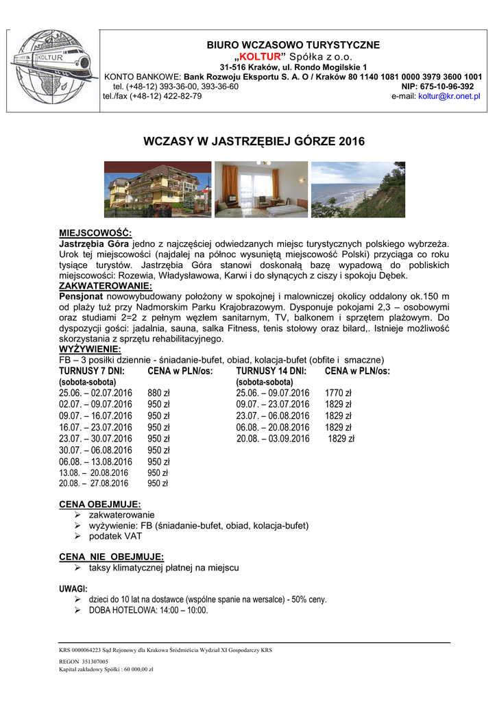 BIURO WCZASOWO TURYSTYCZNE „KOLTUR” Spółka z o.o. 31-516 Kraków, ul. Rondo Mogilskie 1 KONTO BANKOWE: Bank Rozwoju Eksportu S. A. O / Kraków 80 1140 1081 0000 3979 3600 1001 tel. (+48-12) 393-36-00, 393-36-60 NIP: 675-10-96-392 tel./fax (+48-12) 422-82-79 e-mail: [email protected] WCZASY W JASTRZĘBIEJ GÓRZE 2016 MIEJSCOWOŚĆ: Jastrzębia Góra jedno z najczęściej odwiedzanych miejsc turystycznych polskiego wybrzeża. Urok tej miejscowości (najdalej na północ wysuniętą miejscowość Polski) przyciąga co roku tysiące turystów. Jastrzębia Góra stanowi doskonałą bazę wypadową do pobliskich miejscowości: Rozewia, Władysławowa, Karwi i do słynących z ciszy i spokoju Dębek. ZAKWATEROWANIE: Pensjonat nowowybudowany położony w spokojnej i malowniczej okolicy oddalony ok.150 m od plaży tuż przy Nadmorskim Parku Krajobrazowym. Dysponuje pokojami 2,3 – osobowymi oraz studiami 2=2 z pełnym węzłem sanitarnym, TV, balkonem i sprzętem plażowym. Do dyspozycji gości: jadalnia, sauna, salka Fitness, tenis stołowy oraz bilard,. Istnieje możliwość skorzystania z sprzętu rehabilitacyjnego. WYŻYWIENIE: FB – 3 posiłki dziennie - śniadanie-bufet, obiad, kolacja-bufet (obfite i smaczne) TURNUSY 7 DNI: (sobota-sobota) CENA w PLN/os: 25.06. – 02.07.2016 02.07. – 09.07.2016 09.07. – 16.07.2016 16.07. – 23.07.2016 23.07. – 30.07.2016 30.07. – 06.08.2016 06.08. – 13.08.2016 880 zł 950 zł 950 zł 950 zł 950 zł 950 zł 950 zł 13.08. – 20.08.2016 20.08. – 27.08.2016 950 zł 950 zł TURNUSY 14 DNI: (sobota-sobota) 25.06. – 09.07.2016 09.07. – 23.07.2016 23.07. – 06.08.2016 06.08. – 20.08.2016 20.08. – 03.09.2016 CENA w PLN/os: 1770 zł 1829 zł 1829 zł 1829 zł 1829 zł CENA OBEJMUJE: zakwaterowanie wyżywienie: FB (śniadanie-bufet, obiad, kolacja-bufet) podatek VAT CENA NIE OBEJMUJE: taksy klimatycznej płatnej na miejscu UWAGI: dzieci do 10 lat na dostawce (wspólne spanie na wersalce) - 50% ceny. DOBA HOTELOWA: 14:00 – 10:00. KRS 0000064223 Sąd Rejonowy dla Krakowa Śródmieścia Wydział XI Gospodarczy KRS REGON 351307005 Kapitał zakładowy Spółki : 60 000,00 zł