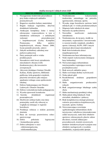 1. 2. 3. 4. 5. 6. 7. 8. 9. 10. 11. 12. 13. 14. 15. 16. 17. Analiza mocnych i słabych stron LGD MOCNE STRONY SŁABE STRONY Niezagrożone środowisko przyrodnicze 1. Niedostateczne wykorzystanie przy braku większych zakładów środowiska naturalnego na potrzeby przemysłowych agroturystyki, rekreacji, sportu. Bogactwo zasobów kultury materialnej 2. Wysoka stopa bezrobocia zarówno ludzi Bogate tradycje regionalne, aktywna młodych jak i w wieku przedemerytalnym działalność kulturalna 3. Migracja ludzi młodych do miast Atrakcyjne kompleksy leśne i tereny 4. Starzenie się społeczeństwa rekreacyjno- wypoczynkowe w tym o 5. Niewielkie możliwości znalezienia charakterze ochronnym z unikalnymi zatrudnienia walorami przyrodniczymi 6. Niedostateczne, do tej pory, środki na i krajobrazowymi (Leśny Kompleks utrzymanie, wyposażenie i inwestowanie Promocyjny, kilka parków w rozwój świetlic wiejskich, ośrodków krajobrazowych, obszary Natura 2000, sportu i rekreacji, KGW, OSP i innych liczne pomniki przyrody, zalew) instytucji aktywizacji mieszkańców Zabytki architektury sakralnej oraz 7. Brak form kształcenia dzieci parkowo-pałacowej niepełnosprawnych Duży potencjał osób w wieku 8. Niedostateczna baza informatyczna produkcyjnym 9. Niski stopień wykorzystania istniejącej Stosunkowo niski koszt zatrudnienia bazy kulturalnej mieszkańców obszaru LGD, 10. Niewystarczająca infrastruktura (konkurencyjny), dla inwestorów instytucjonalna wspierająca rozwój zewnętrznych przedsiębiorczości Aktywnie działające Gminne Ośrodki 11. Brak nowych zakładów pracy Kultury, Kluby sportowe, Biblioteki 12. Słabo rozwinięta drobna wytwórczość publiczne, koła gospodyń wiejskich, 13. Niska jakość gleb placówki oświatowe jako miejsca 14. Rozdrobniona struktura gospodarstw spędzania wolnego czasu społeczności rolnych lokalnej 15. Słabe zorganizowanie producentów Dobrze funkcjonująca sieć Domów rolnych Ludowych i Domów Strażaka 16. Brak zorganizowanego lokalnego rynku Dobrze wykształcona kadra pedagogiczna zbytu Wysoka sprawność kształcenia 17. Słaba mechanizacja produkcji rolnej Szeroka działalność organizacji 18. Słaba jakość dróg lokalnych -brak pozarządowych oświetleń, chodników i poboczy Możliwość selekcji kadry oraz duży 19. Brak kompleksowej strategii promocji potencjalny zasób siły roboczej ze walorów przyrodniczo-krajobrazowych, względu na istniejące w regionie turystyki, sportu i kultury bezrobocie 20. Niewystarczająco rozwinięta Produkcja rolnicza o niskim poziomie ogólnodostępna infrastruktura około skażenia turystyczna i zabytkowa (nieoznakowane Baza do rozwoju przetwórstwa rolnoszlaki turystyczne, mała ilość obiektów spożywczego sportowo–rekreacyjnych, placów zabaw Dobre położenie logistyczne dla dzieci, ścieżek edukacyjnoi komunikacyjne gminy przyrodniczych, ścieżek rowerowych, Dobre uzbrojenie w sieci: domków letniskowych pod wynajem oraz - elektroenergetyczną obiektów noclegowych o wysokim - telekomunikacyjną standardzie, wypożyczalni sprzętu 18. 19. 20. 21. 22. 23. 24. 25. 26. - wodociągową Współpraca samorządów ze społecznością lokalną Cykliczne imprezy kulturalne i sportowe zasięgu regionalnym i ogólnopolskim Duża liczba amatorskich grup artystycznych i animatorów kultury Poczucie tożsamości regionalnej i zdolności do mobilizacji społecznej Doskonałe warunki do uprawiania turystyki aktywnej i specjalistycznej – rozległe tereny do wytyczenia szlaków turystycznych (pieszych, rowerowych) Potencjał dla rozwoju agroturystyki i produkcji zdrowej żywności Funkcjonowanie Muzeum Kultury Ludowej Działające wydawnictwo regionalne i prasa regionalna Dobre warunki sprzyjające rozwojowi odnawialnych źródeł energii 21. 22. 23. 24. 25. 26. 27. 28. 29. 30. 31. sportowo - rekreacyjnego itp.) Mała liczba gospodarstw agroturystycznych Niedostateczna integracja działań branży turystycznej - znikoma ilość oferty turystycznej w formie pakietów sprzedawanych zarówno na miejscu, jak i poza granicami obszaru, brak wypromowanych produktów turystycznych np. Skansenu Brak wykwalifikowanej kadry turystycznej (w tym przygotowanych do obsługi turystów z kraju i zagranicy przewodników tj. osób, które oprowadziłyby turystów po najciekawszych miejscach na terenie LGD) Brak organizacji spotkań młodzieży z osobami, które chciałyby przekazać im swoją wiedzę, umiejętności z zakresu kultury domowego przetwórstwa oraz kultywowania lokalnych tradycji Brak środków na szkolenia, warsztaty w zakresie wytworzenia i produkcji lokalnych towarów i produktów Brak środków na rozwój i podjęcie działalności gospodarczej Niewystarczająca oferta i ilość zajęć spędzenia wolnego czasu, zajęć pozalekcyjnych dla dzieci, młodzieży i osób starszych Brak żłobków – opieki nad dziećmi niekwalifikującymi się jeszcze do publicznego przedszkola – dzieci poniżej 3 roku zycia Zbyt mała ilość kursów i szkoleń aktywizujących społeczność na terenie LGD Brak środków finansowych na rozwój usług kulturalnych i turystycznych Brak spójności społecznej mieszkańców poprzez niskie zaangażowanie w działalność swojej wsi i Gminy, blokująca przedsiębiorczość i innowacyjność Analiza szans i zagrożeń LGD SZANSE 1. Rozwój świadomości ekologicznej mieszkańców 2. Pozyskanie środków z funduszy strukturalnych na rozbudowę i rozwój istniejącej infrastruktury drogowej (drogi chodniki, oświetlenie), kulturalnej i sportowej oraz na realizację programów z zakresu ochrony środowiska 3. Przekazanie większych środków na remont, utrzymanie, doposażenie organizacji społecznych, świetlic wiejskich w niezbędne narzędzia oraz szkół w pomoce dydaktyczno – naukowe 4. Zaradność mieszkańców - polepszenie się sytuacji ekonomicznej mieszkańców 5. Kształcenie młodzieży w tematyce nowoczesnych technologii 6. Rozszerzenie strefy ekonomicznej – zaint