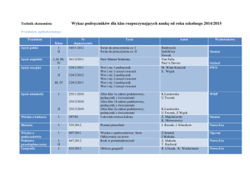 Wykaz podręczników dla klas rozpoczynających naukę od roku szkolnego 2014/2015 Technik ekonomista Przedmioty ogólnokształcące Przedmiot Język polski Język angielski Język rosyjski Klasa I II Nr dopuszczenia 545/1/2012 I, II, III, IV I 361/2/2011 II 324/2/2012 III, IV 324/3/2011 I 255/1/2010 324/1/2011 Tytuł Świat do przeczytania cz. I Świat do przeczytania cz. II New Matura Solutions Wot i my 1-podręcznik Wot i my 1-zeszyt ćwiczeń Wot i my 2-podręcznik Wot i my 2-zeszyt ćwiczeń Wot i my 3-podręcznik Wot i my 3-zeszyt ćwiczeń II 255/3/2010 Wiedza o kulturze I 387/03 Alles klar 1a zakres podstawowy, podręcznik z ćwiczeniami Alles klar 1b zakres podstawowy, podręcznik z ćwiczeniami Alles klar 2a zakres podstawowy, podręcznik z ćwiczeniami Człowiek-twórca kultury Historia I 525/2012 Poznać przeszłość Wiedza o społeczeństwie Podstawy przedsiębiorczości Geografia I 407/2011 I II I 467/2012 Wiedza o społeczeństwie. Seria Odkrywamy na nowo Krok w przedsiębiorczość 433/2012 Oblicza geografii Język niemiecki 255/2/2010 Autor Biedrzycki Jaskółowa Nowak Tim Falla Paul A.Davies M. Wiatr-Kmiecik S. Wujek K.Łuniewska U.Tworek K.Łuniewska U.Tworek, Z.Wąsik Z. Majchrowski K. Mrowcewicz J. Roszak, J. Kłaczkow Z.Smutek J.Maleska Z. Makieła T. Rachwał R. Uliszak, K. Wiedermann Wydawnictwo Stentor Oxford PWN WSiP Stentor Nowa Era Operon Nowa Era Nowa Era Biologia I 450/2012 Biologia na czasie Chemia I 535/2011 Świat chemii Fizyka I 394/2011 Świat fizyki Matematyka(zakres rozszerzony) I II 596/2012 Matematyka w otaczającym nas świecie" zakres podstawowy i rozszerzony Informatyka I 516/2012 Edukacja dla bezpieczeństwa I 426/2012 Informatyka. Po prostu Zakres podstawowy Żyję i działam bezpiecznie E. Bonar W. Krzewiak -Jeleń J. Maciejewska A. Warchoł M. Fiałkowska J. Kreiner M.S. Godlewski K. Kozak A. Cewe, M. Krawczyk A. Magryś-Walczak M. Kruk, H. Nahorska Nowa Era Z. Nowakowski WSiP J. Słoma Nowa Era ZamKor ZamKor Podkowa Przedmioty realizowane w zakresie rozszerzonym oraz uzupełniające Przedmiot klasa Nr dopuszczenia Tytuł Autor Wydawnictwo I II 596/2012 Matematyka w otaczającym nas świecie" zakres podstawowy i rozszerzony A. Cewe, M. Krawczyk A. Magryś-Walczak M. Kruk, H. Nahorska Wiedza o społeczeństwie II 630/1/2012 W centrum uwagi. Wiedza o społeczeństwie A. Janicki, J. Kięczkowska M. Menz Nowa Era Historia i społeczeństwo – przedmiot uz. III IV 659/1/2013 Ojczysty Panteon i ojczyste spory T. Maćkowski Nowa Era Matematyka Podkowa Przedmioty w kształceniu zawodowym teoretycznym Przedmiot klasa Przedsiębiorca w gospodarce rynkowej I II Analiza ekonomiczna i sprawozdawczość Język obcy w branży ekonomicznej Rachunkowość finansowa II II, III III IV Nr dopuszczenia Tytuł Autor Wydawnictwo Funkcjonowanie przedsiębiorstw cz. I i II Kwalifikacja A.35.1Podręcznik do zawodu technik ekonomista Joanna Ablewicz WSiP Planowanie, analiza ekonomiczna i sprawozdawczość. Kwalifikacja A.35.3 D. Dębski P. Dębski WSiP Gospodarowanie zasobami majątkowymi. Obsługa programu sprzedazowo magazynowego Subiekt. Kwalifikacja A.35 Finance B. Padurek B.Padurek Virginia Evans EGIS Zasady rachunkowości finansowej. Kwalifikacja A.36 Rachunkowość finansowa cz. I B. Padurek B.Padurek Rachunkowość przedsiębiorstw cz. II Rachunkowość przedsiębiorstw cz. III Rachunkowość przedsiębiorstw cz. IV Przedmioty w kształceniu zawodowym praktycznym Przedmiot Działalność przedsiębiorstwa klasa I II Kadry i płace Biuro rachunkowe II III IV Nr dopuszczenia Tytuł Autor Wydawnictwo Prowadzenie działalności gospodarczej. Podręcznik do nauki zawodu. Efekty kształcenia wspólne dla wszystkich zawodów T. Grobelny W. Aue WSiP Bezpieczeństwo i higiena pracy. Podręcznik do nauki zawodu. Efekty kształcenia wspólne dla wszystkich zawodów Organizacja i technika pracy biurowej Podręcznik do nauki zawodu. Efekty kształcenia wspólne dla wszystkich zawodów z branży ekonomicznej W. Bukała K. Szczęch WSiP U. Łatka WSiP Prowadzenie działalności gospodarczej. Podręcznik do nauki zawodu. Efekty kształcenia wspólne dla wszystkich zawodów T. Gorzelany W. Aue WSiP Rozliczenia podatkowe. Obsługa programu finansowo-księgowego Rachmistrz GT i kadrowo-płacowego Microgratyfikant GT Kwalifikacja A.35. Kwalifikacja A.35.2 Podręcznik do nauki zawodu Technik ekonomista Obsługa programów: kadrowo-płacowego Gratyfikant GT i Płatnik Kwalifikacja A.35. Przygotowanie dokumentów do ewidencji. Analiza finansowa. Obsługa Programu Finansowo – Księgowego Rewizor GT. Kwalifikacja A.36 WSiP B.Padurek B.Padurek B. Padurek B. Padurek