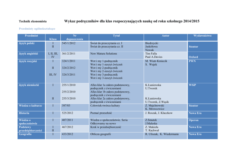 Klasa 1 i II Technik ekonomista Wykaz podręczników dla klas