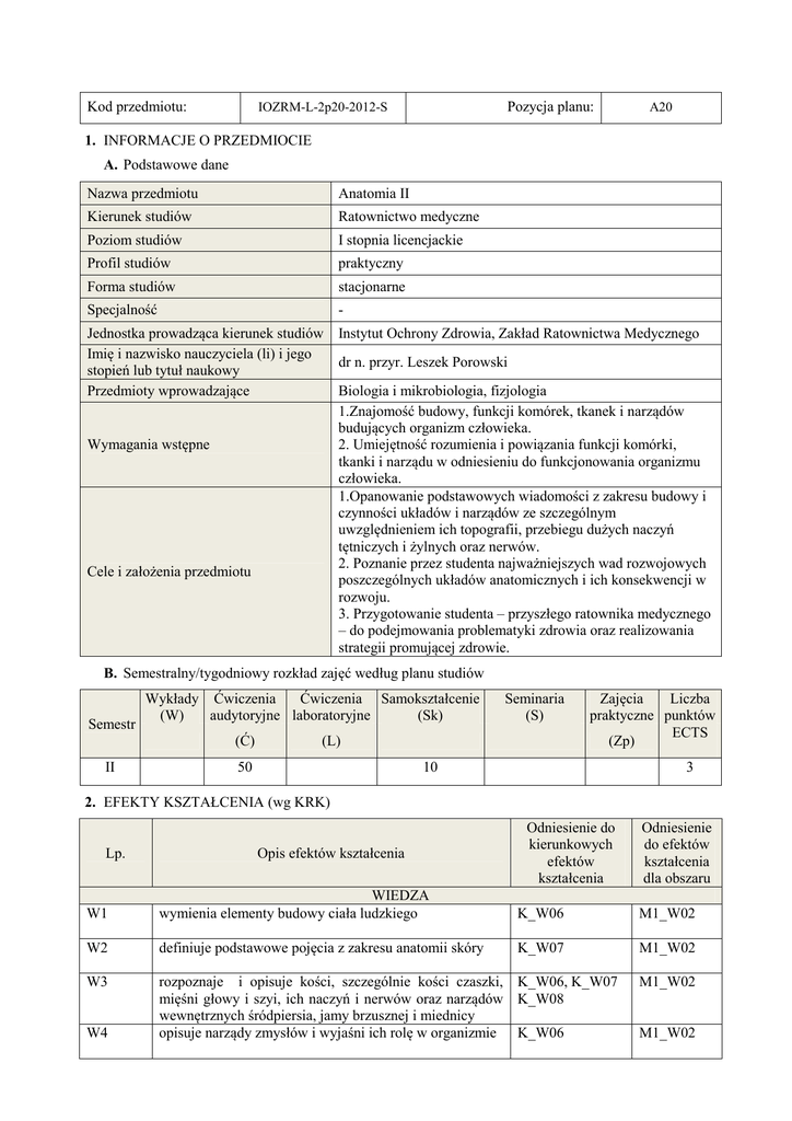Kod przedmiotu: Pozycja planu: IOZRM-L-2p20-2012-S A20 1. INFORMACJE O PRZEDMIOCIE A. Podstawowe dane Nazwa przedmiotu Anatomia II Kierunek studiów Ratownictwo medyczne Poziom studiów I stopnia licencjackie Profil studiów praktyczny Forma studiów stacjonarne Specjalność - Jednostka prowadząca kierunek studiów Imię i nazwisko nauczyciela (li) i jego stopień lub tytuł naukowy Przedmioty wprowadzające Instytut Ochrony Zdrowia, Zakład Ratownictwa Medycznego Wymagania wstępne Cele i założenia przedmiotu dr n. przyr. Leszek Porowski Biologia i mikrobiologia, fizjologia 1.Znajomość budowy, funkcji komórek, tkanek i narządów budujących organizm człowieka. 2. Umiejętność rozumienia i powiązania funkcji komórki, tkanki i narządu w odniesieniu do funkcjonowania organizmu człowieka. 1.Opanowanie podstawowych wiadomości z zakresu budowy i czynności układów i narządów ze szczególnym uwzględnieniem ich topografii, przebiegu dużych naczyń tętniczych i żylnych oraz nerwów. 2. Poznanie przez studenta najważniejszych wad rozwojowych poszczególnych układów anatomicznych i ich konsekwencji w rozwoju. 3. Przygotowanie studenta – przyszłego ratownika medycznego – do podejmowania problematyki zdrowia oraz realizowania strategii promującej zdrowie. B. Semestralny/tygodniowy rozkład zajęć według planu studiów Semestr Wykłady Ćwiczenia Ćwiczenia Samokształcenie (W) audytoryjne laboratoryjne (Sk) (Ć) II Seminaria (S) (L) 50 Zajęcia Liczba praktyczne punktów ECTS (Zp) 10 3 2. EFEKTY KSZTAŁCENIA (wg KRK) Lp. Opis efektów kształcenia Odniesienie do kierunkowych efektów kształcenia Odniesienie do efektów kształcenia dla obszaru W1 WIEDZA wymienia elementy budowy ciała ludzkiego K_W06 M1_W02 W2 definiuje podstawowe pojęcia z zakresu anatomii skóry K_W07 M1_W02 W3 rozpoznaje i opisuje kości, szczególnie kości czaszki, K_W06, K_W07 mięśni głowy i szyi, ich naczyń i nerwów oraz narządów K_W08 wewnętrznych śródpiersia, jamy brzusznej i miednicy opisuje narządy zmysłów i wyjaśni ich rolę w organizmie K_W06 W4 M1_W02 M1_W02 U4 UMIEJĘTNOŚCI potrafi zaprezentować topografię poszczególnych narządów wykazuje różnice w budowie człowieka dorosłego, noworodka i niemowlęcia prezentuje budowę i rolę kości oraz budowę i mechanikę mięśni różnicuje budowę poszczególnych układów U5 dokonuje interpretacji budowy narządów zmysłów U1 U2 U3 K1 K2 K3 K4 KOMPETENCJE SPOŁECZNE rozumie potrzebę uczenia się przez całe życie. jest otwarty na potrzeby pacjenta oraz cechuje się wysoką kulturą osobistą w kontaktach międzyludzkich. potrafi rozwiązywać najczęstsze problemy związane z wykonywaniem zawodu ratownika medycznego realizuje zadania w sposób zapewniający bezpieczeństwo własne i otoczenia, w tym przestrzega zasad bezpieczeństwa i higieny pracy. K_W06, K_W07 K_W08 K_W06, K_W07 K_W08 K_W06, K_W07 K_W08 K_W06, K_W07 K_W08 K_W06, K_W07 K_W08 M1_W02 M1_W02 M1_W02 M1_W02 M1_W02 K_K01 K_K06 M1_K01 M1_K03 K_K12 M1_K06 K_K14 M1_K07 3. METODY DYDAKTYCZNE Ćwiczenia (preparaty kostne, fantomy układu mięśniowego, narządów wewnętrznych – śródpiersia, jamy brzusznej, miednicy, mięśnie i naczynia kończyn, fantomy mózgowia, narządów zmysłów), prezentacje multimedialne przygotowane przez studentów. 4. FORMA I WARUNKI ZALICZENIA PRZEDMIOTU Przedmiot kończy się egzaminem w formie pisemnej, na semestrze drugim. Kolokwium testowe z wykładów – na zaliczenie wymagane 60% prawidłowych odpowiedzi. 5. TREŚCI KSZTAŁCENIA Tematyka zajęć: Ćwiczenia: 1. Rola kości. Kręgosłup jako całość. Charakterystyka poszczególnych odcinków kręgosłupa. Klatka piersiowa kostna. 2. Kości kończyny górnej i dolnej. Miednica kostna jako całość. Płaszczyzny i wymiary miednicy. Ręka i stopa jako całość. Czaszka: podział kości, powierzchnia wewnętrzna podstawy czaszki, oczodół, jama nosowa. 3. Rodzaje połączeń kostnych, przykłady. Budowa i podział stawów. Stawy kończyny górnej i dolnej. Stawy głowy. Staw skroniowo - żuchwowy. 4. Mięśnie działające na stawy obręczy barkowej, staw ramienny i staw łokciowy. 5. Mięśnie działające na staw biodrowy, kolanowy. 6. Mięśnie oddechowe. Mięśnie działające na stawy kręgosłupa oraz stawy głowy. 7. Nerwy rdzeniowe: podział, budowa, gałęzie. 8. Sploty nerwowe: szyjny, ramienny – topografia, gałęzie, zakres unerwienia. Objawy uszkodzenia nerwów. Nerwy między żebrowe – zakres unerwienia. 9. Sploty nerwowe: lędźwiowy i krzyżowy – topografia, gałęzie, zakres unerwienia. Objawy uszkodzenia nerwów. Gałęzie grzbietowe nerwów rdzeniowych. 10. Nerwy czaszkowe: rodzaje włókien nerwowych i ich źródła. Zakres unerwienia i objawy porażenia (nerw trójdzielny i nerw twarzowy). 11. Opony mózgowia i rdzenia kręgowego. Budowa zewnętrzna i wewnętrzna rdzenia kręgowego. Mózgowie: płaty, zakręty, lokalizacja ośrodków w korze, istota biała półkul mózgowych. 12. Struktury międzymózgowia, budowa zewnętrzna i wewnętrzna pnia mózgu, lokalizacja jąder nerwów czaszkowych. Komory mózgowia, krążenie płynu mózgowo – rdzeniowego. 13. Drogi aferentne: układ przednio – boczny i grzbietowo – wstęgowy. Droga wzrokowa, słuchowa, przedsionkowa. 14. Układ nerwowy ruchowy. Części układu, móżdżek – budowa, czynność i objawy uszkodzenia. Objawy uszkodzenia górnego i dolnego neuronu ruchowego. 15. Układ nerwowy autonomiczny. Ośrodki autonomiczne. Części układu autonomicznego (pień współczulny, zwoje czaszkowe przywspółczulne, sploty jam ciała i sploty śródścienne). 16. Układ sercowo – naczyniowy, położenie serca, budowa serca, aorta i jej główne gałęzie, tętnice głowy i szyi oraz kończyn. 17. Główne pnie żylne, żyły kończyn, pnie i przewody chłonne. Miejsca badania tętna, tamowanie krwotoków, miejsca wstrzyknięć. 18. Węzły chłonne głowy, szyi, pachowe, pachwinowe i 