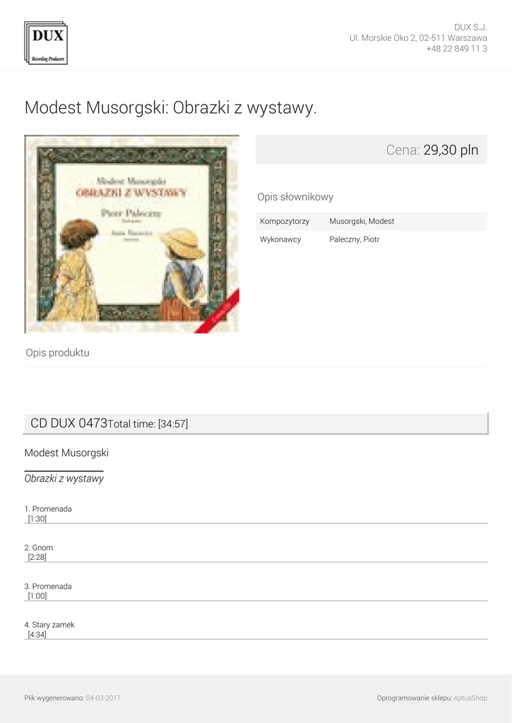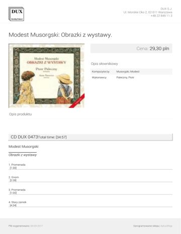 DUX S.J. Ul. Morskie Oko 2, 02-511 Warszawa +48 22 849 11 3 Modest Musorgski: Obrazki z wystawy. Cena: 29,30 pln Opis słownikowy Kompozytorzy Musorgski, Modest ∎ Wykonawcy Paleczny, Piotr ∎ Opis produktu CD DUX 0473Total time: [34:57] Modest Musorgski Obrazki z wystawy 1. Promenada [1:30] 2. Gnom [2:28] 3. Promenada [1:00] 4. Stary zamek [4:34] Plik wygenerowano: 04-03-2017 Oprogramowanie sklepu: AptusShop DUX S.J. Ul. Morskie Oko 2, 02-511 Warszawa +48 22 849 11 3 5. Promenada [0:29] 6. Tuileries (kłótnia dzieci po zabawie) [1:05] 7. Bydło [2:47] 8. Promenada [0:52] 9. Taniec kurcząt w skorupkach [1:14] 10. Samuel Goldenberg i Szmul [2:44] 11. Promenada [1:25] 12. Rynek w Limoges [1:20] 13. Katakumby [1:55] 14. Z umarłymi językiem umarłych [2:51] 15. Chatka na kurzej stopce [3:30] 16. Wielka Brama Kijowska [5:12] Wykonawcy: Piotr Paleczny /fortepian/ Plik wygenerowano: 04-03-2017 Powered by TCPDF (www.tcpdf.org) Oprogramowanie sklepu: AptusShop