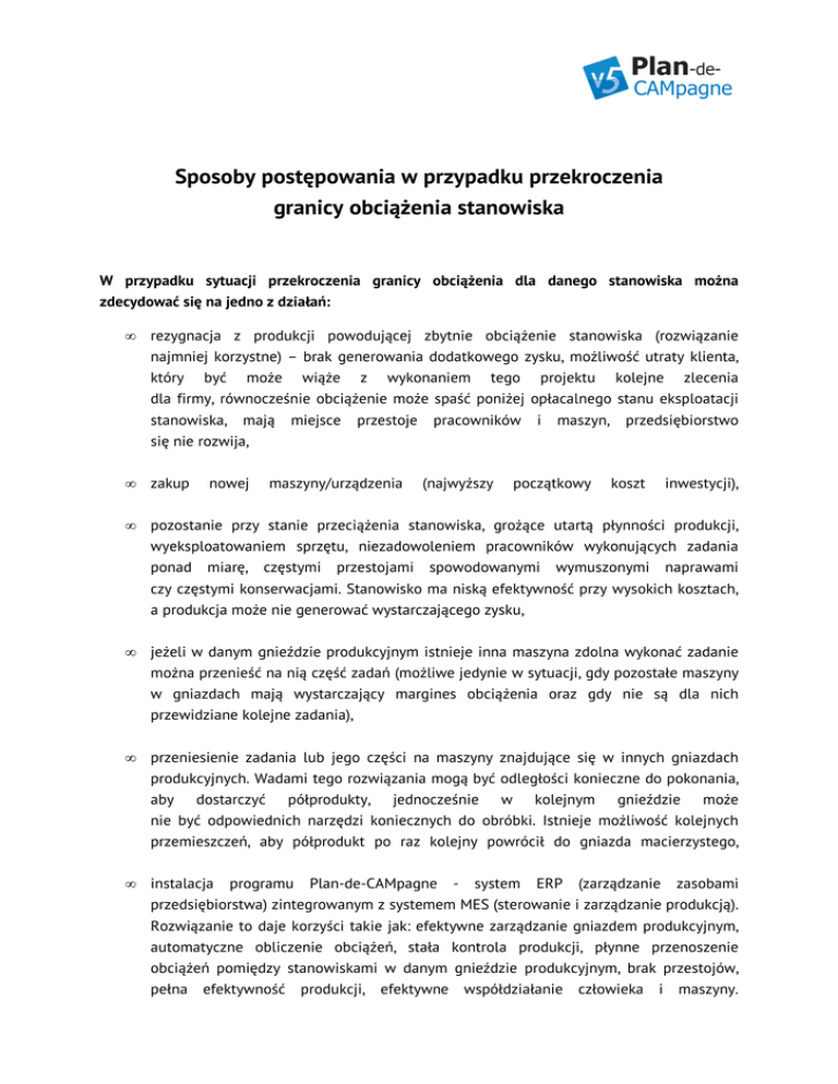 Sposoby postępowania w przypadku przekroczenia granicy obciążenia stanowiska W przypadku sytuacji przekroczenia granicy obciążenia dla danego stanowiska można zdecydować się na jedno z działań: • rezygnacja z produkcji powodującej zbytnie obciążenie stanowiska (rozwiązanie najmniej korzystne) – brak generowania dodatkowego zysku, możliwość utraty klienta, który być może wiąże z wykonaniem tego projektu kolejne zlecenia dla firmy, równocześnie obciążenie może spaść poniżej opłacalnego stanu eksploatacji stanowiska, mają miejsce przestoje pracowników i maszyn, przedsiębiorstwo się nie rozwija, • zakup • pozostanie przy stanie przeciążenia stanowiska, grożące utartą płynności produkcji, wyeksploatowaniem sprzętu, niezadowoleniem pracowników wykonujących zadania ponad miarę, częstymi przestojami spowodowanymi wymuszonymi naprawami czy częstymi konserwacjami. Stanowisko ma niską efektywność przy wysokich kosztach, a produkcja może nie generować wystarczającego zysku, • jeżeli w danym gnieździe produkcyjnym istnieje inna maszyna zdolna wykonać zadanie można przenieść na nią część zadań (możliwe jedynie w sytuacji, gdy pozostałe maszyny w gniazdach mają wystarczający margines obciążenia oraz gdy nie są dla nich przewidziane kolejne zadania), • przeniesienie zadania lub jego części na maszyny znajdujące się w innych gniazdach produkcyjnych. Wadami tego rozwiązania mogą być odległości konieczne do pokonania, aby dostarczyć półprodukty, jednocześnie w kolejnym gnieździe może nie być odpowiednich narzędzi koniecznych do obróbki. Istnieje możliwość kolejnych przemieszczeń, aby półprodukt po raz kolejny powrócił do gniazda macierzystego, • instalacja programu Plan-de-CAMpagne - system ERP (zarządzanie zasobami przedsiębiorstwa) zintegrowanym z systemem MES (sterowanie i zarządzanie produkcją). Rozwiązanie to daje korzyści takie jak: efektywne zarządzanie gniazdem produkcyjnym, automatyczne obliczenie obciążeń, stała kontrola produkcji, płynne przenoszenie obciążeń pomiędzy stanowiskami w danym gnieździe produkcyjnym, brak przestojów, pełna efektywność produkcji, efektywne współdziałanie człowieka i maszyny. nowej maszyny/urządzenia (najwyższy początkowy koszt inwestycji), Jest to rozwiązanie zwracające się w krótkim okresie czasu, równocześnie jest niedrogie w porównaniu z naprawami, serwisem czy kupnem nowych maszyn. Co ważne Plan-de-CAMpagne kompleksowo wspomaga produkcję nie tylko w obrębie kontroli obciążeń maszyn. Autor: Ł. Piwowoński