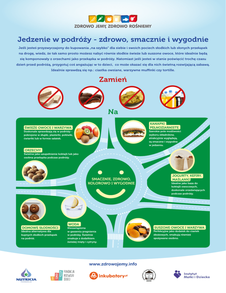 Jedzenie w podróży - zdrowo, smacznie i wygodnie Jeśli jesteś przyzwyczajony do kupowania „na szybko” dla siebie i swoich pociech słodkich lub słonych przekąsek na drogę, wiedz, że tak samo prosto możesz nabyć równie słodkie świeże lub suszone owoce, które idealnie będą się komponowały z orzechami jako przekąska w podróży. Natomiast jeśli jesteś w stanie poświęcić trochę czasu dzień przed podróżą, przygotuj coś angażując w to dzieci, co może okazać się dla nich świetną rozwijającą zabawą. Idealnie sprawdzą się np.: ciastka owsiane, warzywne muffinki czy tortille. Zamień Na KANAPKI PEŁNOZIARNISTE ŚWIEŻE OWOCE I WARZYWA Szerokie pole możliwości wyboru składników, atrakcyjnie wyglądają, są smaczne i wygodne w jedzeniu. Doskonale sprawdzają się w podróży pokrojone w słupki, plasterki, połówki, ćwiartki lub w formie sałatek. ORZECHY Świetne jako uzupełnienie koktajli lub jako osobna przekąska podczas podróży. SMACZNIE, ZDROWO, KOLOROWO I WYGODNIE DOMOWE SŁODKOŚCI Idealna alternatywa dla kupnych słodkich przekąsek na podróż. WODA Niezastąpiona w gaszeniu pragnienia w podróży, Świetnie smakuje z dodatkiem świeżej mięty i cytryny. www.zdrowojemy.info JOGURTY, KEFIRY, MAŚLANKI Idealne jako baza do koktajli owocowych, doskonale orzeźwiających podczas podróży. SUSZONE OWOCE I WARZYWA Perfekcyjne jako dodatek do ciastek zbożowych, smakują również spożywane osobno.