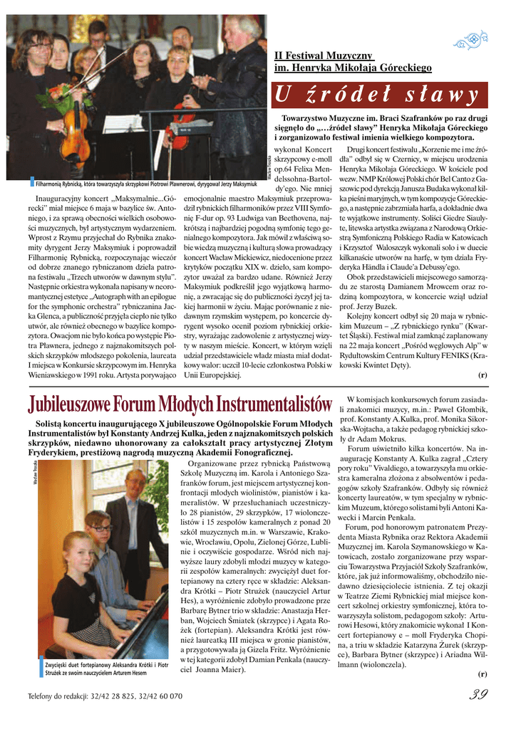 II Festiwal Muzyczny im. Henryka Mikołaja Góreckiego U źródeł sławy Towarzystwo Muzyczne im. Braci Szafranków po raz drugi sięgnęło do „…źródeł sławy” Henryka Mikołaja Góreckiego i zorganizowało festiwal imienia wielkiego kompozytora. Drugi koncert festiwalu ,,Korzenie me i me źródła’’ odbył się w Czernicy, w miejscu urodzenia Henryka Mikołaja Góreckiego. W kościele pod wezw. NMP Królowej Polski chór Bel Canto z Gaszowic pod dyrekcją Janusza Budaka wykonał kilka pieśni maryjnych, w tym kompozycje Góreckiego, a następnie zabrzmiała harfa, a dokładnie dwa te wyjątkowe instrumenty. Soliści Giedre Siaulyte, litewska artystka związana z Narodową Orkiestrą Symfoniczną Polskiego Radia w Katowicach i Krzysztof Waloszczyk wykonali solo i w duecie kilkanaście utworów na harfę, w tym działa Fryderyka Händla i Claude’a Debussy’ego. Obok przedstawicieli miejscowego samorządu ze starostą Damianem Mrowcem oraz rodziną kompozytora, w koncercie wziął udział prof. Jerzy Buzek. Kolejny koncert odbył się 20 maja w rybnickim Muzeum – „Z rybnickiego rynku’’ (Kwartet Śląski). Festiwal miał zamknąć zaplanowany na 22 maja koncert „Pośród węglowych Alp’’ w Rydułtowskim Centrum Kultury FENIKS (Krakowski Kwintet Dęty). (r) Jubileuszowe Forum Młodych Instrumentalistów W komisjach konkursowych forum zasiadali znakomici muzycy, m.in.: Paweł Głombik, prof. Konstanty A.Kulka, prof. Monika Sikorska-Wojtacha, a także pedagog rybnickiej szkoły dr Adam Mokrus. Forum uświetniło kilka koncertów. Na inaugurację Konstanty A. Kulka zagrał „Cztery pory roku” Vivaldiego, a towarzyszyła mu orkiestra kameralna złożona z absolwentów i pedagogów szkoły Szafranków. Odbyły się również koncerty laureatów, w tym specjalny w rybnickim Muzeum, którego solistami byli Antoni Kawecki i Marcin Penkala. Forum, pod honorowym patronatem Prezydenta Miasta Rybnika oraz Rektora Akademii Muzycznej im. Karola Szymanowskiego w Katowicach, zostało zorganizowane przy wsparciu Towarzystwa Przyjaciół Szkoły Szafranków, które, jak już informowaliśmy, obchodziło niedawno dziesięciolecie istnienia. Z tej okazji w Teatrze Ziemi Rybnickiej miał miejsce koncert szkolnej orkiestry symfonicznej, która towarzyszyła solistom, pedagogom szkoły: Arturowi Hesowi, który znakomicie wykonał I Koncert fortepianowy e – moll Fryderyka Chopina, a triu w składzie Katarzyna Żurek (skrzypce), Barbara Bytner (skrzypce) i Ariadna Willmann (wiolonczela). (r) Wacław Troszka wykonał Koncert skrzypcowy e-moll op.64 Felixa Mendelssohna-BartolFilharmonią Rybnicką, która towarzyszyła skrzypkowi Piotrowi Pławnerowi, dyrygował Jerzy Maksymiuk dy’ego. Nie mniej Inauguracyjny koncert ,,Maksymalnie...Gó- emocjonalnie maestro Maksymiuk przeprowarecki’’ miał miejsce 6 maja w bazylice św. Anto- dził rybnickich filharmoników przez VIII Symfoniego, i za sprawą obecności wielkich osobowo- nię F-dur op. 93 Ludwiga van Beethovena, najści muzycznych, był artystycznym wydarzeniem. krótszą i najbardziej pogodną symfonię tego geWprost z Rzymu przyjechał do Rybnika znako- nialnego kompozytora. Jak mówił z właściwą somity dyrygent Jerzy Maksymiuk i poprowadził bie wiedzą muzyczną i kulturą słowa prowadzący Filharmonię Rybnicką, rozpoczynając wieczór koncert Wacław Mickiewicz, niedocenione przez od dobrze znanego rybniczanom dzieła patro- krytyków początku XIX w. dzieło, sam kompona festiwalu „Trzech utworów w dawnym stylu”. zytor uważał za bardzo udane. Również Jerzy Następnie orkiestra wykonała napisany w neoro- Maksymiuk podkreślił jego wyjątkową harmomantycznej estetyce „Autograph with an epilogue nię, a zwracając się do publiczności życzył jej tafor the symphonic orchestra” rybniczanina Jac- kiej harmonii w życiu. Mając porównanie z nieka Glenca, a publiczność przyjęła ciepło nie tylko dawnym rzymskim występem, po koncercie dyutwór, ale również obecnego w bazylice kompo- rygent wysoko ocenił poziom rybnickiej orkiezytora. Owacjom nie było końca po występie Pio- stry, wyrażając zadowolenie z artystycznej wizytra Pławnera, jednego z najznakomitszych pol- ty w naszym mieście. Koncert, w którym wzięli skich skrzypków młodszego pokolenia, laureata udział przedstawiciele władz miasta miał dodatI miejsca w Konkursie skrzypcowym im. Henryka kowy walor: uczcił 10-lecie członkostwa Polski w Wieniawskiego w 1991 roku. Artysta porywająco Unii Europejskiej. Wacław Troszka Solistą koncertu inaugurującego X jubileuszowe Ogólnopolskie Forum Młodych Instrumentalistów był Konstanty Andrzej Kulka, jeden z najznakomitszych polskich skrzypków, niedawno uhonorowany za całokształt pracy artystycznej Złotym Fryderykiem, prestiżową nagrodą muzyczną Akademii Fonograficznej. Zwycięski duet fortepianowy Aleksandra Krótki i Piotr Strużek ze swoim nauczycielem Arturem Hesem Organizowane przez rybnicką Państwową Szkołę Muzyczną im. Karola i Antoniego Szafranków forum, jest miejscem artystycznej konfrontacji młodych wiolinistów, pianistów i kameralistów. W przesłuchaniach uczestniczyło 28 pianistów, 29 skrzypków, 17 wiolonczelistów i 15 zespołów kameralnych z ponad 20 szkół muzycznych m.in. w Warszawie, Krakowie, Wrocławiu, Opolu, Zielonej Górze, Lublinie i oczywiście gospodarze. Wśród nich najwyższe laury zdobyli młodzi muzycy w kategorii zespołów kameralnych: zwyciężył duet fortepianowy na cztery ręce w składzie: Aleksandra Krótki – Piotr Strużek (nauczyciel Artur Hes), a wyróżnienie zdobyło prowadzone prze Barbarę Bytner trio w składzie: Anastazja Herban, Wojciech Śmiatek (skrzypce) i Agata Rożek (fortepian). Aleksandra Krótki jest również laureatką III miejsca w gronie pianistów, a przygotowywała ją Gizela Fritz. Wyróżnienie w tej kategorii zdobył Damian Penkala (nauczyciel Joanna Maier). Telefony do redakcji: 32/42 28 8