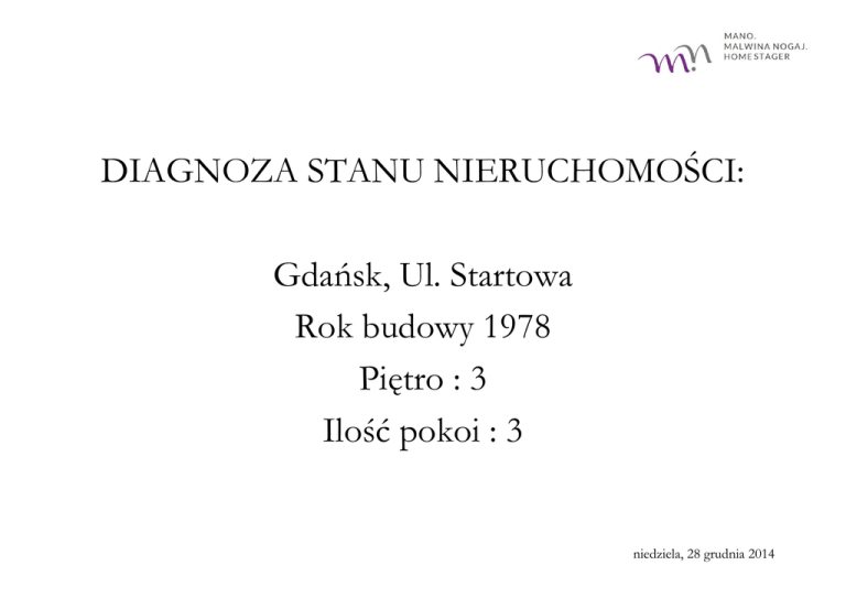DIAGNOZA STANU NIERUCHOMOŚCI: Gdańsk, Ul. Startowa Rok budowy 1978 Piętro : 3 Ilość pokoi : 3 niedziela, 28 grudnia 2014 ZALECENIE OGÓLNE Państwa celem jest sprzedaż nieruchomości. Mieszkanie takie należy zatem doprowadzić do takiego stanu, aby spodobało się większości odbiorów na rynku. Mieszkanie powinno być urządzone wg. aktualnych trendów panujących na rynku. Przede wszystkim powinno być czysto, świeżo i pachnąco. Wszędzie. Okna, parapety, wc, podłogi, umywalki, wanna, prysznic itp. Powinny być umyte. Dywany/wykładziny odkurzone lub w razie konieczności wymienione na nowe. Jeżeli mamy, to ze ścian i mebli należy pozdejmować nasze prywatne zdjęcia, przedmioty kultu religijnego. Nieruchomość należy przygotować tak, jakby Państwo już tam nie mieszkali. niedziela, 28 grudnia 2014 POKÓJ NR 1 ZALECENIA OGÓLNE 1. Malowanie ścian 2. Odkrywamy kaloryfer. Kanapę przestawiamy na prawą ścianę. 3. Kanapę przykryć nową narzutą, nowe poduszki typu „Jaś” 4. Szafę malujemy. Przesuwamy ja na środek ściany. 5. Na szafie ustawiamy kolorowe kartony 6. Na podłogę kładziemy dywanik typu „shaggy” 7. Fotel wynosimy z pokoju 8. Zdejmujemy firanę 9. Na parapecie ustawiamy dekorację niedziela, 28 grudnia 2014 Z szafy ściągamy zbędne kartony Malujemy pokój Zmieniamy firanę Malujemy szafę Nowa narzuta Fotel wynosimy Nowe poduszki Nowy dywan Biurko ustawiamy pod oknem - Element do zmiany niedziela, 28 grudnia 2014 POKÓJ NR 2 ZALECENIA OGÓLNE 1. Malowanie ścian 2. Odkrywamy kaloryfer. 3. Krzesło wynosimy do pokoju nr 1 4. Na regałach robimy porządek i wywalamy niepotrzebne rzeczy 5. Wynosimy wszystkie kartony 6. Na podłogę kładziemy sztuczną skórę 7. Zdejmujemy firanę 8. Wymieniamy lampę 9. Na parapecie ustawiamy dekoracyjnego kwiatka niedziela, 28 grudnia 2014 Wymieniamy lampę Wynosimy kartony Zdejmujemy firanę Wynosimy kartony Na regałach robimy porządek Wynosimy kartony zza szafy Wynosimy krzesło , zmieniamy obicie, wynosimy do pokoju nr 1 i ustawiamy przy biurku W pokoju wieszamy lustro Na podłogę kładziemy dywanik niedziela, 28 grudnia 2014 JADALNIA ZALECENIA OGÓLNE 1. 2. 3. 4. 5. 6. 7. 8. 9. 10. 11. 12. Malowanie rur ( pionów) Nowy karnisz Nowa firana i zasłona Wynosimy kanapę W miejsce kanapy wstawiamy stół z krzesłami Z jadalni wynosimy mikrofalę ( wynosimy z mieszkania) Wynosimy stół ( z mieszkania) Malujemy wyspę i przykręcamy dekoracyjne uchwyty Malujemy lampę Z wiszącej półki ciągamy wszystkie rzeczy i ustawiamy nowe dekoracje Wynosimy dywan Na parapecie ustawiamy dekorację niedziela, 28 grudnia 2014 Malowanie pionów Malowanie lampy Nowa firana i zasłona Usuwam z półki nadmiar dekoracji i wstawiam nowe Wynoszę krzesło i wstawiam do szafy Wynosimy mikrofalę Wynoszę kanapę Sprzątamy wyspę Malujemy wyspę Wynosimy dywan niedziela, 28 grudnia 2014 KUCHNIA ZALECENIA OGÓLNE 1. Malowanie rur ( pionów) 2. Demontuję karnisz 3. Nowa firana 4. Robimy porządek na parapecie 5. Malujemy meble 6. Naklejamy fartuch z tapety 7. Sprzątam kuchenkę 8. Malujemy lampę 9. Malujemy kaloryfer niedziela, 28 grudnia 2014 Malujemy lampę Demontuję karnisz i firany, zakładam zazdroskę Sprzątam kuchenkę Naklejamy tapetę Robimy porządek na parapecie Sprzątamy ze zlewu Malujemy meble lub naklejamy naklejki malujemy kaloryfer niedziela, 28 grudnia 2014 WC ZALECENIA OGÓLNE 1. Malowanie ścian i podłogi 2. Wymiana WC i deski 3. Podklejenie odstających kafli 4. Montaż szafki nad wc 5. Dobieramy odpowiednie akcesoria łazienkowe niedziela, 28 grudnia 2014 Malowanie kafli Szafka nad WC Podklejenie płytek Usunięcie detergentów Malowanie podłogi niedziela, 28 grudnia 2014 ŁAZIENKA ZALECENIA OGÓLNE 1. Malowanie sufitu i kafli 2. Ściągamy suszarkę znad wanny 3. Zmieniamy lustro 4. Usuwamy zbędne akcesoria z półki 5. Czyścimy wannę 6. Usuwamy zbędne rzeczy z pralki 7. Dobieramy odpowiednie akcesoria łazienkowe niedziela, 28 grudnia 2014 Malowanie sufitu Ściągamy suszarkę Malujemy kafle Zmieniamy lustro Usuwamy zbędne rzeczy z półki Dobór akcesoriów Czyścimy wannę Malujemy kafle Usuwamy zbędne rzeczy z pralki niedziela, 28 grudnia 2014 POKÓJ NR 3 ZALECENIA OGÓLNE 1. Malowanie sufitu i kafli 2. Ściągamy suszarkę znad wanny 3. Zmieniamy lustro 4. Usuwamy zbędne akcesoria z półki 5. Czyścimy wannę 6. Usuwamy zbędne rzeczy z pralki 7. Dobieramy odpowiednie akcesoria łazienkowe niedziela, 28 grudnia 2014 Malowanie ścian Pozbywamy się meblościanki Wymiana zasłon i firan na nowe Zdejmujemy obrazy Telewizor przestawiamy w inne miejsce Na fotele nakładamy narzutę i ustawiamy je przy lewej ścianie Zdejmujemy dywan niedziela, 28 grudnia 2014 Kontakt : MALWINA NOGAJ [email protected] tel. : +48 517 436 985 http://wlasnaprzestrzen.wordpress.com/ niedziela, 28 grudnia 2014