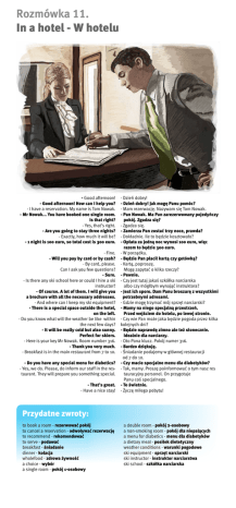 Rozmówka 11. In a hotel - W hotelu - Good afternoon! - Good afternoon! How can I help you? - I have a reservation. My name is Tom Nowak. - Mr Nowak... You have booked one single room. Is that right? - Yes, that’s right. - Are you going to stay three nights? - Exactly, how much it will be? - 1 night is 100 euro, so total cost is 300 euro. - Fine. - Will you pay by card or by cash? - By card, please. Can I ask you few questions? - Sure. - Is there any ski school here or could I hire a ski instructor? - Of course. A lot of them. I will give you a brochure with all the necessary addresses. - And where can I keep my ski equipment? - There is a special space outside the hotel, on the left. - Do you know what will the weather be like within the next few days? - It will be really cold but also sunny. Perfect for skiers. - Here is your key Mr Nowak. Room number 316. - Thank you very much. - Breakfast is in the main restaurant from 7 to 10. - Do you have any special menu for diabetics? - Yes, we do. Please, do inform our staff in the restaurant. They will prepare you something special. - That’s great. - Have a nice stay! - Dzień dobry! - Dzień dobry! Jak mogę Panu pomóc? - Mam rezerwację. Nazywam się Tom Nowak. - Pan Nowak. Ma Pan zarezerwowany pojedyńczy pokój. Zgadza się? - Zgadza się. - Zamierza Pan zostać trzy noce, prawda? - Dokładnie. Ile to będzie kosztowało? - Opłata za jedną noc wynosi 100 euro, więc razem to będzie 300 euro. - W porządku. - Będzie Pan płacił kartą czy gotówką? - Kartą, poproszę. Mogę zapytać o kilka rzeczy? - Pewnie. - Czy jest tutaj jakaś szkółka narciarska albo czy mógłbym wynająć instruktora? - Jest ich sporo. Dam Panu broszurę z wszystkimi potrzebnymi adresami. - Gdzie mogę trzymać mój sprzęt narciarski? - Mamy na niego specjalną przestrzeń. Przed wejściem do hotelu, po lewej stronie. - Czy wie Pan może jaka będzie pogoda przez kilka kolejnych dni? - Będzie naprawdę zimno ale też słonecznie. Idealnie dla narciarzy. - Oto Pana klucz. Pokój numer 316. - Bardzo dziękuję. - Śniadanie podajemy w głównej restauracji od 7 do 10. - Czy macie specjalne menu dla diabetyków? - Tak, mamy. Proszę poinformować o tym nasz res tauracyjny personel. On przygotuje Panu coś specjalnego. - To świetnie. - Życzę miłego pobytu! Przydatne zwroty: to book a room - rezerwować pokój to cancel a reservation - odwoływać rezerwację to recommend - rekomendować to serve - podawać breakfast - śniadanie dinner - kolacja wholefood - zdrowa żywność a choice - wybór a single room - pokój 1-osobowy a double room - pokój 2-osobowy a non-smoking room - pokój dla niepalących a menu for diabetics - menu dla diabetyków a dietary meal - posiłek dietetyczny weather conditions - warunki pogodowe ski equipment - sprzęt narciarski ski instructor - instruktor narciarstwa ski school - szkółka narciarska