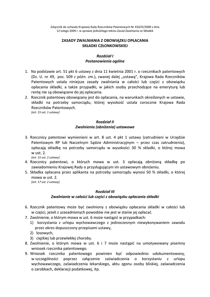 Załącznik do uchwały Krajowej Rady Rzeczników Patentowych Nr 433/IV/2009 z dnia 12 lutego 2009 r. w sprawie jednolitego tekstu Zasad Zwalniania ze Składek ZASADY ZWALNIANIA Z OBOWIĄZKU OPŁACANIA SKŁADKI CZŁONKOWSKIEJ Rozdział I Postanowienia ogólne 1. Na podstawie art. 51 pkt 6 ustawy z dnia 11 kwietnia 2001 r. o rzecznikach patentowych (Dz. U. nr 49, poz. 509 z późn. zm.), zwanej dalej „ustawą”, Krajowa Rada Rzeczników Patentowych ustala niniejsze zasady zwalniania w całości lub części z obowiązku opłacania składki, a także przypadki, w jakich osoby przechodzące na emeryturę lub rentę nie są obowiązane do jej opłacania. 2. Rzecznik patentowy obowiązany jest do opłacania, na warunkach określonych w ustawie, składki na potrzeby samorządu, której wysokość ustala corocznie Krajowa Rada Rzeczników Patentowych. [art. 15 ust. 1 ustawy] Rozdział II Zwolnienia (obniżenia) ustawowe 3. Rzecznicy patentowi wymienieni w art. 8 ust. 4 pkt 1 ustawy (zatrudnieni w Urzędzie Patentowym RP lub Naczelnym Sądzie Administracyjnym – przez czas zatrudnienia), opłacają składkę na potrzeby samorządu w wysokości 30 % składki, o której mowa w ust. 2. [art. 15 ust. 2 ustawy] 4. Rzecznicy patentowi, o których mowa w ust. 3 opłacają obniżoną składkę po zawiadomieniu Krajowej Rady o przysługującym im ustawowym obniżeniu. 5. Składka opłacana przez aplikanta na potrzeby samorządu wynosi 50 % składki, o której mowa w ust. 2. [art. 17 ust. 2 ustawy] Rozdział III Zwalnianie w całości lub części z obowiązku opłacania składki 6. Rzecznik patentowy może być zwolniony z obowiązku opłacania składki w całości lub w części, jeżeli z uzasadnionych powodów nie jest w stanie jej opłacać. 7. Zwolnienie, o którym mowa w ust. 6 może nastąpić w przypadkach: 1) korzystania z urlopu wychowawczego z jednoczesnym niewykonywaniem zawodu przez okres dopuszczony przepisami ustawy, 2) losowych, 3) ciężkiej lub przewlekłej choroby. 8. Zwolnienie, o którym mowa w ust. 6 i 7 może nastąpić na umotywowany pisemny wniosek rzecznika patentowego. 9. Wniosek rzecznika patentowego powinien być odpowiednio udokumentowany, w szczególności poprzez załączenie zaświadczenia o korzystaniu z urlopu wychowawczego, zaświadczenia lekarskiego, aktu zgonu osoby bliskiej, zaświadczenia o zarobkach, deklaracji podatkowej, itp. Rozdział IV Przypadki osób przechodzących na emeryturę lub rentę 10. Składka opłacana na potrzeby samorządu przez osobę pobierającą świadczenie przedemerytalne (bez prawa wykonywania pracy) wynosi 30 % składki, o której mowa w ust. 2. 11. Obniżenie składki, o którym mowa w ust. 10 może nastąpić na umotywowany pisemny wniosek rzecznika patentowego. 12. Wniosek, o którym mowa w ust. 11, powinien być odpowiednio udokumentowany poprzez załączenie dowodu otrzymywania świadczenia przedemerytalnego. 13. Jeżeli osoba, która przeszła na emeryturę lub rentę i otrzymuje świadczenie emerytalne lub rentowe wykonuje zawód rzecznika patentowego, opłaca składkę w pełnej wysokości. 14. Osoby, które przeszły na emeryturę lub rentę i otrzymują świadczenie emerytalne lub rentowe mogą wystąpić z wnioskiem o zwolnienie w całości lub w części z obowiązku opłacania składki rzecznika patentowego w przypadkach: 1) losowych, 2) ciężkiej lub przewlekłej choroby, 3) ukończenia 75 lat. 15. Zwolnienie, o którym mowa w ust. 14 może nastąpić na umotywowany pisemny wniosek rzecznika patentowego, zawierający stosowne oświadczenie o niewykonywaniu zawodu w jakiejkolwiek formie przewidzianej w ustawie. 16. Wniosek, o którym mowa w ust. 14, powinien być odpowiednio udokumentowany poprzez załączenie dowodu otrzymywania świadczenia emerytalnego lub rentowego, zaświadczenia lekarskiego, aktu zgonu osoby bliskiej, zaświadczenia o zarobkach, deklaracji podatkowej, itp. 17. Osoby, które przeszły na emeryturę lub rentę i otrzymują świadczenie emerytalne lub rentowe i złożą oświadczenie następującej treści: „Oświadczam, że w związku z przyznanym mi świadczeniem emerytalnym/rentowym nie wykonuję i nie zamierzam wykonywać zawodu rzecznika patentowego w jakiejkolwiek formie określonej w art. 4 ustawy z dnia 11 kwietnia 2001 r. o rzecznikach patentowych (Dz. U. nr 49 poz. 509 z późn. zmianami). Zobowiązanie to jest trwałe i nie podlega wycofaniu. Przyjmuję do wiadomości, że złożenie oświadczenia niezgodnego z prawdą może spowodować odpowiedzialność przewidzianą w przepisach prawa, a w szczególności odpowiedzialność dyscyplinarną przewidzianą w art. 57 wymienionej ustawy.”, zostają bezterminowo zwolnione w części z opłacania składki członkowskiej i opłacają ją w wysokości 1 zł miesięcznie. Zwolnienie to jest możliwe wyłącznie w przypadku braku zaległości w opłacanych składkach. W przypadku ujawnienia nawet incydentalnego wykonania usługi rzecznikowskiej obniżenie składki traci moc, kwota składek w pełnej wysokości z okresu obniżenia staje się natychmiast wymagalna, zaś o fakcie naruszenia zobowiązania o niewykonywaniu zawodu zostaje natychmiast powiadomiony rzecznik dyscyplinarny. 18. Osoby przechodzące na emeryturę lub rentę nie są obowiązane do opłacania składki dopiero po zwolnieniu ich w całości lub w części z tego obowiązku. Rozdział V Postępowanie w sprawie zwalniania 19. Wniosek o zwolnienie, o którym mowa w rozdziale III i IV, składany jest za pośrednictwem Biura PIRP do powoływanej przez Krajową Radę Rzeczników Patentowych Komisji Wykonywania Zawodu1, która opiniuje go i przedstawia Prezesowi Polskiej Izby Rzeczników Patentowych lub upoważnionemu przez Niego Wiceprezesowi Polskiej Izby Rzeczników Patentowych. 20. Decyzję o zwolnieniu lub obniżeniu składki oraz o rozłożeniu na raty lub umorzeniu zaległej składki podejmuje Prezes Polskiej Izby Rzeczników Patentowych lub upoważniony przez niego Wiceprezes