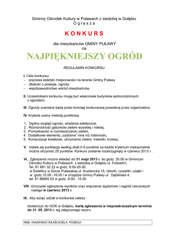 Gminny Ośrodek Kultury w Puławach z siedzibą w Gołębiu Ogłasza KONKURS dla mieszkańców GMINY PUŁAWY na NAJPIĘKNIEJSZY OGRÓD REGULAMIN KONKURSU I. Cele konkursu: poprawa estetyki miejscowości na terenie Gminy Puławy dbałość o posesje, ogrody. współzawodnictwo wśród mieszkańców. II. Uczestnikami konkursu mogą być właściciele budynków jednorodzinnych z ogrodami. III. Ogrody oceniane będą przez komisję konkursową powołaną przez organizatora. IV. Kryteria oceny metodą punktową: 1. 2. 3. 4. 5. Ogólny wygląd ogrodu, wrażenia estetyczne, Różnorodność gatunków zieleni wysokiej i niskiej, Pomysłowość w rozmieszczeniu zieleni, Dodatkowe elementy „ozdobne” inne niż roślinność, Kompozycje kwiatowe, utrzymanie zieleni, trawniki, krzewy, V. Ustala się punktację według skali 0-5 punktów za każde kryterium maksymalnie można otrzymać 25 punktów. Konkurs zostanie rozstrzygnięty w czerwcu 2013 r . VI. Zgłoszenia można składać do 31 maja 2013 r. do godz. 20.00 w Gminnym Ośrodku Kultury w Puławach z siedzibą w Gołębiu ul. Folwarki1, Tel 81 881 32 22 w godz. 8.00-20.00, w Świetlicy w Górze Puławskiej ul. Kozienicka 15, /wtorki, czwartki i piątki / w godz.10.00 -18.00 i w Urzędzie Gminy Puławy ul. Dęblińska 4, tel. 81 88905 03 w godz. 8.00- 15.00 VIII. Uroczyste ogłoszenie wyników oraz wręczenie dyplomów i nagród rzeczowych nastąpi w czerwcu 2013 r. IX. Aby wziąć udział w konkursie należy : dostarczyć do GOK w Gołębiu, kartę zgłoszenia w nieprzekraczalnym terminie do 31. 05. 2013 r. wg załączonego wzoru. IMIĘ I NAZWISKO WŁAŚCICIELA POSESJI ADRES PODPIS WŁAŚCICIELA Oświadczenie : oświadczam, że znam postanowienia regulaminu dotyczące praw autorskich oraz wyrażam zgodę na przetwarzanie moich danych osobowych przez organizatora konkursu do celów promocyjnych TEL. KONTAKTOWY karta do pobrania w GOK w Gołębiu i w Świetlicy GOK w Górze Puławskiej X. Postanowienia końcowe 1. Wszelkie pytania w sprawach konkursu prosimy kierować do GOK w Gołębiu tel. 81 881 32 22, wtorek-sobota w godz. 8.00-20.00 lub na stronę internetową www.golabgok.tnb.pl , 2. Udział w konkursie jest równoznaczny z przyjęciem warunków regulaminu. 3. Wszelkie wątpliwości i spory rozstrzyga komisja konkursowa. Życzymy wszystkim uczestnikom konkursu wielu wrażeń i satysfakcji z podjętych działań na rzecz upiększenia własnego ogrodu.