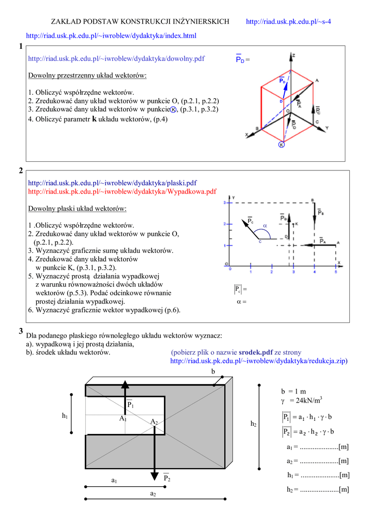 ZAKŁAD PODSTAW KONSTRUKCJI INŻYNIERSKICH http://riad.usk.pk.edu.pl/~s-4 http://riad.usk.pk.edu.pl/~iwroblew/dydaktyka/index.html 1 http://riad.usk.pk.edu.pl/~iwroblew/dydaktyka/dowolny.pdf PD = Dowolny przestrzenny układ wektorów: PD 1. Obliczyć współrzędne wektorów. 2. Zredukować dany układ wektorów w punkcie O, (p.2.1, p.2.2) 3. Zredukować dany układ wektorów w punkcie K , (p.3.1, p.3.2) 4. Obliczyć parametr k układu wektorów, (p.4) D 2 http://riad.usk.pk.edu.pl/~iwroblew/dydaktyka/plaski.pdf http://riad.usk.pk.edu.pl/~iwroblew/dydaktyka/Wypadkowa.pdf Dowolny płaski układ wektorów: 1 .Obliczyć współrzędne wektorów. 2. Zredukować dany układ wektorów w punkcie O, (p.2.1, p.2.2). 3. Wyznaczyć graficznie sumę układu wektorów. 4. Zredukować dany układ wektorów w punkcie K, (p.3.1, p.3.2). 5. Wyznaczyć prostą działania wypadkowej z warunku równoważności dwóch układów wektorów (p.5.3). Podać odcinkowe równanie prostej działania wypadkowej. 6. Wyznaczyć graficznie wektor wypadkowej (p.6). Pc c Pc 3 Dla podanego płaskiego równoległego układu wektorów wyznacz: a). wypadkową i jej prostą działania, b). środek układu wektorów. (pobierz plik o nazwie srodek.pdf ze strony http://riad.usk.pk.edu.pl/~iwroblew/dydaktyka/redukcja.zip) b b =1m = 24kN/m3 P1 h1 A1 A2 h2 P1 a 1 h 1 b P2 a 2 h 2 b a1 = .....................[m] a2 = .....................[m] P2 a1 a2 h1 = .....................[m] h2 = .....................[m] 4 http://riad.usk.pk.edu.pl/~iwroblew/dydaktyka/belki.pdf Rozwiąż podaną belkę. Narysuj wykresy: M, Q, N P = ...............….. [kN] q [kN/m] M[kNm] q = ...............….. [kN/m] M = ...............….. [kNm] B A C D a = ...............….. [m] P[kN] l = ...............….. [m] a l b b = ...............….. [m] 5 http://riad.usk.pk.edu.pl/~iwroblew/dydaktyka/rama.pdf Rozwiąż podaną ramę. Sprawdź równowagę w węzłach B i C ramy. Narysuj wykresy: M, Q, N M[kNm] q[kN/m] B P = ...............….. [kN] C q = ...............….. [kN/m] a M = ...............….. [kNm] a = ...............….. [m] D b = ...............….. [m] P[kN] b A l 2 l = ...............….. [m] http://riad.usk.pk.edu.pl/~iwroblew/dydaktyka/index.html 6 http://riad.usk.pk.edu.pl/~iwroblew/dydaktyka/krata.pdf Wyznaczyć wartości sił w prętach kratownicy statycznie wyznaczalnej przedstawionej na rysunku poniżej: a). metodą analitycznego równoważenia węzłów (slajd 1 – 6). b). metodą przekrojów – Rittera w zaznaczonych prętach (slajd 9 –11). Zaznacz pręty zerowe.(slajd 4 p.2.1) P3[kN] P2[kN] c b P1[kN] a a a P1 = ...............….. [kN] P2 = ...............….. [kN] P3 = ...............….. [kN] a = ...............….. [m] b = ...............….. [m] c = ...............….. [m] 3 7 http://riad.usk.pk.edu.pl/~iwroblew/dydaktyka/zbiezny.pdf Dla podanego układu prętowego wyznacz metodą analityczną i graficzną wartości sił w prętach CA i CB oraz reakcji RA i RB. Dane z zadania nr 6: B P1 = ..................[kN] a = ...................[m] b b = ...................[m] C A P1[kN] a UWAGA! Wszystkie obliczenia napisać ręcznie. Rysunek wypadkowej z zadania 2 p.6 wykonać ręcznie na kartce z bloku technicznego . GRUPA.................. NAZWISKO IMIĘ ....................................................................................................................................... KOREKTY: 4