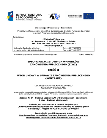 Dla rozwoju Infrastruktury i Środowiska Projekt współfinansowany przez Unię Europejską ze środków Funduszu Spójności w ramach Programu Infrastruktura i Środowisko Zamawiający: „Wodociągi” Sp. z o.o. ul. Reymonta 12 48-340 Głuchołazy, Polska Tel.: +48 774391932 Fax.: +48 774391742 www.wodgluch.pl Jednostka Realizująca Projekt Tel.: +48 774527730 ul. Andersa 94, 48-340 Głuchołazy Fax: +48 774527735 Nr referencyjny nadany sprawie przez Zamawiającego 7/FS/2011/3b/I SPECYFIKACJA ISTOTNYCH WARUNKÓW ZAMÓWIENIA PUBLICZNEGO (SIWZ) CZĘŚĆ II WZÓR UMOWY W SPRAWIE ZAMÓWIENIA PUBLICZNEGO (KONTRAKT) DLA PRZETARGU NIEOGRANICZONEGO NA ROBOTY BUDOWLANE przeprowadzanego zgodnie z postanowieniami ustawy z dnia 29 stycznia 2004 r. Prawo zamówień publicznych (tekst jednolity Dz. U. z 2010 Nr 113, poz. 759 ze zm.) oraz aktów wykonawczych do tej ustawy Zadanie Nr IX - Budowa ujęcia i SUW w Sławniowicach - zadanie 3b, I etap - Budowa ujęcia wody Zadanie jest realizowane w ramach Projektu pn.: „Rozwój i modernizacja gospodarki wodno-ściekowej na terenie gminy Głuchołazy”. Projekt Nr POIS.01.01.00-00-003/08 Zamówienie współfinansowane przez Unię Europejską ze środków Funduszu Spójności w ramach Programu Operacyjnego Infrastruktura i Środowisko 2007 - 2013 Część II SIWZ – Wzór umowy - Kontrakt Spis treści: Rozdział 1 AKT UMOWY ……………………………………………………………………………. 3 Rozdział 2 WARUNKI OGÓLNE KONTRAKTU ……………………………………………. 7 Rozdział 3 WARUNKI SZCZEGÓLNE KONTRAKTU ……………………………………. 8 Rozdział 4 KARTA GWARANCYJNA …………………………………………………………… 42 Zadanie Nr IX - Budowa ujęcia i SUW w Sławniowicach - zadanie 3b, I etap - Budowa ujęcia wody Nr ref. 7/FS/2011/3b/I 2 Część II SIWZ – Wzór umowy - Kontrakt CZĘŚĆ II ROZDZIAŁ 1 FORMULARZ AKTU UMOWY ZAMÓWIENIE FINANSOWANE ZE ŚRODKÓW PUBLICZNYCH (W TYM ZE ŚRODKÓW FUNDUSZU SPÓJNOŚCI) Nazwa i numer zamówienia Zadanie Nr IX - Budowa ujęcia i SUW w Sławniowicach - zadanie 3b, I etap - Budowa ujęcia wody Nr 7/FS/2011/3b/I Zadanie jest realizowane w ramach Projektu pn.: „Rozwój i modernizacja gospodarki wodno-ściekowej na terenie gminy Głuchołazy”. Projekt Nr POIS.01.01.00-00-003/08 KONTRAKT NR: ................ Niniejszy Kontrakt zawarty został pomiędzy: „Wodociągi” Sp. z o.o. adres: ul. Reymonta 12, 48-340 Głuchołazy, Polska (zwanym dalej „Zamawiającym”) z jednej strony, reprezentowanym przez: ........................................................................................................................................ ........................................................................................................................................ a ........................................................................................................................................ ........................................................................................................................................ adres: Zadanie Nr IX - Budowa ujęcia i SUW w Sławniowicach - zadanie 3b, I etap - Budowa ujęcia wody Nr ref. 7/FS/2011/3b/I 3 Część II SIWZ – Wzór umowy - Kontrakt ........................................................................................................................................ ........................................................................................................................................ (zwanym dalej „Wykonawcą”) z drugiej strony, reprezentowanym przez: ........................................................................................................................................ ........................................................................................................................................ Zważywszy, że Zamawiający życzy sobie, aby Roboty, określone jako: Zadanie Nr IX - Budowa ujęcia i SUW w Sławniowicach - zadanie 3b, I etap - Budowa ujęcia wody, zostały wykonane przez Wykonawcę, oraz że przyjął Ofertę Wykonawcy na wykonanie i wykończenie tych Robót oraz usunięcie w nich wszelkich wad, złożoną w ramach postępowania o udzielenie zamówienia przeprowadzonego zgodnie z ustawą - Prawo zamówień publicznych, w trybie przetargu nieograniczonego; Niniejszym ustala się, co następuje: 1. Słowa i wyrażenia użyte w tym Kontrakcie będą miały takie znaczenie, jakie przypisano im w Warunkach Kontraktu, wymienionych poniżej. 2. Następujące dokumenty będą uważane, odczytywane i interpretowane jako integralna część niniejszego Kontraktu, według następującego pierwszeństwa: (a) niniejszy Akt Umowy; (b) Warunki Szczególne Kontraktu (Część II Rozdział 3); (c) Warunki Ogólne Kontraktu (Część II Rozdział 2); (d) Formularz Oferty z Załącznikiem do Oferty; (e) Specyfikacja techniczna wykonania i odbioru robót budowlanych; (f) Dokumentacja projektowa; (g) wyceniony Przedmiar Robót (po korekcie arytmetycznej); (h) Instrukcja dla Wykonawców; (i) Wykaz osób, które będą wykonywać niniejsze zamówienie; (j) Karta Gwarancyjna (Część II Rozdział 4). 3. Wykonawca zobowiązuje się wykonać Roboty oraz usunąć w nich wszelkie wady w pełnej zgodności z postanowieniami Kontraktu. 4. Zamawiający, w uznaniu wykonania Robót oraz usunięcia w nich wad przez Wykonawcę, w terminach i w sposób określony w Kontrakcie, zapłaci Wykonawcy kwotę: Zatwierdzoną Kwotę Kontraktową (włącznie z VAT): ………………..……………………...…[ PLN] Zadanie Nr IX - Budowa ujęcia i SUW w Sławniowicach - zadanie 3b, I etap - Budowa ujęcia wody Nr ref. 7/FS/2011/3b/I 4 Część II SIWZ – Wzór umowy - Kontrakt (słownie: ....................................................................................................................[ PLN] w tym uwzględniono nal