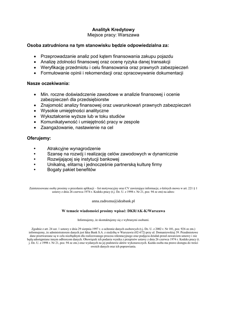 Analityk Kredytowy Miejsce pracy: Warszawa Osoba zatrudniona na tym stanowisku będzie odpowiedzialna za: Przeprowadzanie analiz pod kątem finansowania zakupu pojazdu Analizę zdolności finansowej oraz ocenę ryzyka danej transakcji Weryfikację przedmiotu i celu finansowania oraz prawnych zabezpieczeń Formułowanie opinii i rekomendacji oraz opracowywanie dokumentacji Nasze oczekiwania: Min. roczne doświadczenie zawodowe w analizie finansowej i ocenie zabezpieczeń dla przedsiębiorstw Znajomość analizy finansowej oraz uwarunkowań prawnych zabezpieczeń Wysokie umiejętności analityczne Wykształcenie wyższe lub w toku studiów Komunikatywność i umiejętność pracy w zespole Zaangażowanie, nastawienie na cel Oferujemy: • • • • • Atrakcyjne wynagrodzenie Szansę na rozwój i realizację celów zawodowych w dynamicznie Rozwijającej się instytucji bankowej Unikalną, elitarną i jednocześnie partnerską kulturę firmy Bogaty pakiet benefitów Zainteresowane osoby prosimy o przesłanie aplikacji – list motywacyjny oraz CV zawierające informacje, o których mowa w art. 221 § 1 ustawy z dnia 26 czerwca 1974 r. Kodeks pracy (t.j. Dz. U. z 1998 r. Nr 21, poz. 94 ze zm) na adres: [email protected] W temacie wiadomości prosimy wpisać: DKR/AK-K/Warszawa Informujemy, że skontaktujemy się z wybranymi osobami. Zgodnie z art. 24 ust. 1 ustawy z dnia 29 sierpnia 1997 r. o ochronie danych osobowych (t.j. Dz. U. z 2002 r. Nr 101, poz. 926 ze zm.) informujemy, że administratorem danych jest Idea Bank S.A. z siedzibą w Warszawie (02-672) przy ul. Domaniewskiej 39. Przedmiotowe dane przetwarzane są w celu niezbędnym dla realizowanego procesu rekrutacyjnego oraz podjęcia działań przed zawarciem umowy i nie będą udostępniane innym odbiorcom danych. Obowiązek ich podania wynika z przepisów ustawy z dnia 26 czerwca 1974 r. Kodeks pracy (t. j. Dz. U. z 1998 r. Nr 21, poz. 94 ze zm.) oraz wydanych na jej podstawie aktów wykonawczych. Każda osoba ma prawo dostępu do treści swoich danych oraz ich poprawiania.