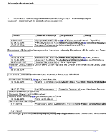 Informacja o konferencjach 1. Informacja o nadchodzących konferencjach bibliologicznych i informatologicznych, krajowych i zagranicznych (w porządku chronologicznym). Termin 3-5.04.2017 20-21.10.2016 10-13.10.2016 Nazwa konferencji Organizator Uwagi Międzynarodowa Konferencja link ILIDE (Innovative Library in Digital Era) IV Międzynarodowa Konferencja KatedraNaukowa Bibliotekoznawstwa "Kulturalink czytelnicza i Informacji młodego Naukowej pok European Conference on Information Literacy (ECIL) Department of Information Management of Haccetepe University, Department of Information and Comm link 14-16.08.2016 3rd Baltic Sea - 17th Nordic Finnish Literacy Reading Conference Asociation, linkTurku, Finland 13-17.06.2016 Libraries in the Digital AgeUniversity (Lida): Digital of Zadar, Library Croatia Curation link and Collections 31.05-1.06.2016 Libraries V4+ in the decoy of the digital age Moravian Library, National Library of the Czech Republic, the Division of Information and Library Studie link 26-27.05.2016 21st annual Conference on Professional Information Resources INFORUM University of Economics, Prague, link Czech Republic 15-15.03.2016 Książka i technologie w przeszłości Instytut Informacji i dziś Naukowej UW ii Polskie StudiówTowarzystwo Bibliologiczn 14-16.03.2016 ilide2016conference Słowackie Centrum Informacji Naukowo-Techniczn Słowacka Biblioteka Chemiczna Słowackie Stowarzyszenie Bibliotekarzy Wydział Nauki Humanistycznych link Uniwersytetu w Žilinie 16-19.02.2016 Kniha ve 21. stoleti Slezska Univerzita v Opave 3-4.12.2015 Współczesny polski system medialny. Procesy tabloidyzacji Instytuti komodyfikacji Dziennikarstwa pols iUn In 2-4.12.2015 Przełamując granice książki. Instytut Perspektywa Informacjitwórcy, Naukowej odbiorcy, i Bibliotekoznawstwa badacza Uniwersytetu Wrocławskieg 1/2 Informacja o konferencjach Link 2. Serwisy informacyjne z wiadomościami o konferencjach Lustro Biblioteki Konferencje naukowe Kalendarz Bibliosfery KNIHA VE 21. STOLETÍKNIHA VE 21. STOLETÍ 2/2