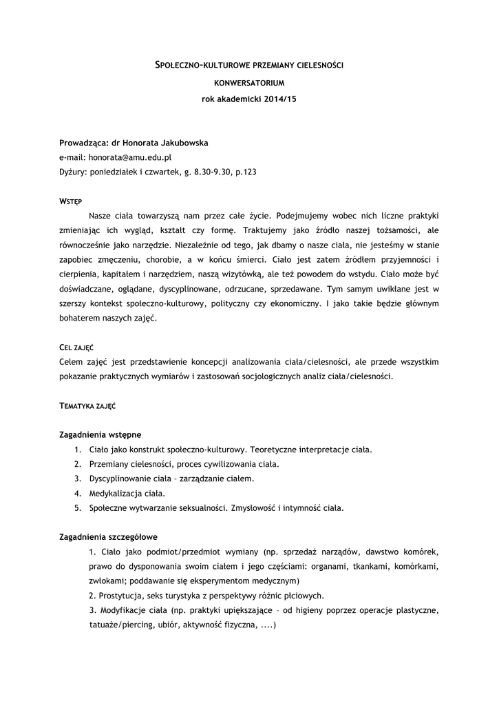SPOŁECZNO-KULTUROWE PRZEMIANY CIELESNOŚCI KONWERSATORIUM rok akademicki 2014/15 Prowadząca: dr Honorata Jakubowska e-mail: [email protected] Dyżury: poniedziałek i czwartek, g. 8.30-9.30, p.123 WSTĘP Nasze ciała towarzyszą nam przez całe życie. Podejmujemy wobec nich liczne praktyki zmieniając ich wygląd, kształt czy formę. Traktujemy jako źródło naszej tożsamości, ale równocześnie jako narzędzie. Niezależnie od tego, jak dbamy o nasze ciała, nie jesteśmy w stanie zapobiec zmęczeniu, chorobie, a w końcu śmierci. Ciało jest zatem źródłem przyjemności i cierpienia, kapitałem i narzędziem, naszą wizytówką, ale też powodem do wstydu. Ciało może być doświadczane, oglądane, dyscyplinowane, odrzucane, sprzedawane. Tym samym uwikłane jest w szerszy kontekst społeczno-kulturowy, polityczny czy ekonomiczny. I jako takie będzie głównym bohaterem naszych zajęć. CEL ZAJĘĆ Celem zajęć jest przedstawienie koncepcji analizowania ciała/cielesności, ale przede wszystkim pokazanie praktycznych wymiarów i zastosowań socjologicznych analiz ciała/cielesności. TEMATYKA ZAJĘĆ Zagadnienia wstępne 1. Ciało jako konstrukt społeczno-kulturowy. Teoretyczne interpretacje ciała. 2. Przemiany cielesności, proces cywilizowania ciała. 3. Dyscyplinowanie ciała – zarządzanie ciałem. 4. Medykalizacja ciała. 5. Społeczne wytwarzanie seksualności. Zmysłowość i intymność ciała. Zagadnienia szczegółowe 1. Ciało jako podmiot/przedmiot wymiany (np. sprzedaż narządów, dawstwo komórek, prawo do dysponowania swoim ciałem i jego częściami: organami, tkankami, komórkami, zwłokami; poddawanie się eksperymentom medycznym) 2. Prostytucja, seks turystyka z perspektywy różnic płciowych. 3. Modyfikacje ciała (np. praktyki upiększające – od higieny poprzez operacje plastyczne, tatuaże/piercing, ubiór, aktywność fizyczna, ....) 4. Cyborgizacja ciała, ucieleśnione technologie (np. protezy/zastawki/soczewki, przeszczepy, nowe technologie, cyberprzestrzeń, ....) 5. Wstyd – tabu – wstręt (np. czego się wstydzimy w odniesieniu do ciała, co jest tabu, co budzi w nas wstręt, fizjologia, np. zapachy ciała, choroba) 6. Nagość prywatna i publiczna (np. nagość w domu, nagość w sieci, mediach, erotyka, pornografia) 7. „Inne” ciała – ich rola i miejsce w kulturze (np. pokazy osobliwości, ciała „inne” w mediach (TLC, talk show)) 8. Przestrzeń i przedmioty projektowane dla ciała (np. ergonomia, adresaci miejsc, „kłopotliwe” cielesności, np. osoby starsze czy niepełnosprawne, wykluczający charakter miejsc) 9. Ciało jako narzędzie oporu i protestu (np. strajki głodowe, nagie protesty, grupa Femen, manifestacje w sporcie, gesty) 10. Dyskursy nie/jedzenia i wagi (problem otyłości, anoreksji, dyskurs zdrowego jedzenia, czy otyłość może być trendy? (Gracjanki), dyskryminacja otyłych?, "terror fitnessu") Jestem również otwarta na inne tematy, problemy, które chcieliby Państwo umówić na zajęciach, które są dla Was ważne czy interesujące. WARUNKI ZALICZENIA 1. Obecność na zajęciach (dopuszczalne są 2 nieobecności). 2. Przygotowanie wraz z zespołem zajęć związanych z jednym z w/w zagadnień szczegółowych. OCENA Podstawą oceny będzie przygotowanie i przeprowadzenie zajęć. W przypadku większej liczby nieobecności niż dopuszczona – konieczność zaliczenia zadanych tekstów lub obniżenie oceny. WYBRANA LITERATURA Banaszak E., Czajkowski P. (red. naukowa) (2010). Corpus delicti. Rozkoszne ciało. Szkice nie tylko z socjologii ciała. Warszawa: Difin. Banaszak E., Czajkowski P., Florkowski R. (2012). Fenomeny kontroli ciała. Diffin Bauman Z. (1995). Ciało i przemoc w obliczu ponowoczesności. Toruń: UMK. Bieńko M. (2013). Intymne i prywatne praktyki codzienności. Warszawa: Wydawnictwa UW. Breczko S. (2013). Polityzacja ciała. Między dyskursem publicznym a teorią socjologiczną. Kraków: Nomos. Buczkowski A. (2005). Społeczne tworzenie ciała. Płeć kulturowa i płeć biologiczna. Kraków: UNIVERSITAS. Ciało cielesne (2011) “Colloquia Anthropologica et Communicativa” . Wrocław: WUW. Czaja D. (red.). (1999) Metamorfozy ciała. Świadectwa i interpretacje. Warszawa: Contago. Drwięga M. (2002). Ciało człowieka. Studium z antropologii filozoficznej. Kraków: Księgarnia Akademicka. Etcoff N. (2000). Przetrwają najpiękniejsi. Warszawa: Wydawnictwo CiS, Wydawnictwo WAB. Foucault M. (1995). Historia seksualności. Warszawa: Czytelnik. --------------- (1993). Nadzorować i karać. Narodziny więzienia. Warszawa: Alatheja-Spacja Habermas J. (2003). Przyszłość natury ludzkiej. Czy zmierzamy do eugeniki liberalnej? Warszawa: Wydawnictwo Naukowe SCHOLAR. Historia życia prywatnego, t.1-5. Praca zbiorowa. Wrocław: Wydawnictwo Ossolineum. Izdebski Z., Ostrowska A. (2003). Seks po polsku. Zachowania seksualne jako element stylu życia Polaków. Warszawa: MUZA. Jakubowska H. (2009). Socjologia ciała. Poznań: Wydawnictwo UAM. Kacperczyk A., Byczkowska D. (red.). (2012). „Przegląd Socjologii Jakościowej”, Tom VIII, nr 2, Ciało w przestrzeni społecznej. Kaczorek M., Stachura K. (red.). (2009). Przemiany seksualności. Gdańsk: Wydawnictwo Uniwersytetu Gdańskiego. Kochanowski J. (2013). Socjologia seksualności. Marginesy. Warszawa: Wydawnictwo Naukowe PWN. Melosik Z. (1996). Tożsamość, ciało i władza teksty kulturowe jako (kon)teksty pedagogiczne. Poznań – Toruń: EDYTOR S.C. Mizielińska J. (2006). Płeć ciało seksualność. Od feminizmu do teorii queer. Kraków: UNIVERSITAS. Praktyki cielesne (2006). J. Kurczewski i in., Warszawa: Trio. Rachwał T., Więckowska K. (red.) (2012). (Nad)użycia ciała w kulturze. Toruń: UMK. Seidmann S. (2012). Społeczne tworzenie seksualności. Warszawa: Wydawnictwo Naukowe PWN. seria „Przygody ciała” wydawnictwo Słowo, obraz, terytoria. Shilling Ch. (2010). Socjologia ciała, Warszawa: Wydawnictwo Naukowe UAM. Szcze
