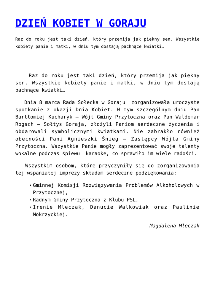 DZIEŃ KOBIET W GORAJU Raz do roku jest taki dzień, który przemija jak piękny sen. Wszystkie kobiety panie i matki, w dniu tym dostają pachnące kwiatki… Raz do roku jest taki dzień, który przemija jak piękny sen. Wszystkie kobiety panie i matki, w dniu tym dostają pachnące kwiatki… Dnia 8 marca Rada Sołecka w Goraju zorganizowała uroczyste spotkanie z okazji Dnia Kobiet. W tym szczególnym dniu Pan Bartłomiej Kucharyk – Wójt Gminy Przytoczna oraz Pan Waldemar Rogsch – Sołtys Goraja, złożyli Paniom serdeczne życzenia i obdarowali symbolicznymi kwiatkami. Nie zabrakło również obecności Pani Agnieszki Śnieg – Zastępcy Wójta Gminy Przytoczna. Wszystkie Panie mogły zaprezentować swoje talenty wokalne podczas śpiewu karaoke, co sprawiło im wiele radości. Wszystkim osobom, które przyczyniły się do zorganizowania tej wspaniałej imprezy składam serdeczne podziękowania: Gminnej Komisji Rozwiązywania Problemów Alkoholowych w Przytocznej, Radnym Gminy Przytoczna z Klubu PSL, Irenie Mleczak, Danucie Walkowiak oraz Paulinie Mokrzyckiej. Magdalena Mleczak img_2960 img_2961 img_2963 img_2968 img_2969 img_2970 img_2974 img_2983 img_3018 img_3024 img_3027 img_3029 img_3033 img_3042 img_3046 img_3047