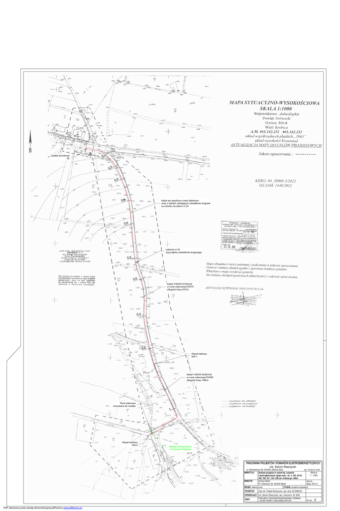 2,4 Szafka licznikowa SL 1 0,5 0,5 0,6 Kabel we wspólnym rowie kablowym wraz z kablem zasilającym oświetlenie drogowe na odcinku do latarni nr 24 0, 6 Latarnia nr 24 wg projektu oświetlenia drogowego 0,5 0,6 Kabel YAKXS 4x70mm2 w rurze osłonowej DVK75 (długość trasy 437m) 0,5 0,6 Węzeł kablowy WK-1 Kabel YAKXS 4x25mm2 w rurze osłonowej DVK50 (długość trasy 168m) Rura osłonowa mocowana do mostka 1 Węzeł kablowy WK-2 Miejsce skrzyżowania z Krobickim Potokiem inż. Zenon Rzeczycki ul. Mickiewicza 26, 58-500 Jelenia Góra tel. 75 64 21 016 SKALA 1 : 1000 Gmina Mirsk Pl. Wolności 39, 59-630 Mirsk elektryczna DATA : lipiec 2012 r. projekt budowlany mgr inż. Paweł Rzeczycki, upr. proj. Nr 9/98/JG inż. Zenon Rzeczycki, upr. rzeczozn. Nr 3/94 PROJEKT ZAGOSPODAROWANIA TERENU - PLAN TRASY LINII KABLOWYCH PDF stworzony przez wersję demonstracyjną pdfFactory www.pdffactory.pl/ Nr rys. 2