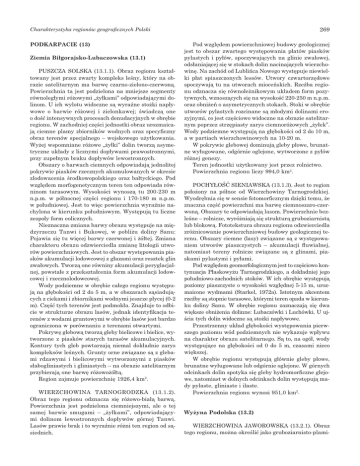 269 Charakterystyka regionów geograficznych Polski PODKARPACIE (13) Ziemia Biłgorajsko-Lubaczowska (13.1) PUSZCZA SOLSKA (13.1.1). Obraz regionu kształtowany jest przez zwarty kompleks leśny, który na obrazie satelitarnym ma barwę czarno-zielono-czerwoną. Powierzchnia ta jest podzielona na mniejsze segmenty równoległymi różowymi „żyłkami” odpowiadającymi dolinom. U ich wylotu widoczne są wyraźne stożki napływowe o barwie różowej i zielonkawej; świadczą one o dość intensywnych procesach denudacyjnych w obrębie regionu. W zachodniej części jednostki obraz urozmaicają ciemne plamy zbiorników wodnych oraz specyficzny obraz terenów specjalnego – wojskowego użytkowania. Wyżej wspomniane różowe „żyłki” dolin tworzą asymetryczne układy z licznymi dopływami prawostronnymi, przy zupełnym braku dopływów lewostronnych. Obszary o barwach ciemnych odpowiadają jednolitej pokrywie piasków rzecznych akumulowanych w okresie zlodowacenia środkowopolskiego oraz bałtyckiego. Pod względem morfogenetycznym teren ten odpowiada równinom tarasowym. Wysokości wynoszą tu 200-230 m n.p.m. w północnej części regionu i 170-180 m n.p.m. w południowej. Jest to więc powierzchnia wyraźnie nachylona w kierunku południowym. Występują tu liczne zespoły form eolicznych. Nieznaczna zmiana barwy obrazu występuje na międzyrzeczu Tanwi i Bukowej, w pobliżu doliny Sanu: Pojawia się tu więcej barwy czerwonej i żółtej. Zmiana charakteru obrazu odzwierciedla zmianę litologii utworów powierzchniowych. Jest to obszar występowania piasków akumulacji lodowcowej z głazami oraz resztek glin zwałowych. Tworzą one równiny akumulacji peryglacjalnej, powstałe z przekształcenia form akumulacji lodowcowej i rzecznolodowcowej. Wody podziemne w obrębie całego regionu występują na głębokości od 2 do 5 m, a w obszarach sąsiadujących z ciekami i zbiornikami wodnymi jeszcze płycej (0-2 m). Część tych terenów jest podmokła. Znajduje to odbicie w strukturze obrazu lasów, jednak identyfikacja terenów z wodami gruntowymi w obrębie lasów jest bardzo ograniczona w porównaniu z terenami otwartymi. Pokrywę glebową tworzą gleby bielicowe i bielice, wytworzone z piasków starych tarasów akumulacyjnych. Kontury tych gleb powtarzają niemal dokładnie zarys kompleksów leśnych. Grunty orne związane są z glebami rdzawymi i bielicowymi wytworzonymi z piasków słabogliniastych i gliniastych – na obrazie satelitarnym przybierają one barwę różowożółtą. Region zajmuje powierzchnię 1926,4 km2. WIERZCHOWINA TARNOGRODZKA (13.1.2). Obraz tego regionu odznacza się różowo-białą barwą. Powierzchnia jest podzielona ciemniejszymi, ale o tej samej barwie smugami – „żyłkami”, odpowiadającymi dolinom lewostronnych dopływów górnej Tanwi. Lasów prawie brak i to wyraźnie różni ten region od sąsiednich. Pod względem powierzchniowej budowy geologicznej jest to obszar zwartego występowania płatów piasków pylastych i pyłów, spoczywających na glinie zwałowej, odsłaniającej się w stokach dolin nacinających wierzchowinę. Na zachód od Lublińca Nowego występuje niewielki płat spiaszczonych lessów. Utwory czwartorzędowe spoczywają tu na utworach mioceńskich. Rzeźba regionu odznacza się równoleżnikowym układem form pozytywnych, wznoszących się na wysokość 220-250 m n.p.m. oraz obniżeń o asymetrycznych stokach. Stoki w obrębie utworów pylastych rozcinane są młodymi dolinami erozyjnymi, co jest częściowo widoczne na obrazie satelitarnym poprzez strzępiasty zarys ciemnoróżowych „żyłek”. Wody podziemne występują na głębokości od 2 do 10 m, a w partiach wierzchowinowych na 10-20 m. W pokrywie glebowej dominują gleby płowe, brunatne wyługowane, odgórnie oglejone, wytworzone z pyłów różnej genezy. Teren jednostki użytkowany jest przez rolnictwo. Powierzchnia regionu liczy 994,0 km2. POCHYŁOŚĆ SIENIAWSKA (13.1.3). Jest to region położony na północ od Wierzchowiny Tarnogrodzkiej. Wyodrębnia się w sensie fotomorficznym dzięki temu, że znaczna część powierzchni ma barwę ciemnoszaro-czerwoną. Obszary te odpowiadają lasom. Powierzchnie bezleśne – rolnicze, wyróżniają się strukturą gruboziarnistą lub blokową. Fototekstura obrazu regionu odzwierciedla zróżnicowanie powierzchniowej budowy geologicznej terenu. Obszary ciemne (lasy) związane są z występowaniem utworów piaszczystych – akumulacji fluwialnej, natomiast tereny rolnicze związane są z glinami, piaskami pylastymi i pyłami. Pod względem geomorfologicznym jest to częściowo kontynuacja Płaskowyżu Tarnogrodzkiego, a dokładniej jego południowo-zachodnich stoków. W ich obrębie występują poziomy piaszczyste o wysokości względnej 5-15 m, urozmaicone wydmami (Starkel, 1972a). Istotnym akcentem rzeźby są stopnie tarasowe, którymi teren opada w kierunku doliny Sanu. W obrębie regionu zaznaczają się dwa większe obniżenia dolinne: Lubaczówki i Luchówki. U ujścia tych dolin widoczne są stożki napływowe. Przestrzenny układ głębokości występowania pierwszego poziomu wód podziemnych nie wykazuje wpływu na charakter obrazu satelitarnego. Są to, na ogół, wody występujące na głębokości od 0 do 5 m, czasami nieco większej. W obrębie regionu występują głównie gleby płowe, brunatne wyługowane lub odgórnie oglejone. W górnych odcinkach dolin spotyka się gleby hydromorficzne glejowe, natomiast w dolnych odcinkach dolin występują mady pylaste, gliniaste i ilaste. Powierzchnia regionu wynosi 951,0 km2. Wyżyna Podolska (13.2) WIERZCHOWINA JAWOROWSKA (13.2.1). Obraz tego regionu, można określić jako gruboziarnisto-plami- 270 sty o barwie różowo-żółto-białej. Występują tu również ciemne plamy – lasów oraz drobne plamki niebieskozielone. Region tylko częściowo mieści się w terytorium Polski. Pod względem geomorfologicznym jest on kontynuacją Płaskowyżu Tarno