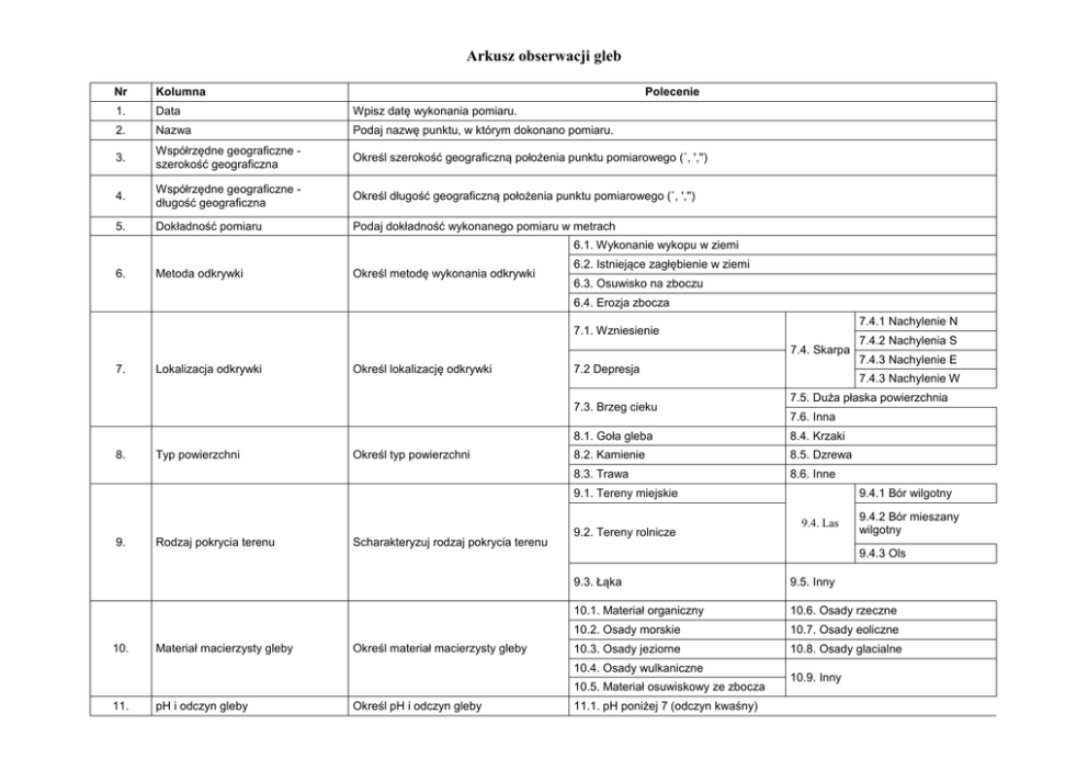 Arkusz obserwacji gleb Nr Kolumna Polecenie 1. Data Wpisz datę wykonania pomiaru. 2. Nazwa Podaj nazwę punktu, w którym dokonano pomiaru. 3. Współrzędne geograficzne szerokość geograficzna Określ szerokość geograficzną położenia punktu pomiarowego (˚, ','') 4. Współrzędne geograficzne długość geograficzna Określ długość geograficzną położenia punktu pomiarowego (˚, ','') 5. Dokładność pomiaru Podaj dokładność wykonanego pomiaru w metrach 6.1. Wykonanie wykopu w ziemi 6. Metoda odkrywki Określ metodę wykonania odkrywki 6.2. Istniejące zagłębienie w ziemi 6.3. Osuwisko na zboczu 6.4. Erozja zbocza 7.4.1 Nachylenie N 7.1. Wzniesienie 7.4. Skarpa 7. Lokalizacja odkrywki Określ lokalizację odkrywki 7.2 Depresja 7.3. Brzeg cieku 8. Typ powierzchni Określ typ powierzchni 7.4.3 Nachylenie W 7.6. Inna 8.4. Krzaki 8.2. Kamienie 8.5. Dzrewa 8.3. Trawa 8.6. Inne 9.1. Tereny miejskie 9. Rodzaj pokrycia terenu Scharakteryzuj rodzaj pokrycia terenu 7.4.3 Nachylenie E 7.5. Duża płaska powierzchnia 8.1. Goła gleba 9.2. Tereny rolnicze 7.4.2 Nachylenia S 9.4.1 Bór wilgotny 9.4. Las 9.4.2 Bór mieszany wilgotny 9.4.3 Ols 10. Materiał macierzysty gleby Określ materiał macierzysty gleby 9.3. Łąka 9.5. Inny 10.1. Materiał organiczny 10.6. Osady rzeczne 10.2. Osady morskie 10.7. Osady eoliczne 10.3. Osady jeziorne 10.8. Osady glacialne 10.4. Osady wulkaniczne 10.5. Materiał osuwiskowy ze zbocza 11. pH i odczyn gleby Określ pH i odczyn gleby 11.1. pH poniżej 7 (odczyn kwaśny) 10.9. Inny 11.2. pH 7 (odczyn obojętny) 11.3. pH powyżej 7 (odczyn zasadowy) 12. 13. 14. 15. 16. Określ wilgotność gleby dla trzech pozimów odkrywki (0 - 10 cm); (10 - 20 cm); (20 -30 cm) 12.1. Wilgotna Określ strukturę gleby dla trzech pozimów odkrywki (0 - 10 cm); (10 - 20 cm); (20 -30 cm) 13.1. Ziarnista 13.4. Gruzełkowata 13.2. Bryłowata 13.5. Kolumnowa 13.3. Pryzmatyczna 13.6. Nieznana Określ główne barwy gleby osobno dla trzech pozimów odkrywki (0 - 10 cm); (10 - 20 cm); (20 -30 cm) 14.1 Określ główny kolor gleby Barwa gleby 15.1. Luźna Konsystencja gleby Określ konsystencję gleby osobno dla trzech pozimów odkrywki (0 - 10 cm); (10 - 20 cm); (20 -30 cm) Wilgotność gleby Struktura gleby Tekstura gleby Określ teksturę gleby osobno dla trzech pozimów odkrywki (0 - 10 cm); (10 - 20 cm); (20 -30 cm) 12.2. Średnio wilgotna 12.3. Sucha 14.2 Określ drugi kolor gleby 15.2. Krucha 15.3. Zbita 15.4. Bardzo zbita 15.5. Nieznana 16.1. Piaszczysto - ilasta 16.9. Muł gliniasty 16.2. Piaszczysto - gliniano - ilasta 16.10. Gliniasty piasek 16.3. Piaszczysto gliniasta 16.11. Piasek 16.4. Mulisto - ilasta 16.12. Muł 16.5. Mulisto - ilasto - gliniasta 16.13. Ił 16.6. Glina 16.14. Ił gliniasty 16.7. Pył 16.15. Nieznana 16.8. Organiczna 16.16. Inna 17.1. Brak 17. Obecnośc korzeni Określ obecnośc korzeni w glebie osobno dla trzech pozimów odkrywki (0 - 17.2. Kilka 10 cm); (10 - 20 cm); (20 -30 cm) 17.3. Dużo 18. Obecnośc kamieni 18.1. Brak Określ obecnośc kamieni w glebie osobno dla trzech pozimów odkrywki (0 - 18.2. Kilka 10 cm); (10 - 20 cm); (20 -30 cm) 18.3. Dużo 19. Obecnośc węglanów 19.1. Brak Określ zawartość węglanów w glebie osobno dla trzech pozimów odkrywki (0 - 19.2. Mała 10 cm); (10 - 20 cm); (20 -30 cm) 19.3. Duża 20. Zdjęcie poziomu Wpisz nazwe pliku 20.1 Fotografia pierwszego poziomu odkrywki (0-10 cm) 20.2 Fotografia drugiego poziomu odkrywki (10-20 cm) 20.3 Fotografia trzeciego poziomu odkrywki (20-30 cm)