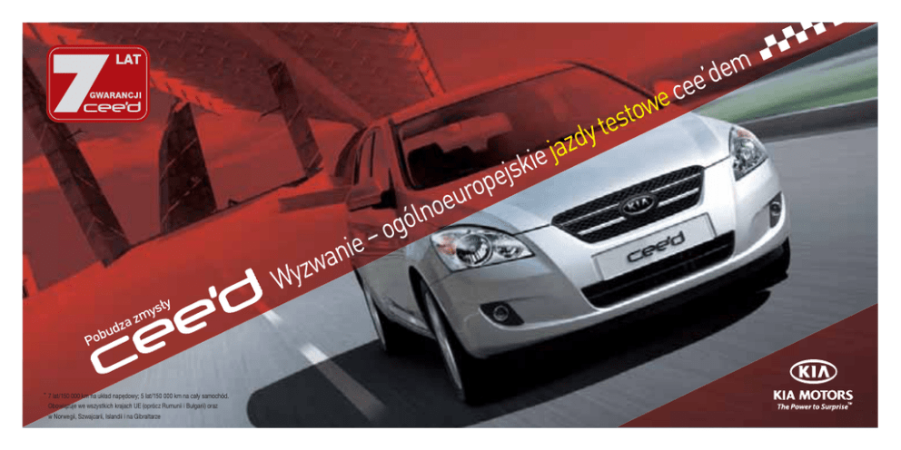 anie w z Wy y ysł zm a udz Pob * 7 lat/150 000 km na układ napędowy; 5 lat/150 000 km na cały samochód. Obowiązuje we wszystkich krajach UE (oprócz Rumunii i Bułgarii) oraz w Norwegii, Szwajcarii, Islandii i na Gibraltarze kie s j e rop u e ólno g o – em d ’ e ce e w esto t y jazd d. graj wy ym i ow yścig zd Sp j ja róbu Kię cee' łn zupe rive D t s n Te a e p Euro rze w to y na wą ie no ge n e l l Cha 7-letnia gwarancja na Kię cee’d * 7 lat/150 000 km na układ napędowy; 5 lat/150 000 km na cały samochód. Obowiązuje we wszystkich krajach UE (oprócz Rumunii i Bułgarii) oraz w Norwegii, Szwajcarii, Islandii i na Gibraltarze Europejski zespół i europejski samochód Zaprojektowana i wyprodukowana w Europie, Kia cee’d spełnia wszystkie wymagania europejskiego rynku. Hatchback to dopiero początek. Gama modeli cee’d powiększy się we wrześniu 2007 roku o sportowe kombi, a w grudniu 2007 roku o sportowego (3drzwiowego) hatchbacka. Otwórz się na nowe możliwości cee’d jest przygodą, której każdy powinien doświadczyć. Zarówno dla tych, którzy przedkładają styl i osiągi, jaki i dla tych, którzy wymagają funkcjonalności i ekonomiki eksploatacji – ponieważ cee’d nie uznaje kompromisów. W całej Europie pisma motoryzacyjne przyjęły cee’da tak jak żaden inny samochód. Udaj się na jazdę próbną cee’dem i podziel się swoimi wrażeniami! Dzięki modelowi cee’d Kia pokazała, że naprawdę spełnia przesłanie swego sloganu firmowego „The Power to Surprise – Zdolność Zaskakiwania”. Wyzwanie – ogólnoeuropejskie jazdy testowe cee’dem Jako dowód znaczenia, jakie przykładamy do modelu cee’d, stworzyliśmy prawdziwe wyzwanie – ogólnoeuropejskie jazdy testowe, pierwszą taką imprezę w Europie. Każdy, kto uda się na jazdę próbną cee’dem do końca lipca 2007, zarejestruje się na stronie www.kia-ceed.com, wypełni ankietę dotyczącą wrażeń z jazdy, odpowie na pytania konkursowe i poda indywidualny numer biletu, będzie miał szansę na wzięcie udziału w imprezie finałowej 19 września 2007 roku i uczestnictwo w kursie bezpiecznej jazdy na torze wyścigowym Formuły 1 Hockenheim w Niemczech oraz na wygranie nowego cee’da. Wyzwanie – ogólnoeuropejskie jazdy testowe cee’dem To jedyna szansa w życiu, by zmierzyć się na torze ze zwycięzcami z 29 krajów europejskich! Nasi instruktorzy zapoznają Cię z zasadami jazdy i pokażą, jak wykorzystywać wszystkie możliwości samochodu! Naucz się panować nad pojazdem w każdej sytuacji drogowej, zmierz się z kierowcami z 29 krajów Europy o tytuł Europejskiego Kierowcy Testowego cee’da roku 2007 i wygraj nowego cee’da! A więc pospiesz się, udaj się do najbliższego dealera – który wręczy Ci bilet z indywidualnym numerem uczestnika – i weź udział w tym niezwykłym ogólnoeuropejskim konkursie – nie zapomnij zachęcić rodziny i znajomych, by również się zarejestrowali! Niech wygra najlepszy kierowca! Panie i Panowie, prosimy na start! Więcej informacji znajdziesz na stronie www.kia-ceed.com Pieczątka dealera Konkurs „Wyzwanie – ogólnoeuropejskie jazdy testowe ceed’em” kończy się 31 lipca 2007 roku www.kia-ceed.com Uczestnictwo w konkursie jest dobrowolne i będzie miało miejsce wyłącznie po spełnieniu wymagań regulaminu. Pracownicy Kia Motors Polska Sp. z o.o. lub jakiejkolwiek firmy dealerskiej w Europie i ich krewni, nie mogą brać udziału w konkursie. Obowiązują przepisy regulaminu konkursu.