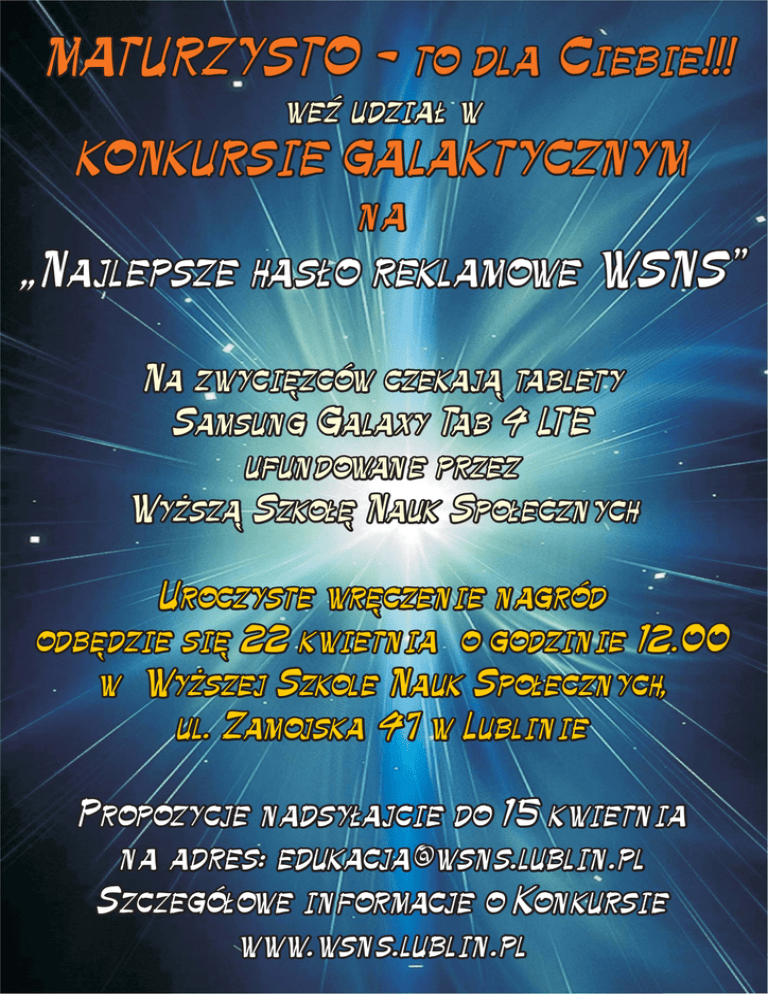 MATURZYSTO - to dla Ciebie!!! weź udział w KONKURSIE GALAKTYCZNYM na „Najlepsze hasło reklamowe WSNS” Na zwycięzców czekają tablety Samsung Galaxy Tab 4 LTE ufundowane przez Wyższą Szkołę Nauk Społecznych Uroczyste wręczenie nagród odbędzie się 22 kwietnia o godzinie 12.00 w Wyższej Szkole Nauk Społecznych, ul. Zamojska 47 w Lublinie nadsyłajcie łajcie do 15 kwietnia Propozycje nadsy na adres: [email protected] Szczegółowe informacje o Konkursie www.wsns.lublin.pl