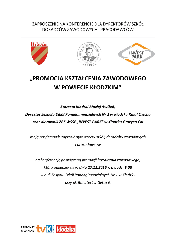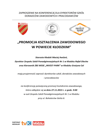 ZAPROSZENIE NA KONFERENCJĘ DLA DYREKTORÓW SZKÓŁ DORADCÓW ZAWODOWYCH I PRACODAWCÓW „PROMOCJA KSZTAŁCENIA ZAWODOWEGO W POWIECIE KŁODZKIM” Starosta Kłodzki Maciej Awiżeń, Dyrektor Zespołu Szkół Ponadgimnazjalnych Nr 1 w Kłodzku Rafał Olecha oraz Kierownik ZBS WSSE „INVEST-PARK” w Kłodzku Grażyna Cal mają przyjemność zaprosić dyrektorów szkół, doradców zawodowych i pracodawców na konferencję poświęconą promocji kształcenia zawodowego, która odbędzie się w dniu 27.11.2015 r. o godz. 9:00 w auli Zespołu Szkół Ponadgimnazjalnych Nr 1 w Kłodzku przy ul. Bohaterów Getta 6. PARTONAT MEDIALNY PROGRAM KONFERENCJI „Promocja kształcenia zawodowego w powiecie kłodzkim” 27.11.2015 – Zespół Szkół Ponadgimnazjalnych Nr 1 w Kłodzku, aula budynku C (1 piętro) 9:00 – Rozpoczęcie konferencji 9:15 – Informacja o egzaminie maturalnym 9:30 – Egzamin potwierdzający kwalifikacje w zawodzie - obszary kształcenia zawodowego 9:45 – Praktyki zawodowe - drogi rozwoju zawodowego oraz możliwości uzyskania dodatkowych kwalifikacji; program Erasmus+ 10:00 – Przeciętne wynagrodzenie w poszczególnych zawodach 10:15 – 10:30 – przerwa kawowa 10:30 – „Głos pracodawców” - Rynek pracy: 1. Wałbrzyska Specjalna Strefa Ekonomiczna „INVEST-PARK” sp. z o.o. 2. POLIAMID PLASTICS – branża tworzyw sztucznych 3. RAPMET Zakład Wyrobów Metalowych – branża metalowa 4. KPM Meble Kłodzko sp. z o.o. – branża meblarska 5. PPC MACHELA sp. z o.o. – branża spożywcza 6. Agnieszka Jagiełło – proces rekrutacji i selekcji pracowników 7. LEROY MERLIN POLSKA sp. z o.o. – programy rozwojowe dla pracowników 11:15 – Edukacja zawodowa w gimnazjach i formy jej realizacji 11:30 – Klaster „Invest in Edu” – informacja o działalności klastra 11:45 – Film WSSE 11:50 – Dyskusja, wnioski i propozycje na przyszłość 12:30 – Zakończenie konferencji Prosimy o potwierdzenie uczestnictwa w konferencji do dnia 23.11.2015 r. mailowo na adres: [email protected] lub telefonicznie: (74) 867 24 13.