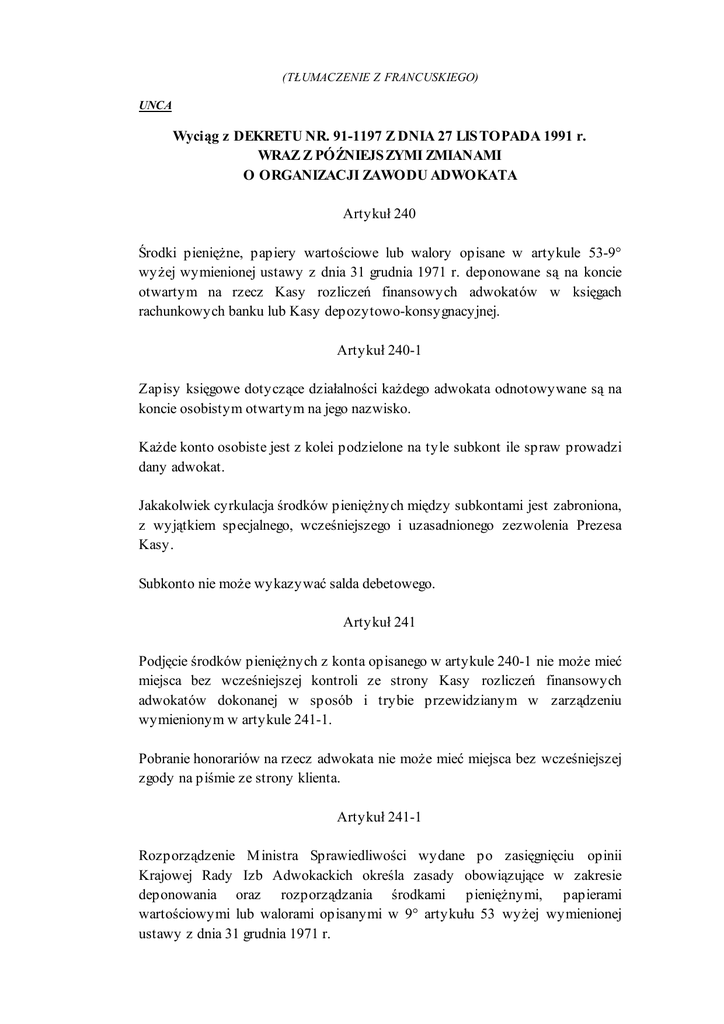 (TŁUMACZENIE Z FRANCUSKIEGO) UNCA Wyciąg z DEKRETU NR. 91-1197 Z DNIA 27 LIS TOPADA 1991 r. WRAZ Z PÓŹNIEJS ZYMI ZMIANAMI O ORGANIZACJI ZAWODU ADWOKATA Artykuł 240 Środki pieniężne, papiery wartościowe lub walory opisane w artykule 53-9° wyżej wymienionej ustawy z dnia 31 grudnia 1971 r. deponowane są na koncie otwartym na rzecz Kasy rozliczeń finansowych adwokatów w księgach rachunkowych banku lub Kasy depozytowo-konsygnacyjnej. Artykuł 240-1 Zapisy księgowe dotyczące działalności każdego adwokata odnotowywane są na koncie osobistym otwartym na jego nazwisko. Każde konto osobiste jest z kolei podzielone na tyle subkont ile spraw prowadzi dany adwokat. Jakakolwiek cyrkulacja środków pieniężnych między subkontami jest zabroniona, z wyjątkiem specjalnego, wcześniejszego i uzasadnionego zezwolenia Prezesa Kasy. Subkonto nie może wykazywać salda debetowego. Artykuł 241 Podjęcie środków pieniężnych z konta opisanego w artykule 240-1 nie może mieć miejsca bez wcześniejszej kontroli ze strony Kasy rozliczeń finansowych adwokatów dokonanej w sposób i trybie przewidzianym w zarządzeniu wymienionym w artykule 241-1. Pobranie honorariów na rzecz adwokata nie może mieć miejsca bez wcześniejszej zgody na piśmie ze strony klienta. Artykuł 241-1 Rozporządzenie M inistra Sprawiedliwości wydane po zasięgnięciu opinii Krajowej Rady Izb Adwokackich określa zasady obowiązujące w zakresie deponowania oraz rozporządzania środkami pieniężnymi, papierami wartościowymi lub walorami opisanymi w 9° artykułu 53 wyżej wymienionej ustawy z dnia 31 grudnia 1971 r. 2 Artykuł 241-2 Izba lub Izby Adwokackie, przy których powołano Kasę wyznaczają na okres sześciu lat rewidenta księgowego wybranego z listy wumienionej w artykule 219 ustawy nr. 66-537 z dnia 24 lipca 1966 r. o spółkach handlowych, i spełniającego wymogi wyboru przepisane w artykule 30 wyżej wymienionej ustawy z dnia 10 lipca 1991 r. Czynności kontrolne przeprowadzane przez wybranego w ten sposób rewidenta księgowego dotyczą przestrzegania przez Kasę wszystkich zasad oraz zobowiązań określonych w niniejszym dekrecie i rozporządzeniu wymienionym w artykule 241-1. Rewident księgowy może zażądać wglądu do wszelkich dokumentów oraz informacji użytecznych dla swojej misji. Sporządza on co roku odnośny raport. Jego adresatami są komisja opisana w artykule 241-3, Prokurator Generalny przy Sądzie Apelacyjnym, we właściwości którego znajduje się siedziba Kasy, Dziekan lub Dziekani Izb Adwokackich, przy której ustanowiona jest Kasa. Artykuł 241-3 Powołana zostaje Komisja kontrolna czuwająca nad przestrzeganiem przez Kasy rozliczeń finansowych adwokatów zasad i zobowiązań opisanych w niniejszym dekrecie oraz w rozporządzeniu wymienionym w artykule 241-1. W skład tej Komisji wchodzi Prezes Krajowej Rady Izb Adwokackich, Dziekan Izby Adwokackiej w Paryżu, Prezes Konferencji Dziekanów Izb Adwokackich, Prezes Krajowego Zrzeszenia Kas Adwokatów. Każdy z nich wyznacza zastępcę wybranego pośród organu, którego reprezentuje. Komisja wybiera swojego Prezesa oraz członka mającego zastępować Prezesa, w razie gdy takowy będzie nieobecny lub niedysponowany. W przypadku rozstrzygający. równości głosów przy głosowaniu, głos Prezesa jest Komisja może z własnej inicjatywy wystąpić o pomoc techniczną świadczoną ze strony jakiejkolwiej osoby wskazanej w rozporządzeniu M inistra Sprawiedliwości. Komisja sporządza swój wewnętrzny regulamin. 3 Artykuł 241-4 Komisja może w dowolnej chwili, zwłaszcza po zbadaniu raportu sporządzonego przez rewidentów księgowych, przekazywać opinie lub zalecenia do wiadomości kas. M oże również w dowolnej chwili bądź z urzędu bądź na wniosek Dziekana Izby Adwokackiej lub Prokuratora Generalnego przy Sądzie Apelacyjnym, we właściwości którego znajduje się siedziba Kasy, przeprowadzić lub nakazać przeprowadzenie kontroli Kas za pośrednictwem jednego lub kilku wyznaczonych przez siebie adwokatów. Tak wybrani adwokaci nie mogą być członkami Izby lub Izb Adwokackich, przy których ustanowiona jest Kasa. M ogą oni za zgodą Komisji korzystać z pomocy jednej lub wielu wybranych przez siebie osób. Kasy zobowiązane są do przekazywania im wszelkich dokumentów, jakie uznają za niezbędne do pełnienia swojej misji. Po ich zbadaniu sporządzają raport. Jego adresatami są komisja opisana w artykule 241-3, Prokurator Generalny przy Sądzie Apelacyjnym, we właściwości którego znajduje się siedziba Kasy, Dziekan lub Dziekani Izb Adwokackich, przy których ustanowiona jest Kasa. Artykuł 241-5 Jeżeli raport wykazuje uchybienia zasadom i obowiązkom opisanym w niniejszym dekrecie, bądź w rozporządzeniu wymienionym w artykule 241-1, wówczas Komisja może bądź z urzędu bądź na wniosek Prokuratora Generalnego przy Sądzie Apelacyjnym, we właściwości którego znajduje się siedziba Kasy, podjąć jeden ze środków opisanych w artykule 241-6. Dziekan lub Dziekani Izb Adwokackich oraz Prezes Kasy wezwani zostają listem poleconym ze zwrotnym potwierdzeniem odbioru do złożenia swoich uwag. M ają w tym celu miesiąc czasu. 4 Artykuł 241-6 Komisji kontrolnej przysługuje prawo do wydawania opinii oraz zaleceń. M oże ona również nakazać Kasom położyć kres uchybieniom opisanym w artykule 241-5. Czuwa ona nad wypełnianiem zobowiązań opisanych w artykule 237-1 ustęp 2. W przypadku niedbalstwa ze strony organów zarządzających Kasą, ryzyka nieudostępnienia zdeponowanych środków pieniężnych, papierów wartościowych i walorów lub uchybienia zasadom przydzielania dochodów finansowych opisanym w artykule 235-1, Komisja kontrolna może wyznaczyć, na okres nie przekraczający jednego roku z możliwością jednorazowego przedłużenia, adwokata do udzielania pomocy Prezesowi Kasy. W ten sposób wyznaczony adwokat nie może być członkiem Izby lub Izb Adwokackich, przy k