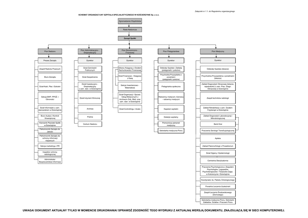 Załącznik nr 1.1. do Regulaminu organizacyjnego SCHEMAT ORGANZACYJNY SZPITALA SPECJALISTYCZNEGO W KOŚCIERZYNIE Sp. z o.o. Zgromadzenie Wspólników Rada Nadzorcza Zarząd Spółki Pion Nadzoru Pion Administracyjno Eksploatacyjny Pion Ekonomiczno Finansowy Pion Pielęgniarstwa Pion Medyczny Prezes Zarządu Dyrektor Dyrektor Dyrektor Dyrektor Zespół Radców Prawnych Dział Zamówień Publicznych Główny Księgowy z Działem Rachunkowości Finansowej Oddziały Szpitala i Zakłady (pielęgniarki i położne) Oddziały Szpitala (lekarze) Biuro Zarządu Dział Zaopatrzenia Dział Finansowo - Księgowy z Kasą Przychodnia Przyszpitalna z poradniami (pielęgniarki i położne) Przychodnia Przyszpitalna z poradniami (lekarze) Dział Kadr, Płac i Szkoleń Dział Inwestycyjno Eksploatacyjny z zam. stan. w Dzierżążnie Sekcja Inwentarzowo Materiałowa Pielęgniarka społeczna Zakład Diagnostyki Obrazowej (lekarze, rejestratorki) z zam. Prac. Diagn. Obrazowej w Dzierżążnie Sekcja BHP, PPOŻ. i Obroności Dział Inżynierii Klinicznej Dział Organizacji i Sprzed. Usług Medycznych z Archiwum Dok. Med. oraz zam. stan. w Dzierżążnie Ratownicy medyczni, kierowcy - ratownicy medyczni Zespół techników radiologii Dział Informatyki z zam. stanowiskiem w Dzierżążnie Archiwa Dział Controllingu i Analiz Kapelani szpitalni Zakład Rehabilitacji z zam. Działem Fizjoterapii w Dzierżążnie Biuro Audytu i Kontroli Wewnętrznej Pralnia Dietetyk szpitalny Zakład Diagnostyki Laboratoryjnej i Mikrobiologicznej Kierownik Placówki Spółki w Dzierżążnie Centum Nadzoru Pomocniczy personel medyczny Bank Krwi Sekretarka medyczna Pionu Pracownia Serologii Transfuzjologicznej Pełnomocnik Zarządu ds. Jakości Pełnomocnik Zarządu ds. ochrony informacji niejawnych Apteka Sekcja marketingu i PR Zaklad Patomorfologii z Prosektorium Inspektor ochrony radiologicznej Dział Higieny i Epidemiologii Administrator Bezpieczeństwa Informacji Centralnia Sterylizatornia Pracownia Psychologiczna z Zespołem Psychologów, Logopedów, Psychoterapeutów i Terpeutów Zajęc. w Kościerzynie i Dzierżążnie Koordynator ds. Pakietu Onkologicznego Poradnia Leczenia Uzależnień Zespół Leczenia Środowiskowego (Domowego) Sekretarka medyczna Pionu, Sekretarki Zakładów, Działów i Pracowni Pionu UWAGA! DOKUMENT AKTUALNY TYLKO W MOMENCIE DRUKOWANIA! SPRAWDŹ ZGODNOŚĆ TEGO WYDRUKU Z AKTUALNĄ WERSJĄ DOKUMENTU, ZNAJDUJĄCĄ SIĘ W SIECI KOMPUTEROWEJ.