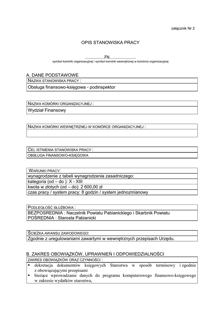 załącznik Nr 2 OPIS STANOWISKA PRACY ...................FN.......................... symbol komórki organizacyjnej / symbol komórki wewnętrznej w komórce organizacyjnej A. DANE PODSTAWOWE NAZWA STANOWISKA PRACY : Obsługa finansowo-księgowa - podinspektor NAZWA KOMÓRKI ORGANIZACYJNEJ : Wydział Finansowy NAZWA KOMÓRKI WEWNĘTRZNEJ W KOMÓRCE ORGANIZACYJNEJ : CEL ISTNIENIA STANOWISKA PRACY : OBSŁUGA FINANSOWO-KSIĘGOWA W ARUNKI PRACY: wynagrodzenie z tabeli wynagrodzenia zasadniczego: kategoria (od – do ): X - XIII kwota w złotych (od – do): 2 600,00 zł czas pracy / system pracy: 8 godzin / system jednozmianowy PODLEGŁOŚĆ SŁUŻBOWA : BEZPOSREDNIA : Naczelnik Powiatu Pabianickiego i Skarbnik Powiatu POŚREDNIA : Starosta Pabianicki ŚCIEŻKA AWANSU ZAWODOWEGO: Zgodnie z uregulowaniami zawartymi w wewnętrznych przepisach Urzędu. B. ZAKRES OBOWIĄZKÓW, UPRAWNIEŃ I ODPOWIEDZIALNOŚCI ZAKRES OBOWIĄZKÓW ORAZ CZYNNOŚCI : dekretacja dokumentów księgowych Starostwa w sposób terminowy i zgodnie z obowiązującymi przepisami bieżące wprowadzanie danych do programu komputerowego finansowo-księgowego w zakresie wydatków starostwa, bieżące i systematyczne uzgadnianie syntetyki, analityk oraz sprawozdań zamieszczonych w programie komputerowym z odpowiednimi zestawieniami i dokumentami sporządzanymi w formie ręcznej, rozliczanie wydatków ze środków pochodzących z budżetu Unii Europejskiej, dochodzenie nadmiernie lub nienależnie pobranych środków pochodzących: z budżetu Unii Europejskiej, ze źródeł zagranicznych, niepodlegających zwrotowi, innych niż wymienione w lit. a. wypełnianie obowiązków w zakresie kontroli finansowej w celu nie dopuszczenia do uszczuplenia wpływów należnych Skarbowi Państwa, Powiatowi Pabianickiemu, zamieszczanie na bieżąco zgodnie z przepisami wszelkich informacji dotyczących finansów powiatu w biuletynie informacji publicznej, terminowe regulowanie zobowiązań jednostki sektora finansów publicznych, w celu uniknięcia zapłaty odsetek, kar lub opłat, wykazywanie w sprawozdaniach budżetowym i innych, których obowiązek sporządzania wynika z innych przepisów prawa - danych zgodnych z danymi wynikającymi z ewidencji księgowej, dokładna weryfikacja opisu faktur, rachunków oraz innych dyspozycji z których wynika uruchamianie środków (pełny opis powinien zawierać informację na temat realizowanego zadania w zakresie podania podstawy prawnej, kto dane zadanie realizował, w zakresie remontów i inwestycji czy dane zadanie zostało zakończone i przyjęte na stan do ewidencji) prowadzenie rejestrów zakupów i sprzedaży dla celów rozliczenie podatku VAT, prowadzenie rozliczeń podatku VAT z Urzędem Skarbowym, przestrzeganie terminów wynikających z obowiązujących przepisów prawa dotyczących opłacania przez jednostkę sektora finansów publicznych, podatku od towarów i usług VAT, opłacanie w kwotach wynikających z prawidłowego ich obliczenia oraz sporządzanie miesięcznych deklaracji VAT-7 zgodnie z obowiązującymi przepisami, przygotowywanie wniosków o wydanie interpretacji podatkowych w zakresie podatku VAT, bezpośredni kontakt i współpraca z Urzędem Skarbowym w zakresie podatku VAT, wykonywanie prac związanych z oceną i wydzieleniem dokumentacji archiwalnej oraz niearchiwalnej przeznaczonej do brakowania, prowadzenie korespondencji wynikającej z prowadzonych spraw, właściwe przechowywanie dokumentów w czasie godzin pracy i po jej zakończeniu oraz ich archiwowanie, kontrola pod względem formalnym i rachunkowym dokumentów finansowo-księgowych oraz rozliczanie delegacji służbowych zgodnie z obowiązującymi przepisami, obsługa komputera, wykonywanie innych prac wynikających z bieżącej pracy wydziału oraz z poleceń przełożonych, udział w pracach związanych z planowaniem budżetu powiatu pabianickiego oraz informacją opisową z wykonania budżetu zgodnie z obowiązującymi przepisami. sprawdzanie i rozliczanie udzielanych dotacji przez Starostwo Powiatowe przygotowanie projektów uchwał Rady i Zarządu na podstawie otrzymanych wniosków rejestrowanie uchwał Rady i Zarządu w Biuletynie Informacji Publicznej terminowe rozliczanie przekazanej z budżetu powiatu dotacji, w tym ewentualne ustalenie kwoty dotacji podlegającej zwrotowi do budżetu oraz jej zwrot w terminach wynikających z obowiązujących przepisów prawa, wydatkowanie dotacji zgodnie z przeznaczeniem określonym przez udzielającego dotację, ZAKRES UPRAWNIEŃ SŁUŻBOWYCH I UPRAWNIEŃ ZWIĄZANYCH Z DANYM STANOWISKIEM : ZAKRES ODPOWIEDZIALNOŚCI : 1. DOKONYWANIE STAŁEJ SAMOKONTROLI WYKONYWANEJ PRZEZ SIEBIE PRACY W OPARCIU O BIEŻĄCĄ ZNAJOMOŚĆ OBOWIĄZUJĄCYCH PRZEPISÓW USTAWY O RACHUNKOWOŚCI I FINANSACH PUBLICZNYCH ORAZ INNYCH WYNIKAJĄCYCH Z CHARAKTERU WYKONYWANYCH OBOWIĄZKÓW . 2. PONOSZENIE PEŁNEJ ODPOWIEDZIALNOŚĆ ZA WYNIKI SWOJEJ PRACY. 3. PONOSZENIE ODPOWIEDZIALNOŚCI SŁUŻBOWEJ I KARNEJ ZA PRAWIDŁOWE, ZGODNE Z PRAWEM I TERMINOWE WYKONANIE ZADAŃ WYMIENIONYCH W NINIEJSZYM ZAKRESIE CZYNNOŚCI ORAZ PRZESTRZEGANIE OBOWIĄZKÓW WYNIKAJĄCYCH Z PRZEPISÓW KODEKSU PRACY, REGULAMINU ORGANIZACYJNEGO STAROSTWA POWIATOWEGO W PABIANICACH ORAZ UCHWAŁ I ZARZĄDZEŃ RADY POWIATU, ZARZĄDU POWIATU I STAROSTY PABIANICKIEGO. DOSTĘP DO INFORMACJI NIEJAWNYCH : Zgodnie z uregulowaniami zawartymi w wewnętrznych przepisach Urzędu. DOSTĘP DO DANYCH OSOBOWYCH : Zgodnie z uregulowaniami zawartymi w wewnętrznych przepisach Urzędu. C. WYMAGANIA KWALIFIKACYJNE WYKSZTAŁCENIE : KONIECZNE : W YKSZTAŁCENIE ŚREDNIE O KIERUNKU EKONOMICZNYM LUB UKOŃCZONY KURS W ZAKRESIE KSIĘGOWOŚCI DODATKOWE: DOŚWIADCZENIE ZAWODOWE: WYMAGANE OSOBY Z DOŚWIADCZENIEM PRZYNAJMNIEJ TRZY LATA STAŻU PRACY W ZAKRESIE KSIĘGOWOŚCI UPRAWNIENIA KWALIFIKACYJNE LUB ZAWODOWE : WYMAGANA WIEDZA SPECJALISTYCZNA : Konieczna : Znajomość ustawy o rachunkowości i finansach publicznych, zasad rozliczania środków pozyskanych m.in. z fun
