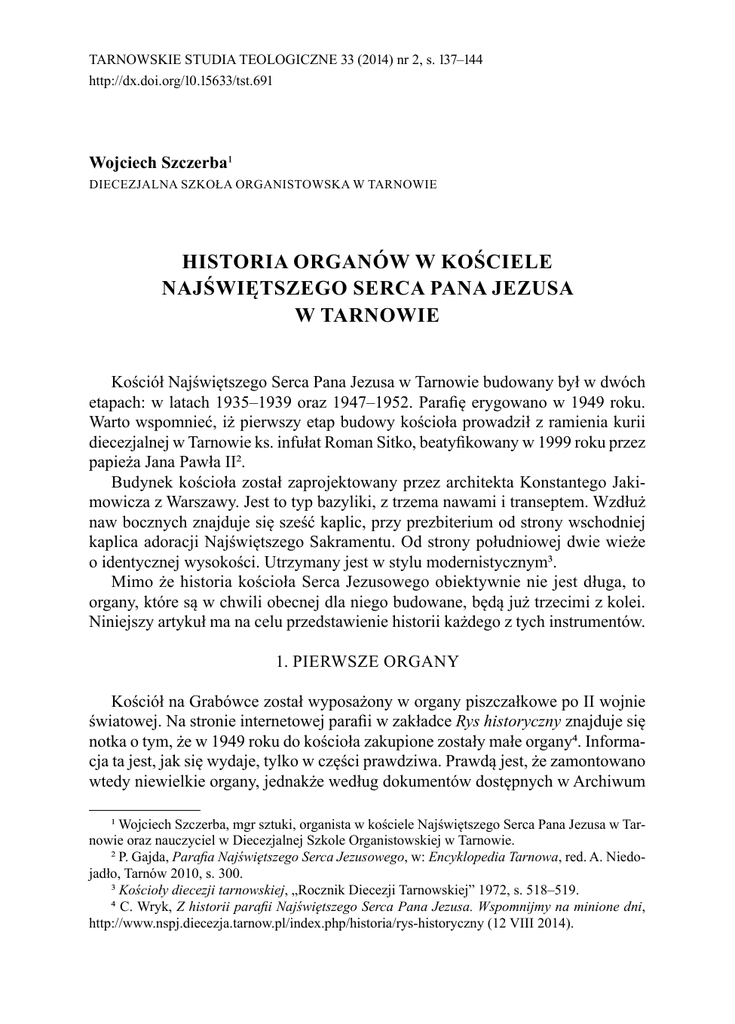 TARNOWSKIE STUDIA TEOLOGICZNE 33 (2014) nr 2, s. 137–144 http://dx.doi.org/10.15633/tst.691 Wojciech Szczerba1 DIECEZJALNA SZKOŁA ORGANISTOWSKA W TARNOWIE HISTORIA ORGANÓW W KOŚCIELE NAJŚWIĘTSZEGO SERCA PANA JEZUSA W TARNOWIE Kościół Najświętszego Serca Pana Jezusa w Tarnowie budowany był w dwóch etapach: w latach 1935–1939 oraz 1947–1952. Parafię erygowano w 1949 roku. Warto wspomnieć, iż pierwszy etap budowy kościoła prowadził z ramienia kurii diecezjalnej w Tarnowie ks. infułat Roman Sitko, beatyfikowany w 1999 roku przez papieża Jana Pawła II2. Budynek kościoła został zaprojektowany przez architekta Konstantego Jakimowicza z Warszawy. Jest to typ bazyliki, z trzema nawami i transeptem. Wzdłuż naw bocznych znajduje się sześć kaplic, przy prezbiterium od strony wschodniej kaplica adoracji Najświętszego Sakramentu. Od strony południowej dwie wieże o identycznej wysokości. Utrzymany jest w stylu modernistycznym3. Mimo że historia kościoła Serca Jezusowego obiektywnie nie jest długa, to organy, które są w chwili obecnej dla niego budowane, będą już trzecimi z kolei. Niniejszy artykuł ma na celu przedstawienie historii każdego z tych instrumentów. 1. PIERWSZE ORGANY Kościół na Grabówce został wyposażony w organy piszczałkowe po II wojnie światowej. Na stronie internetowej parafii w zakładce Rys historyczny znajduje się notka o tym, że w 1949 roku do kościoła zakupione zostały małe organy4. Informacja ta jest, jak się wydaje, tylko w części prawdziwa. Prawdą jest, że zamontowano wtedy niewielkie organy, jednakże według dokumentów dostępnych w Archiwum 1 Wojciech Szczerba, mgr sztuki, organista w kościele Najświętszego Serca Pana Jezusa w Tarnowie oraz nauczyciel w Diecezjalnej Szkole Organistowskiej w Tarnowie. 2 P. Gajda, Parafia Najświętszego Serca Jezusowego, w: Encyklopedia Tarnowa, red. A. Niedojadło, Tarnów 2010, s. 300. 3 Kościoły diecezji tarnowskiej, „Rocznik Diecezji Tarnowskiej” 1972, s. 518–519. 4 C. Wryk, Z historii parafii Najświętszego Serca Pana Jezusa. Wspomnijmy na minione dni, http://www.nspj.diecezja.tarnow.pl/index.php/historia/rys-historyczny (12 VIII 2014). 138 Wojciech Szczerba Diecezjalnym w Tarnowie organy te zostały dla parafii Serca Jezusowego wypożyczone, a nie zakupione5. Przybliżymy zatem historię tego instrumentu. Z dostępnych źródeł wynika, że wspomniane organy zostały wybudowane przez firmę Ignacego i Aleksandra Żebrowskich ze Lwowa dla tamtejszego kościoła Sercanek (Sacré Coeur) w 1882 roku6. Posiadały one 12 głosów. Po drugiej wojnie światowej siostry musiały opuścić Lwów. Udało im się wtedy wywieźć do Polski organy, które znalazły się następnie w klasztorze w Zbylitowskiej Górze. Stamtąd zostały one wypożyczone do kościoła Najświętszego Serca Pana Jezusa w Tarnowie, gdzie grały do roku 19687, kiedy to Tadeusz Rajkowski rozpoczynał pracę nad nowym instrumentem. Z kościoła na Grabówce organy trafiły do parafii Paszyn koło Nowego Sącza, gdzie zamontowali je Bronisław Kaltenbeck i Bronisław Narolski8. Właśnie z Paszyna pochodzą informacje na temat tego instrumentu, znajdujące się w Archiwum Diecezjalnym w Tarnowie. Według ankiety organowej sporządzonej w 1971 roku dyspozycja organów była następująca9: Manuał I Pryncypał 8’ (z adnotacją: zastępczy napis) Gamba 8’ Salizional 8’ Burdon 8’ (z adnotacją: zastępczy napis) Rohrflöt 4’ Picolo 2’ Pedał Czelo Subbas Manuał II (z adnotacją, że wszystkie napisy są zastępcze) Flet otwarty 4’ Violin 8’ Szpigflet 8’ [sic!] Flet 4’ 8’ (z adnotacją: zastępczy napis) 16’ Instrument ten posiadał mechaniczną trakturę gry i wiatrownice klapowo-zasuwowe10. Obecnie jest on nadal używany w parafii Paszyn11. 2. ORGANY TADEUSZA RAJKOWSKIEGO Jak już wcześniej wspomniano, w latach sześćdziesiątych XX wieku firma Tadeusza Rajkowskiego z Włocławka rozpoczęła prace nad nowymi organami piszczałkowymi dla kościoła Najświętszego Serca Pana Jezusa w Tarnowie. Prawdopodobnie Rajkowski składał trzy oferty na wykonanie instrumentu dla tej parafii. 5 Archiwum Diecezji Tarnowskiej, Ankieta dotycząca organów [w Paszynie], teczka Akta rzeczowe Kurii Diecezjalnej w Tarnowie. Wydział Muzyki Kościelnej. Ankieta dotycząca organów, sygn. ARz 119; L.dz. 552/VI-1/3/71. 6 M. Babnis, Kultura organowa Galicji, Słupsk 2012, s. 414. 7 Archiwum Diecezji Tarnowskiej, Ankieta…, dz. cyt. 8 M. Babnis, Kultura…, dz. cyt., s. 414. 9 Archiwum Diecezji Tarnowskiej, Ankieta…, dz. cyt. 10 Tamże. 11 Według relacji ustnej P. Pasternaka. Historia organów w kościele Najświętszego Serca… 139 Zachowały się tylko dwie, ale o istnieniu jeszcze jednej świadczy fakt, że oferta z 1964 roku jest oznaczona numerem 2. Projekt ten nie został zrealizowany12. Warto wspomnieć, że miały to być organy 50-głosowe, o trakturze elektro-pneumatycznej. Projekt dyspozycji przedstawiał się następująco13: Manuał I Bourdon 16’ Pryncypał 8’ Flet jasny 8’ Gemshorn 8’ Oktawa 4’ Flet leśny 4’ Flet koniczny 2’ Kwinta 2⅔’ Mixtura 4ch Trompet 8’ Pedał Pryncypałbas Violon Echobas Oktawbas Salicet Fletbas Chorał Kwinta Róg Mixtura Puzon Manuał II Kryty pomorski 8’ Pryncypał flet 8’ Flet otwarty 8’ Salicet 8’ Pryncypał włoski 4’ Rurflet 4’ Nasard 2⅔’ Dublet 2’ Picolo 1’ Kornet 4ch Klarnet 8’ Siflet 1’ Cymbel 3ch Vox humana 8’ Pryncypał serafon 8’ Flet podwójny serafon 8’ Rurflet serafon 4’ Róg serafon 2’ Manuał III Kwintadena Prync. skrzypcowy Viola gamba Unda maris Pryncyp. włoski Flet śpiewny Dubeltflet Blcflet [sic!] Róg nocny Kwi[n]ta śpiewna Tercflet 8’ 8’ 8’ 8’ 4’ 4’ 4’ 2’ 2’ 1⅓’ 1⅗’ 16’ 16’ 16’ 8’ 8’ 8’ 4’ 5⅓’ 2’ 3ch 16’ Ciekawostką tego projektu były tzw. serafony, czyli głosy grające na wyższym ciśnieniu. Rajkowski przewidywał dla n