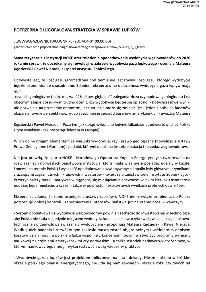 www.gazownictwo.wnp.pl 2014-04-04 POTRZEBNA DŁUGOFALOWA STRATEGIA W SPRAWIE ŁUPKÓW . .,WWW.GAZOWNICTWO.WNP.PL (2014-04-04 00:00:00) gazownictwo.wnp.pl/potrzebna-dlugofalowa-strategia-w-sprawie-lupkow,222620_1_0_0.html Sama rezygnacja z instytucji NOKE oraz zniesienie opodatkowania wydobycia węglowodorów do 2020 roku nie sprawi, że doczekamy się rewolucji w zakresie wydobycia gazu łupkowego - oceniają Mateusz Kędzierski i Paweł Nierada, eksperci Instytutu Sobieskiego. Oczywiste jest, że ilość gazu zgromadzona pod ziemią nie jest równa ilości gazu, którego wydobycie będzie ekonomicznie uzasadnione. Zdaniem ekspertów na opłacalność wydobycia gazu wpływ mają m.in. czynniki geologiczne (m.in. miąższość łupków, głębokość zalegania złoża czy budowa geologiczna) i na obecnym etapie poszukiwań trudno ocenić, czy wydobycie będzie się opłacało. - Dotychczasowe wyniki nie pozwalają na przesadny optymizm, lecz sytuacja może się zmienić, jeśli jeden z polskich basenów okaże się równie perspektywiczny, co zasobniejsze spośród basenów amerykańskich - uważają Mateusz Kędzierski i Paweł Nierada. - Poza tym jak dotąd wykonano jedynie kilkadziesiąt odwiertów (choć Polska z tym wynikiem i tak pozostaje liderem w Europie). W ich opinii drugim elementem są warunki wydobycia, czyli prawo geologiczne (nowelizacja ustawy Prawo Geologiczne i Górnicze) i podatki, którymi obłożona jest eksploatacja i sprzedaż węglowodorów. Nie jest prawdą, że spór o NOKE - Narodowego Operatora Kopalin Energetycznych (wzorowana na rozwiązaniach norweskich państwowa instytucja, która miała w zamyśle posiadać udziały w każdej koncesji na terenie Polski) i wysokość opodatkowania wydobywanych kopalin były głównymi czynnikami zrażającymi zagranicznych i krajowych inwestorów - twierdzą przedstawiciele Instytutu Sobieskiego. Przyczyn należy raczej upatrywać w ciągnącej się miesiącami niepewności w jakim kierunku ostatecznie podążać będą regulacje, a czasem także w po prostu niekorzystnych wynikach próbnych odwiertów. Eksperci są zdania, że samo usunięcie z ustawy zapisów o NOKE nie rozwiąże problemu, bo Polska potrzebuje dobrej kontroli i zabezpieczenia interesów państwa już na etapie poszukiwawczym. - System opodatkowania wydobycia węglowodorów powinien zachęcać do inwestowania w technologie, aby Polska nie stała się jedynie miejscem wydobycia kopalin, ale stworzyła swoją własną bazę naukowotechniczną i przemysłową związaną z wydobyciem - proponują Mateusz Kędzierski i Paweł Nierada. Według nich badania i rozwój w tym zakresie muszą zostać objęte pełnym i wieloletnim odpisem kosztów działalności, a polskie władze wspólnie z koncernami powinny stworzyć programy wymiany naukowej z uczelniami amerykańskimi czy norweskimi, a także ośrodek badawczo-wdrożeniowy, w którym naukowcy będą mogli wykorzystywać swoją wiedzę w praktyce. - Wydobycie gazu z łupków jest projektem obliczonym na lata i dekady. Nie zmieni ono w krótkim okresie polskiego bilansu energetycznego, nie uda się nam również w okresie roku czy dwóch lat www.gazownictwo.wnp.pl 2014-04-04 stworzyć bazy naukowej i technologicznej stanowiącej fundament rodzimego nowoczesnego przemysłu wydobywczego - mówią eksperci Instytutu Sobieskiego. Ich zdaniem jedynie długofalowa i kompleksowa strategia wydobycia gazu z łupków, łącząca aspekty prawny, fiskalny, przemysłowy i naukowotechnologiczny pozwoli na pełne wykorzystanie przez Polskę szansy, którą ten projekt z sobą niesie. Oczywiste jest, że ilość gazu zgromadzona pod ziemią nie jest równa ilości gazu, którego wydobycie będzie ekonomicznie uzasadnione. Zdaniem ekspertów na opłacalność wydobycia gazu wpływ mają m.in. czynniki geologiczne (m.in. miąższość łupków, głębokość zalegania złoża czy budowa geologiczna) i na obecnym etapie poszukiwań trudno ocenić, czy wydobycie będzie się opłacało. - Dotychczasowe wyniki nie pozwalają na przesadny optymizm, lecz sytuacja może się zmienić, jeśli jeden z polskich basenów okaże się równie perspektywiczny, co zasobniejsze spośród basenów amerykańskich - uważają Mateusz Kędzierski i Paweł Nierada. - Poza tym jak dotąd wykonano jedynie kilkadziesiąt odwiertów (choć Polska z tym wynikiem i tak pozostaje liderem w Europie). W ich opinii drugim elementem są warunki wydobycia, czyli prawo geologiczne (nowelizacja ustawy Prawo Geologiczne i Górnicze) i podatki, którymi obłożona jest eksploatacja i sprzedaż węglowodorów. Nie jest prawdą, że spór o NOKE - Narodowego Operatora Kopalin Energetycznych (wzorowana na rozwiązaniach norweskich państwowa instytucja, która miała w zamyśle posiadać udziały w każdej koncesji na terenie Polski) i wysokość opodatkowania wydobywanych kopalin były głównymi czynnikami zrażającymi zagranicznych i krajowych inwestorów - twierdzą przedstawiciele Instytutu Sobieskiego. Przyczyn należy raczej upatrywać w ciągnącej się miesiącami niepewności w jakim kierunku ostatecznie podążać będą regulacje, a czasem także w po prostu niekorzystnych wynikach próbnych odwiertów. Eksperci są zdania, że samo usunięcie z ustawy zapisów o NOKE nie rozwiąże problemu, bo Polska potrzebuje dobrej kontroli i zabezpieczenia interesów państwa już na etapie poszukiwawczym. - System opodatkowania wydobycia węglowodorów powinien zachęcać do inwestowania w technologie, aby Polska nie stała się jedynie miejscem wydobycia kopalin, ale stworzyła swoją własną bazę naukowotechniczną i przemysłową związaną z wydobyciem - proponują Mateusz Kędzierski i Paweł Nierada. Według nich badania i rozwój w tym zakresie muszą zostać objęte pełnym i wieloletnim odpisem kosztów działalności, a polskie władze wspólnie z koncernami powinny stworzyć programy wymiany naukowej z uczelniami amerykańskimi czy norweskimi, a takż