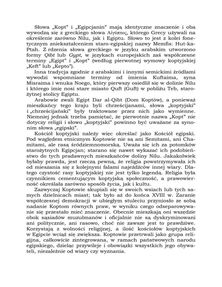 Słowa „Kopt” i „Egipcjanin” mają identyczne znaczenie i oba wywodzą się z greckiego słowa Αἰγύπτος, którego Grecy używali na określenie zarówno Nilu, jak i Egiptu. Słowo to jest z kolei fonetycznym zniekształceniem staro-egipskiej nazwy Memfis: Hut-kaPtah. Z rdzenia słowa greckiego w języku arabskim utworzono formy Qibt lub Gypt, w językach europejskich zaś współczesne terminy „Egipt” i „Kopt” (według pierwotnej wymowy koptyjskiej „Keft” lub „Kepto”). Inna tradycja zgodnie z arabskimi i innymi semickimi źródłami wywodzi wspomniane terminy od imienia Kuftaima, syna Misraima i wnuka Noego, który pierwszy osiedlił się w dolinie Nilu i którego imię nosi stare miasto Quft (Guft) w pobliżu Teb, starożytnej stolicy Egiptu. Arabowie zwali Egipt Dar al-Qibt (Dom Koptów), a ponieważ mieszkańcy tego kraju byli chrześcijanami, słowa „koptyjski” i „chrześcijański” były traktowane przez nich jako wymienne. Niemniej jednak trzeba pamiętać, że pierwotnie nazwa „Kopt” nie dotyczy religii i słowo „koptyjski” powinno być uważane za synonim słowa „egipski”. Kościół koptyjski należy więc określać jako Kościół egipski. Pod względem etnicznym Koptowie nie są ani Semitami, ani Chamitami, ale rasą śródziemnomorską. Uważa się ich za potomków starożytnych Egipcjan; starano się nawet wykazać ich podobieństwo do tych pradawnych mieszkańców doliny Nilu. Jakakolwiek byłaby prawda, jest rzeczą pewną, że religia powstrzymywała ich od mieszania się z kolejnymi falami najeźdźców innej wiary. Dlatego czystość rasy koptyjskiej nie jest tylko legendą. Religia była czynnikiem cementującym koptyjską społeczność, a prawowierność określała zarówno sposób życia, jak i kultu. Zazwyczaj Koptowie skupiali się w swoich wsiach lub tych samych dzielnicach miast; tak było aż do końca XVIII w. Zaranie współczesnej demokracji w ubiegłym stuleciu przyniosło ze sobą nadanie Koptom równych praw, w wyniku czego odseparowywanie się przestało mieć znaczenie. Obecnie mieszkają oni wszędzie obok sąsiadów muzułmanów i oficjalnie nie są dyskryminowani ani politycznie, ani rasowo, choć nie zawsze jest to prawdziwe. Korzystają z wolności religijnej, a ilość kościołów koptyjskich w Egipcie wciąż się zwiększa. Koptowie przetrwali jako grupa religijna, całkowicie zintegrowana, w ramach państwowych narodu egipskiego, dzieląc przywileje i obowiązki wszystkich jego obywateli, niezależnie od wiary czy wyznania.