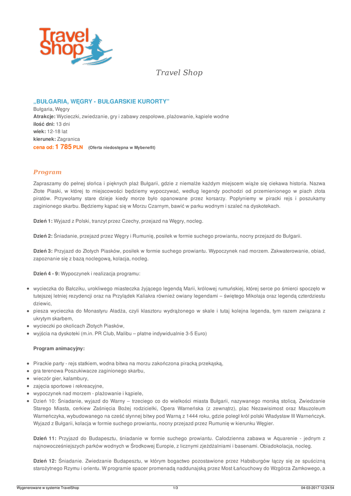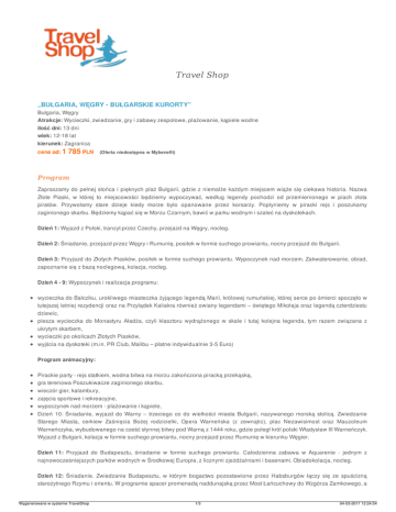Travel Shop „BUŁGARIA, WĘGRY - BUŁGARSKIE KURORTY” Bułgaria, Węgry Atrakcje: Wycieczki, zwiedzanie, gry i zabawy zespołowe, plażowanie, kąpiele wodne ilość dni: 13 dni wiek: 12-18 lat kierunek: Zagranica cena od: 1 785 PLN (Oferta niedostępna w Mybenefit) Program Zapraszamy do pełnej słońca i pięknych plaż Bułgarii, gdzie z niemalże każdym miejscem wiąże się ciekawa historia. Nazwa Złote Piaski, w której to miejscowości będziemy wypoczywać, według legendy pochodzi od przemienionego w piach złota piratów. Przywołamy stare dzieje kiedy morze było opanowane przez korsarzy. Popłyniemy w piracki rejs i poszukamy zaginionego skarbu. Będziemy kąpać się w Morzu Czarnym, bawić w parku wodnym i szaleć na dyskotekach. Dzień 1: Wyjazd z Polski, tranzyt przez Czechy, przejazd na Węgry, nocleg. Dzień 2: Śniadanie, przejazd przez Węgry i Rumunię, posiłek w formie suchego prowiantu, nocny przejazd do Bułgarii. Dzień 3: Przyjazd do Złotych Piasków, posiłek w formie suchego prowiantu. Wypoczynek nad morzem. Zakwaterowanie, obiad, zapoznanie się z bazą noclegową, kolacja, nocleg. Dzień 4 - 9: Wypoczynek i realizacja programu: wycieczka do Bałcziku, urokliwego miasteczka żyjącego legendą Marii, królowej rumuńskiej, której serce po śmierci spoczęło w tutejszej letniej rezydencji oraz na Przylądek Kaliakra również owiany legendami – świętego Mikołaja oraz legendą czterdziestu dziewic, piesza wycieczka do Monastyru Aładża, czyli klasztoru wydrążonego w skale i tutaj kolejna legenda, tym razem związana z ukrytym skarbem, wycieczki po okolicach Złotych Piasków, wyjścia na dyskoteki (m.in. PR Club, Malibu – płatne indywidualnie 3-5 Euro) Program animacyjny: Pirackie party - rejs statkiem, wodna bitwa na morzu zakończona piracką przekąską, gra terenowa Poszukiwacze zaginionego skarbu, wieczór gier, kalambury, zajęcia sportowe i rekreacyjne, wypoczynek nad morzem - plażowanie i kąpiele, Dzień 10: Śniadanie, wyjazd do Warny – trzeciego co do wielkości miasta Bułgarii, nazywanego morską stolicą. Zwiedzanie Starego Miasta, cerkiew Zaśnięcia Bożej rodzicielki, Opera Warneńska (z zewnątrz), plac Nezawisimost oraz Mauzoleum Warneńczyka, wybudowanego na cześć słynnej bitwy pod Warną z 1444 roku, gdzie poległ król polski Władysław III Warneńczyk. Wyjazd z Bułgarii, kolacja w formie suchego prowiantu, nocny przejazd przez Rumunię w kierunku Węgier. Dzień 11: Przyjazd do Budapesztu, śniadanie w formie suchego prowiantu. Całodzienna zabawa w Aquarenie - jednym z najnowocześniejszych parków wodnych w Środkowej Europie, z licznymi zjeżdżalniami i basenami. Obiadokolacja, nocleg. Dzień 12: Śniadanie. Zwiedzanie Budapesztu, w którym bogactwo pozostawione przez Habsburgów łączy się ze spuścizną starożytnego Rzymu i orientu. W programie spacer promenadą naddunajską przez Most Łańcuchowy do Wzgórza Zamkowego, a Wygenerowane w systemie TravelShop 1/3 04-03-2017 12:24:54 tutaj zabytki Plac św. Trójcy, Baszta Rybacka, kościół Macieja, Zamek Królewski. Plac bohaterów z imponujących rozmiarów pomnikiem przedstawiającym przywódców państwa. Wzgórze Gellérta – Cytadela z Pomnikiem Wolności i niezwykłym widokiem na Budę i Peszt. Dodatkowa obiadokolacja w Budapeszcie, nocny przejazd do Polski. Dzień 13: Zakończenie obozu. Zakwaterowanie Zakwaterowanie: Hotel SERDIKA ***+ w Złotych Piaskach (lub inny o podobnym standardzie) w trakcie pobytu, pokoje 3, 4, 5 i 6-osobowe z łazienkami i klimatyzacją. Położony ok. 400 m od morza. Na terenie obiektu: basen z mini parkiem wodnym, restauracja, bar, sala TV. Podczas noclegów tranzytowych hotele** i ***. Wyżywienie: Podczas pobytu w Złotych Piaskach wersja All inclusive - 3 posiłki dziennie w formie bufetu: śniadania, obiady, kolacje. Dodatkowo pomiędzy posiłkami przekąski m. in. ciasta, owoce, naleśniki. Napoje dostępne przez cały dzień. Pierwsze świadczenie - obiad, ostatnie - śniadanie. Wyżywienie w pozostałe dni - patrz program. Dojazd Białystok 170.00 PLN Bydgoszcz Gdynia 150.00 PLN Gliwice Grudziądz 130.00 PLN Głogów Kalisz 100.00 PLN Kraków 140.00 PLN Lubin 100.00 PLN Olsztyn Ostrów Wielkopolski 100.00 PLN Piła 140.00 PLN Poznań Stargard 130.00 PLN Szczecin 140.00 PLN Szczecinek Tczew 140.00 PLN Toruń 130.00 PLN Warszawa Wrocław 140.00 PLN Zielona Góra Wrocław Łowicz 0.00 PLN 0.00 PLN Elbląg 120.00 PLN Gniezno 100.00 PLN Jarocin Katowice 130.00 PLN Konin Kłodzko 90.00 PLN Legnica 50.00 PLN Opole Gdańsk 150.00 PLN 90.00 PLN Gorzów Wielkopolski 110.00 PLN 90.00 PLN Jelenia Góra 150.00 PLN 120.00 PLN koszalin 180.00 PLN 90.00 PLN Leszno 90.00 PLN Ostróda 100.00 PLN 0.00 PLN Rawicz 70.00 PLN 130.00 PLN Słupsk 180.00 PLN 140.00 PLN Wałbrzych 150.00 PLN 140.00 PLN Łódź 140.00 PLN 140.00 PLN 0.00 PLN 140.00 PLN Autokar turystyczny obsługiwany przez 2 kierowców (klimatyzacja, WC, barek, DVD). Na trasach antenowych pociąg lub mikrobus. Ceny, terminy i informacje Terminy i ceny: 1 2017-07-08 - 2017-07-20 1 785 PLN 2 2017-07-15 - 2017-07-27 1 785 PLN 3 2017-07-22 - 2017-08-03 1 785 PLN 4 2017-07-29 - 2017-08-10 1 785 PLN Cena zawiera: 8 noclegów, wyżywienie, ubezpieczenie, realizacja programu, transport, opieka wychowawców. Cena nie zawiera: Transportu. Wycieczek fakultatywnych. Wydatki programowe Wstępy (m.in. Muzeum Warneńczyka, Park Wodny Aquaarena, Pirackie Party), przewodnicy, opłata klimatyczna, dodatkowy posiłek w Budapeszcie - około 65 euro. Wydatki programowe są obligatoryjne i opłacane indywidualnie przez uczestników obozu. Propozycje fakultatywne Wygenerowane w systemie TravelShop 2/3 04-03-2017 12:24:54 realizowane przy min. 15 uczestnikach (deklarację uczestnictwa w imprezie fakultatywnej należy zgłosić przy podpisywaniu umowy, płatność w autokarze u kierownika obozu): - Jeep Safari– niezapomniane wrażenia pełne zakrętów i energicznych podjazdów. Tylko dla p