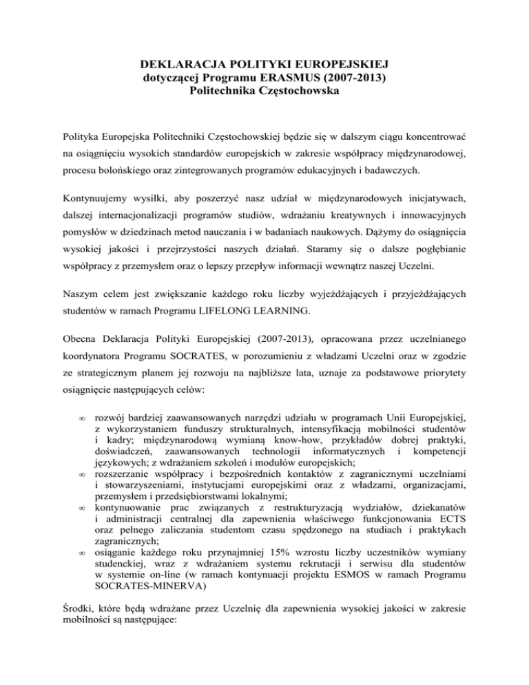 Obecna Deklaracja Polityki Europejskiej (2007-2013), opracowana przez uczelnianego