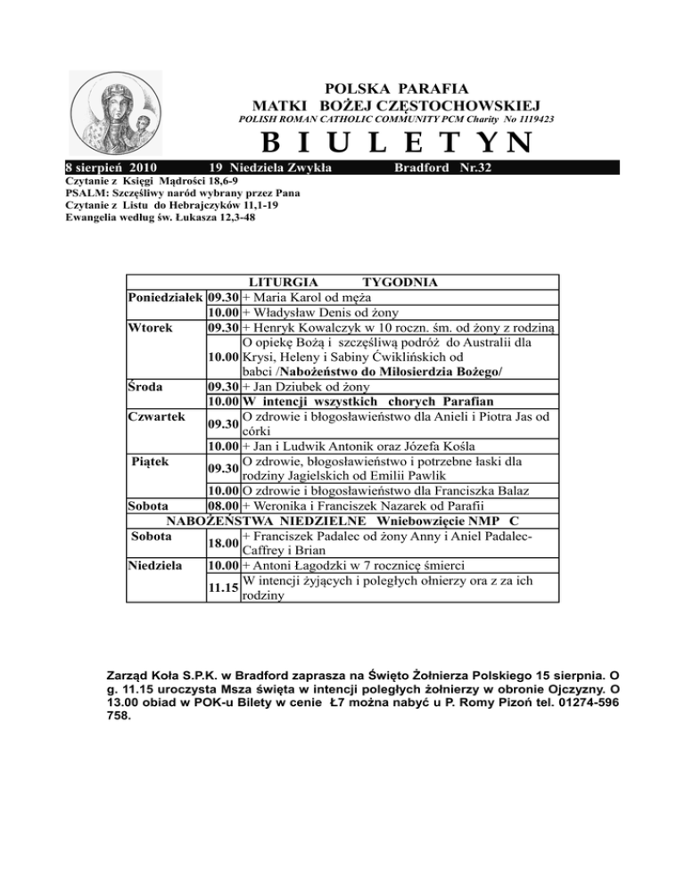 POLSKA PARAFIA MATKI BOŻEJ CZĘSTOCHOWSKIEJ POLISH ROMAN CATHOLIC COMMUNITY PCM Charity No 1119423 B I U L E T YN 8 sierpień 2010 19 Niedziela Zwykła Bradford Nr.32 Czytanie z Księgi Mądrości 18,6-9 PSALM: Szczęśliwy naród wybrany przez Pana Czytanie z Listu do Hebrajczyków 11,1-19 Ewangelia według św. Łukasza 12,3-48 LITURGIA TYGODNIA Poniedziałek 09.30 + Maria Karol od męża 10.00 + Władysław Denis od żony Wtorek 09.30 + Henryk Kowalczyk w 10 roczn. śm. od żony z rodziną O opiekę Bożą i szczęśliwą podróż do Australii dla 10.00 Krysi, Heleny i Sabiny Ćwiklińskich od babci /Nabożeństwo do Miłosierdzia Bożego/ Środa 09.30 + Jan Dziubek od żony 10.00 W intencji wszystkich chorych Parafian Czwartek O zdrowie i błogosławieństwo dla Anieli i Piotra Jas od 09.30 córki 10.00 + Jan i Ludwik Antonik oraz Józefa Kośla Piątek O zdrowie, błogosławieństwo i potrzebne łaski dla 09.30 rodziny Jagielskich od Emilii Pawlik 10.00 O zdrowie i błogosławieństwo dla Franciszka Balaz Sobota 08.00 + Weronika i Franciszek Nazarek od Parafii NABOŻEŃSTWA NIEDZIELNE Wniebowzięcie NMP C Sobota + Franciszek Padalec od żony Anny i Aniel Padalec18.00 Caffrey i Brian Niedziela 10.00 + Antoni Łagodzki w 7 rocznicę śmierci W intencji żyjących i poległych ołnierzy ora z za ich 11.15 rodziny Zarząd Koła S.P.K. w Bradford zaprasza na Święto Żołnierza Polskiego 15 sierpnia. O g. 11.15 uroczysta Msza święta w intencji poległych żołnierzy w obronie Ojczyzny. O 13.00 obiad w POK-u Bilety w cenie Ł7 można nabyć u P. Romy Pizoń tel. 01274-596 758. Lektorzy - Sobota 14.08.2010 g.18.00 - E. Pniewska Niedziela 15.08.2010 g. 10.00 - J. Nowicki g. 11.15 – S.Weteranów Dyżur przedstawiciela PRD Sali św. Brata Alberta, sobota i niedziela 14-15.08.2010R. Taylor i E. Pniewska OFIARY Na potrzeby kościoła – Klasy Callana £ 600; S.Weteranów £ 150; Anna J. £ 20: A. Miller £10; Częstochowski £10; S.Krauz £20; S. Reiman £15; Na kwiaty – A.Miller £ 10; Częstochowski £10; B. Koza £40; M. Żurek £10; Cz. Maniak £30. Gift Aid 04.07.2010 - £ 33.50 Druga taca dla potrzeb Parafii 01.08.2010 - £ 214.29 Jeżeli ktoś z Parafian pragnie złożyć ofiarę czekiem/na dowolny cel parafialny/, prosimy go wypisać na –L.P.C.M. BRADFORD. Wszystkim ofiarodawcom składamy serdeczne podziękowanie za złożone ofiary na nasze cele parafialne. Bóg zapłać. *** OGŁOSZENIA DUSZPASTERSKIE *** 1. W dzisiejszej Ewangelii uczta Eucharystyczna została porównana do uczty weselnej. Ogrom daru, jaki otrzymujemy za każdym razem przystępując do ołtarza Pańskiego, jest tak wielki, że trzeba nań patrzeć w taki właśnie sposób, ciągle też napełniając nasze serce wdzięcznością Bogu. 2. Z wielu miast Polski wyruszyły już pielgrzymki na Jasną Górę. Zechciejmy towarzyszyć wszystkim naszą gorącą modlitwą w ich intencji. 3. W przyszłą niedzielę obchodzić będziemy uroczystość Wniebowzięcia Najświętszej Maryi Panny. Zgodnie z naszą tradycją na wszystkich Mszach Świętych pobłogosławimy kwiaty, zioła i zboża. W najbliższym tygodniu w kalendarzu liturgicznym przypadają: w poniedziałek, 9 sierpnia, święto świętej Teresy Benedykty od Krzyża, filozofa, karmelitanki, nawróconej na chrześcijaństwo w wieku 30 lat. Oddała swoje życie w obozie w Auschwitz. Jest Patronką Europy. Prośmy, by święta ta wyprosiła duchowe odrodzenie Starego Kontynentu we wtorek, 10 sierpnia – świętego Wawrzyńca, diakona Kościoła rzym. w środę, 11 sierpnia, świętej Klary, założycielki zakonu żeńskiego opartego na regule świętego Franciszka w sobotę, 14 sierpnia –świętego Maksymiliana Kolbe, męczennika obozu w Auschwitz, który oddał życie za współwięźnia. * W sobotę 11 września S. Weteranów organizuje wyjazd na uroczystości do Arboretum w pierwszą rocznicę odsłonięcia pomnika Polskich Sił Zbrojnych, ilość miejsc ograniczona, prosimy o zgłoszenia do 31 sierpnia. Koszt przejazdu ze wstępem Ł 13. Zgłoszenia do P. Romy Pizoń tel. 01274-596 758. Wyjazd z parkingu Klubu S.P.K. o g.8.00. * W czwartek 23 września wyjazd pod pomnik polskich lotników do Bradley Forge, gdzie zginęło siedmiu polskich pilotów w 1943 roku. Na uroczystości zostaną wręczone odznaczenia dla obu panów w formie „Pro Memoria” , przez Konsula z Manchester. Koszt przejazdu Ł5. Prosimy o zgłoszenia do P. Romy Pizoń. Do 31 sierpnia. Wyjazd z parkingu Klubu S.P.K. o g.10.00. Serdecznie zapraszamy. Środa - Nie ma zajęć Day Centre, następne spotkanie 25 sierpnia. Piątek - Nie ma zajęć Day Centre, następne spotkanie 27 sierpnia. Lekcje Callana: Kontakt:Krystyna Trybuła tel.0788 7847 935. Następne lekcje: wtorek 7.09.2010 o 17.30 i 18.30. Oraz :14,16,21,23,28,30 września 2010: 5,7,12,14,19,21.październka 2010: 2,4,9,11,16,18,23,25,30 listopada 2010: 2,7,9,14,16 grudnia 2010. Przygotowujący się do sakramentu małżeństwa mogą uczestniczyć w specjalnych katechezach dla narzeczonych i uzyskać dyplom ukończenia kursu. Prosimy o zapisy. Wszystkich naszych Rodaków, którzy chcą należeć do naszej Parafii serdecznie zapraszamy i prosimy o wypełnienie przygotowanego formularza i zwrócenie go duszpasterzowi. POCHYLENI NAD EWANGELIĄ - Czuwajcie. Dzisiejsza Ewangelia wspomina o gospodarzu, który po powrocie z uczty zastał służbę wyczekującą go. W odpowiedzi na wierne wypełnienie obowiązków przygotowuje dla nich niespodziankę: sadza ich za stołem, a sam usługuje. Nie jest to typowe zachowanie gospodarza w stosunku do sług, ale jest to gest jego serca. Cała prawda dotycząca dzisiejszej Ewangelii zawarta jest w postawie czujnego oczekiwania. Oczywiście oczekiwanym gospodarzem jest sam Chrystus, który powtórne przybędzie. Ewangelista podkreśla, że nikt nie ma pewności co do godziny przyjścia Pana. To wydarzenie może nastąpić wcześniej niż się spodziewamy. Dlatego naszą odpowiedzią powinna być s
